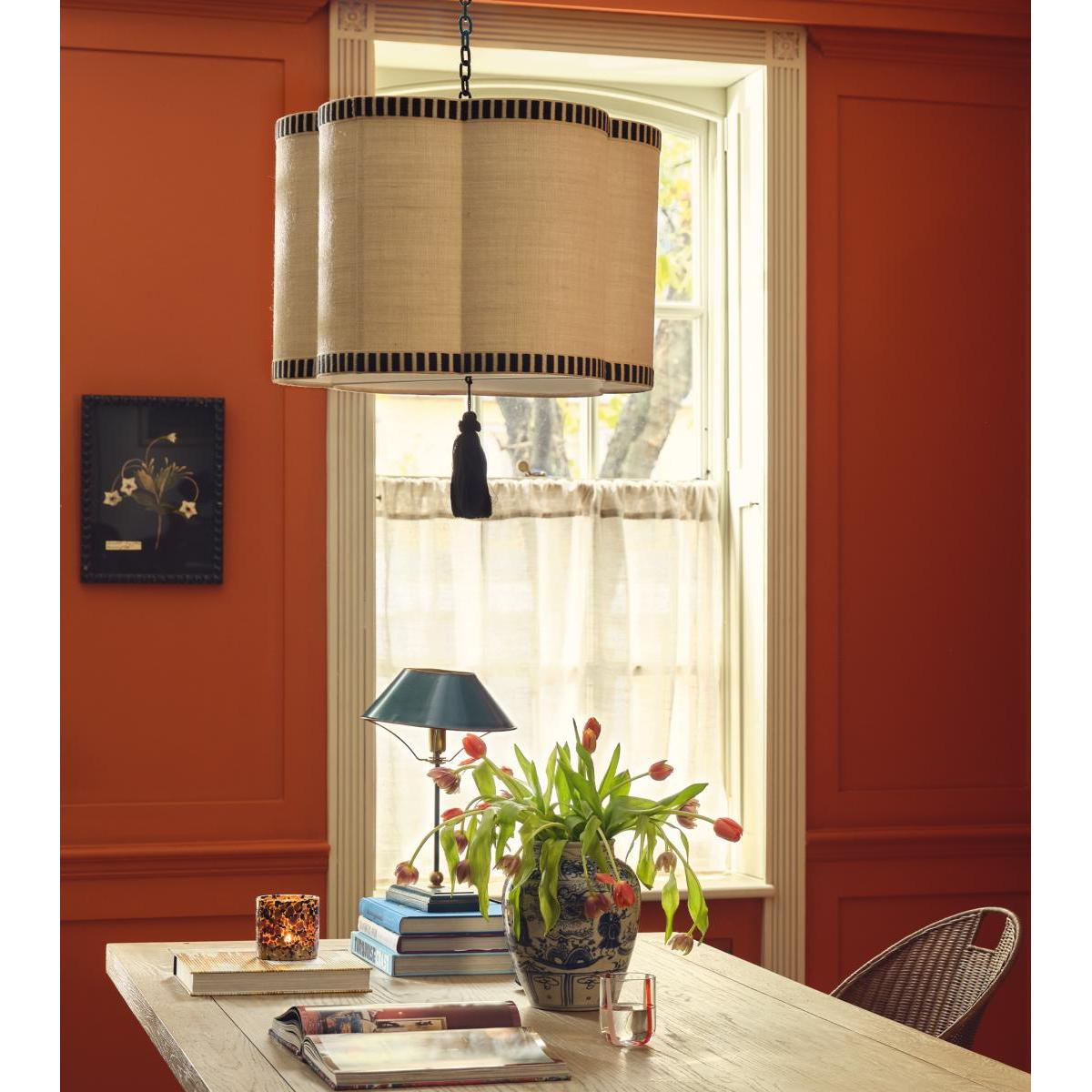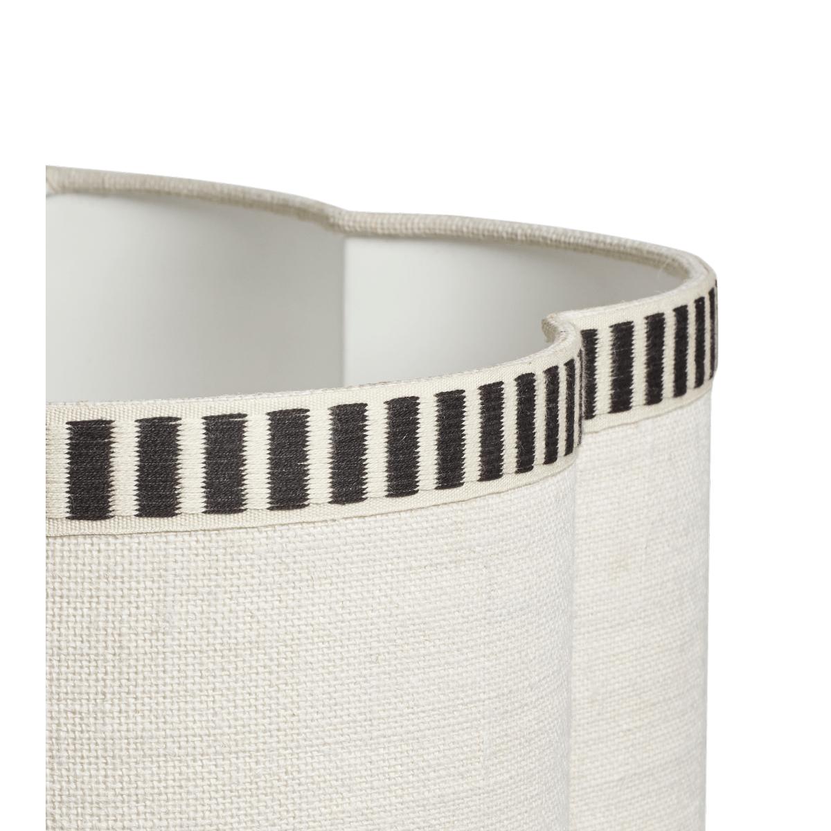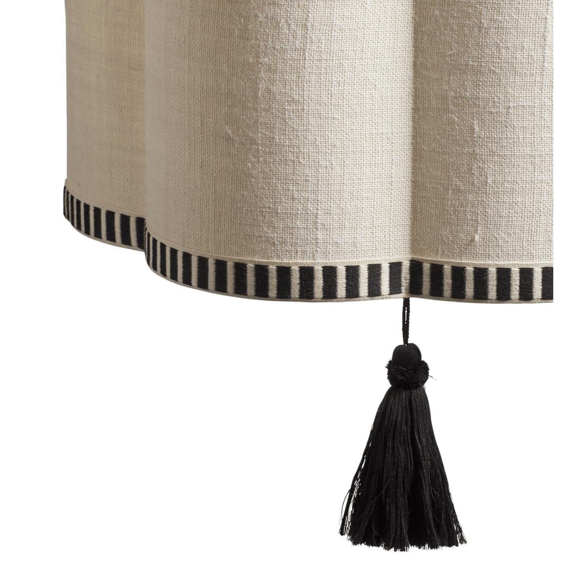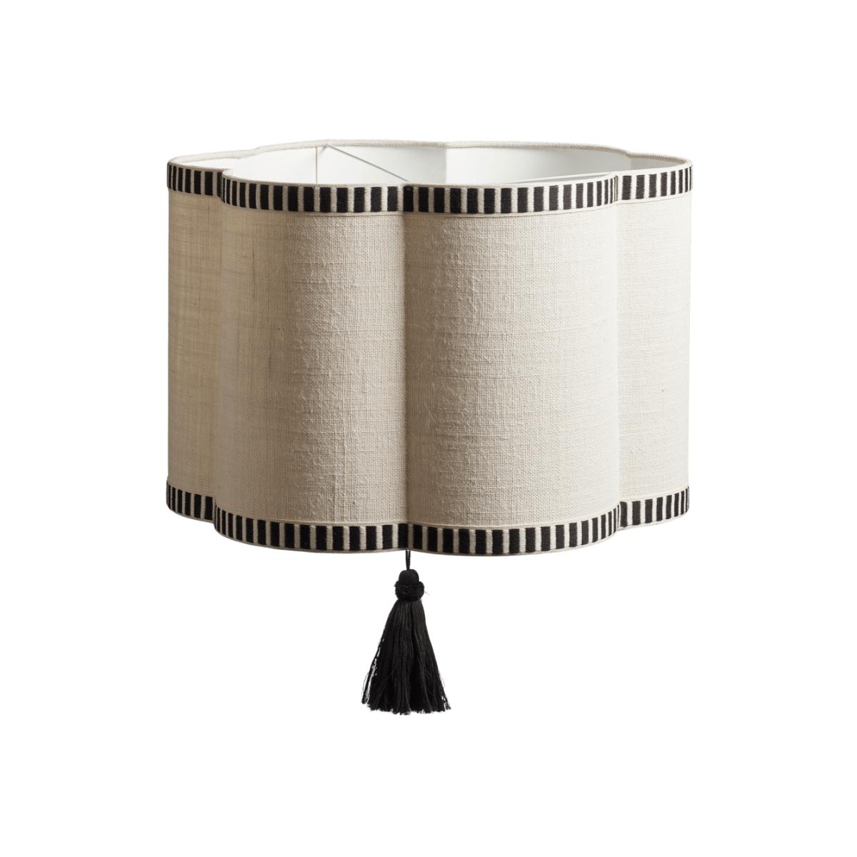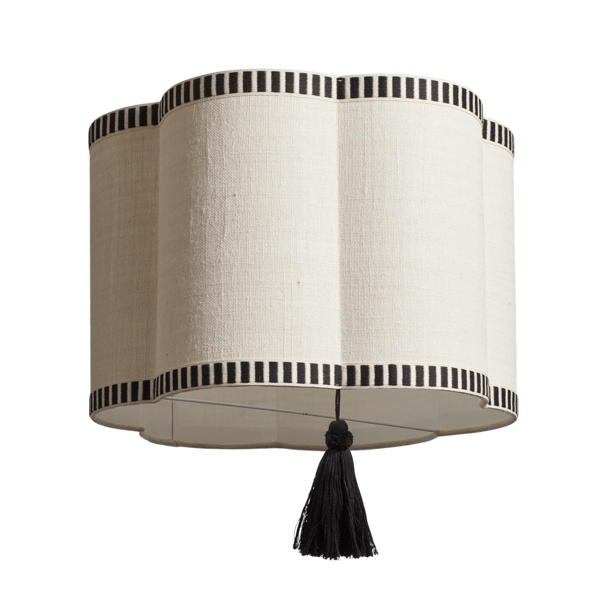 The six-petalled shape of our Asphodel Lampshade is handmade from an iron wire frame, covered in dyed jute and finished with a black and white striped trim. Jute is a natural fibre that will vary in thickness and texture leading to the formation of slubs; naturally occurring marks within the fibre. These natural characteristics add to the charm of each piece. Designed to hang from your ceiling, the contrasting colours bring drama to the large shade, while a black tassel that hangs from its centre adds a touch of glamour.