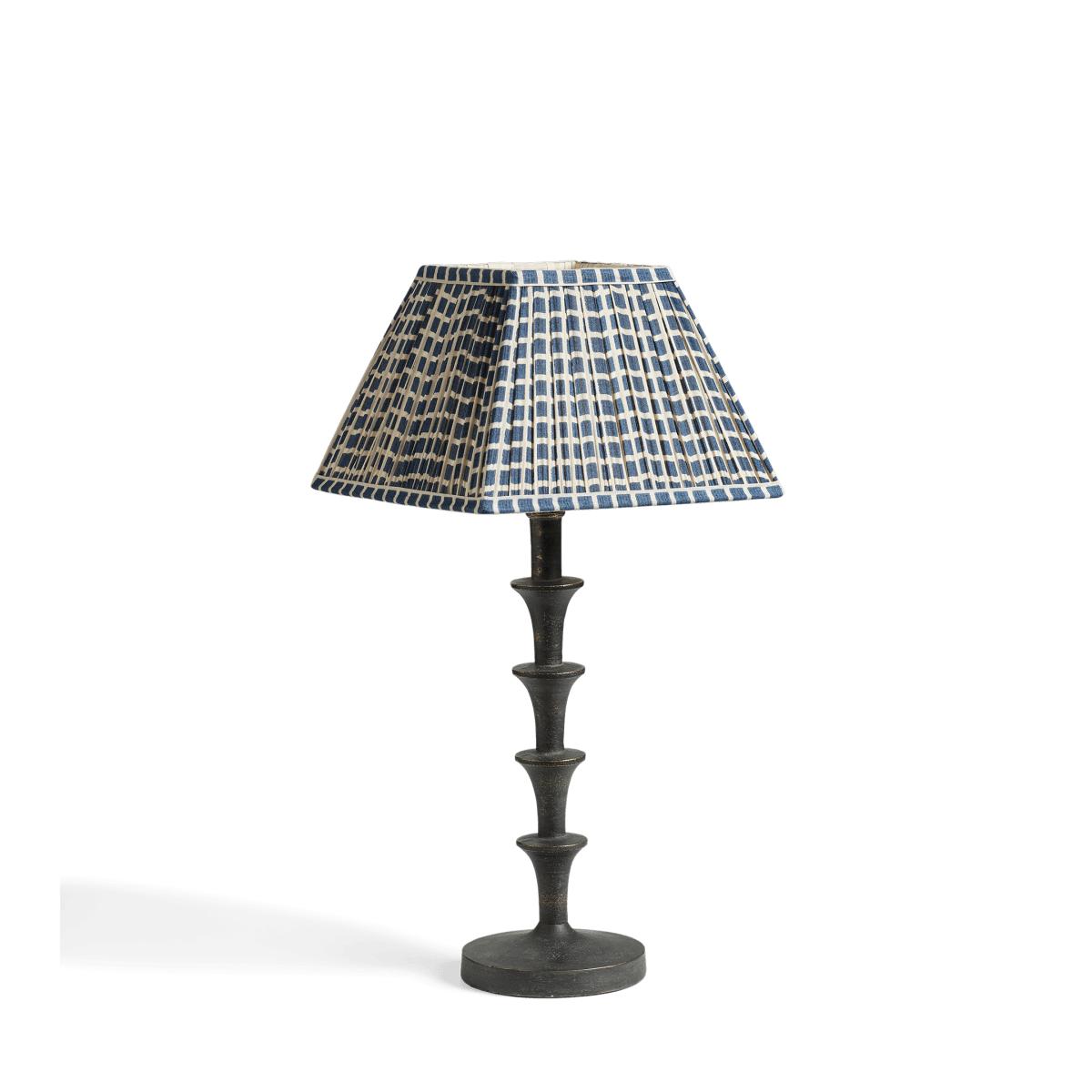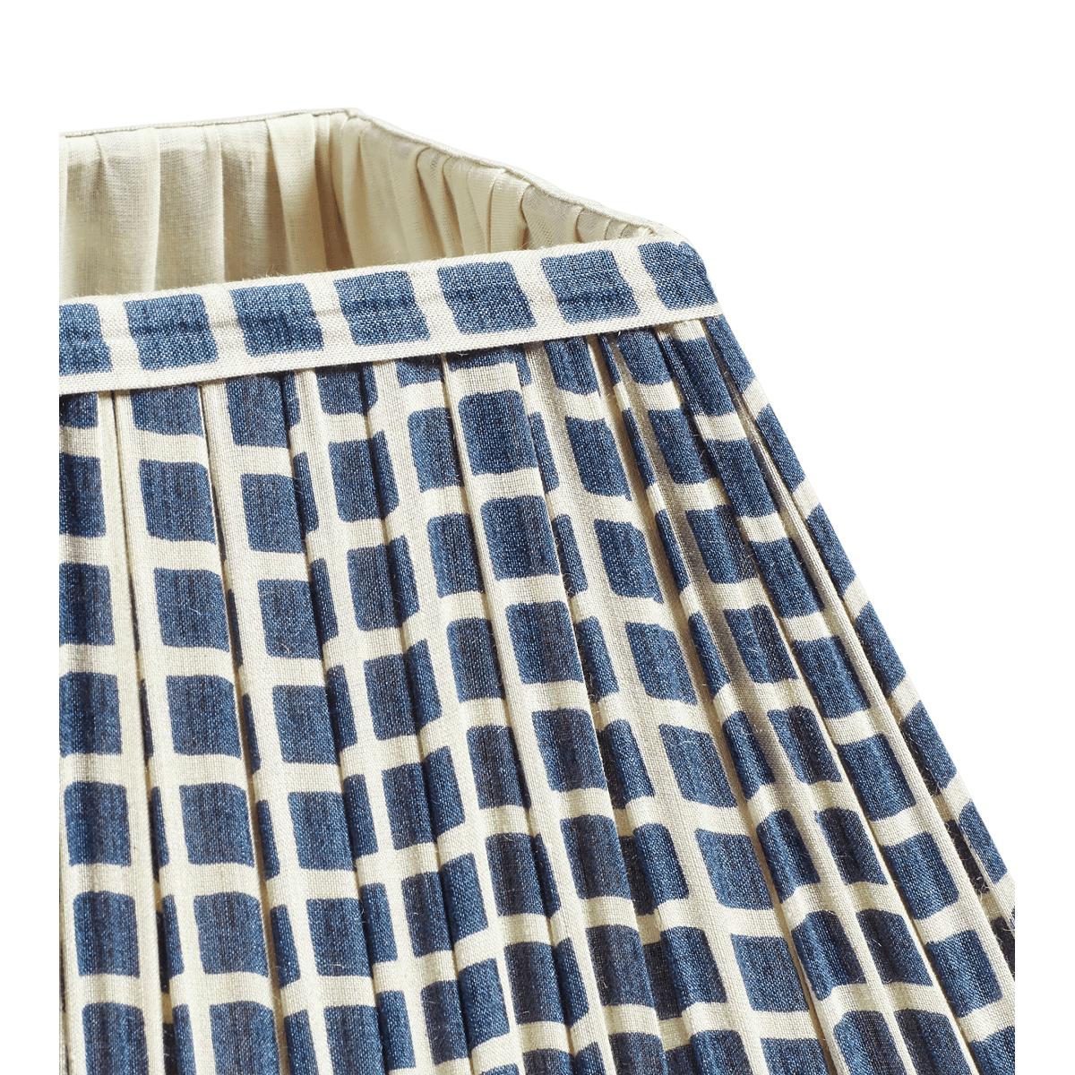 The Avalon is a welcome addition to our square-shaped lampshades. Its silk ground, featuring a blue and white checked pattern, is gathered around a handmade iron frame and lined with cream cotton for a soft glow.
