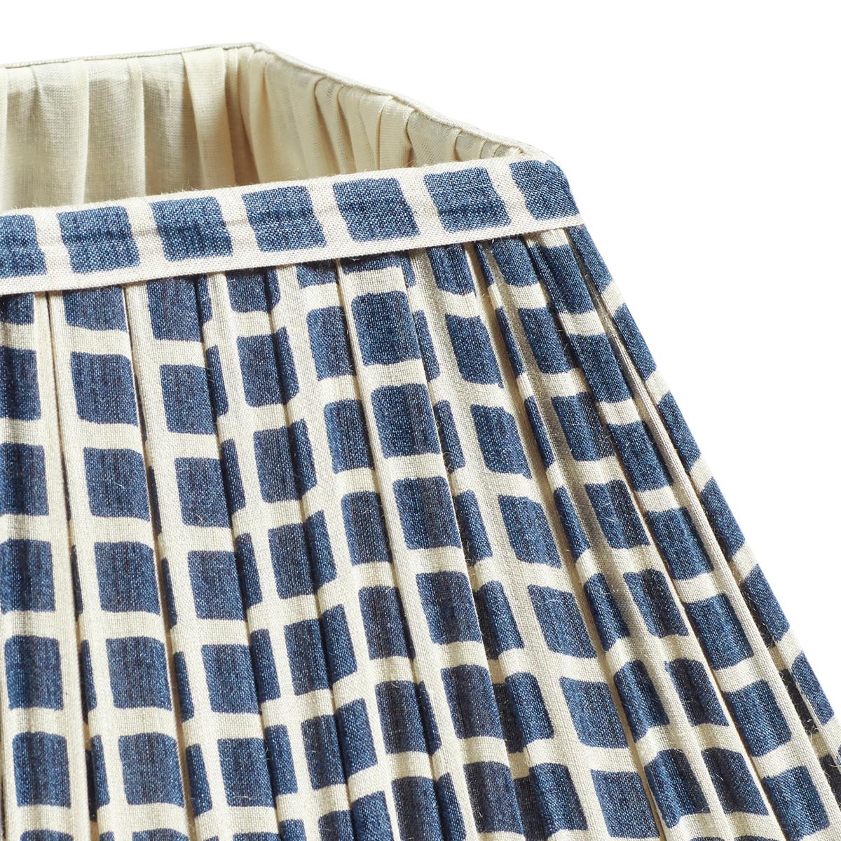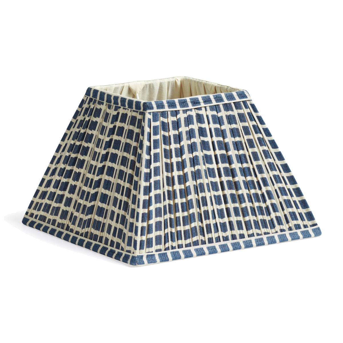 The Avalon is a welcome addition to our square-shaped lampshades. Its silk ground, featuring a blue and white checked pattern, is gathered around a handmade iron frame and lined with cream cotton for a soft glow.