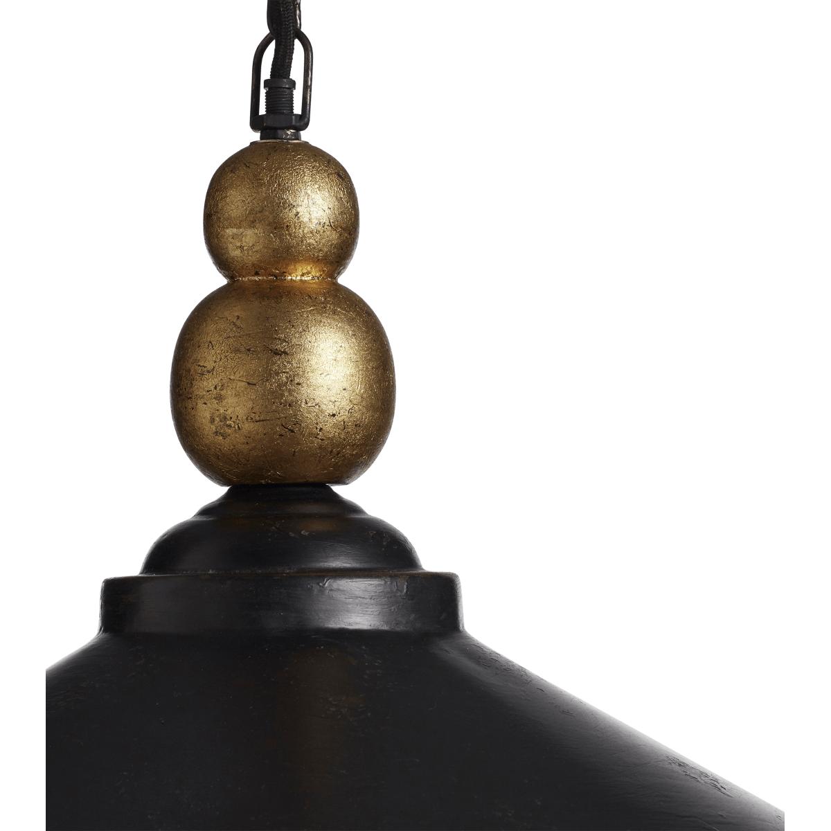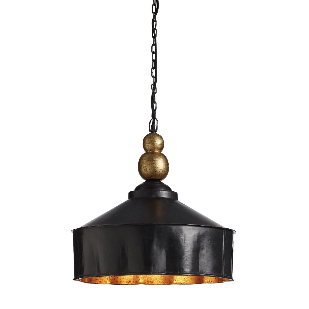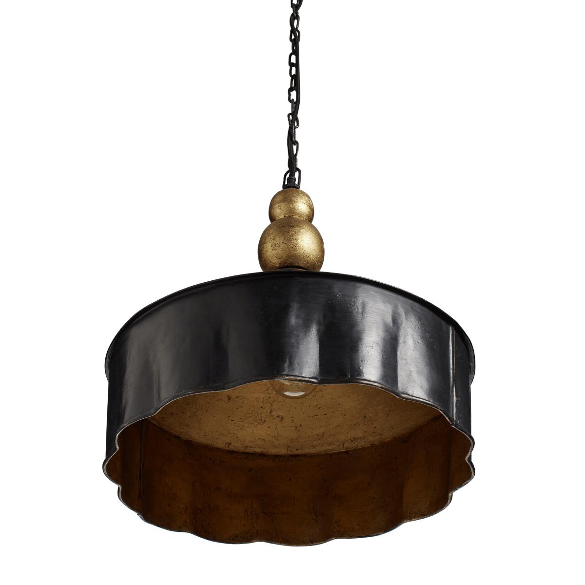 The Ayla’s name was chosen for the many natural and shining influences of the pendant light, with its Hebrew meaning translating to ‘oak tree’, and its Turkish translation being ‘a circle of light around the sun or moon’. Its playfully large round shape is cut and welded from a sheet of iron by skilled artisans, then finished with a charming scalloped edge that softens its metallic form and its contemporary black and gold tones. To achieve the colouring, the metal is sanded for a smooth surface, then rustic colour is applied to the inside and outside before being varnished and foiled. The wooden finials at its top appear like jewellery beads, finished in gold for extra glamour. Due to the artisanal processes that craft this lamp, each piece has individual characteristics.