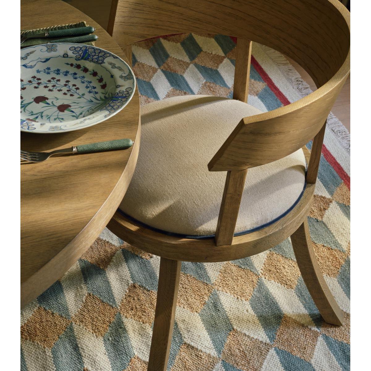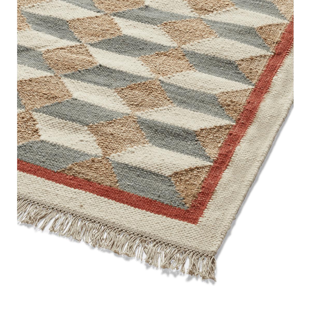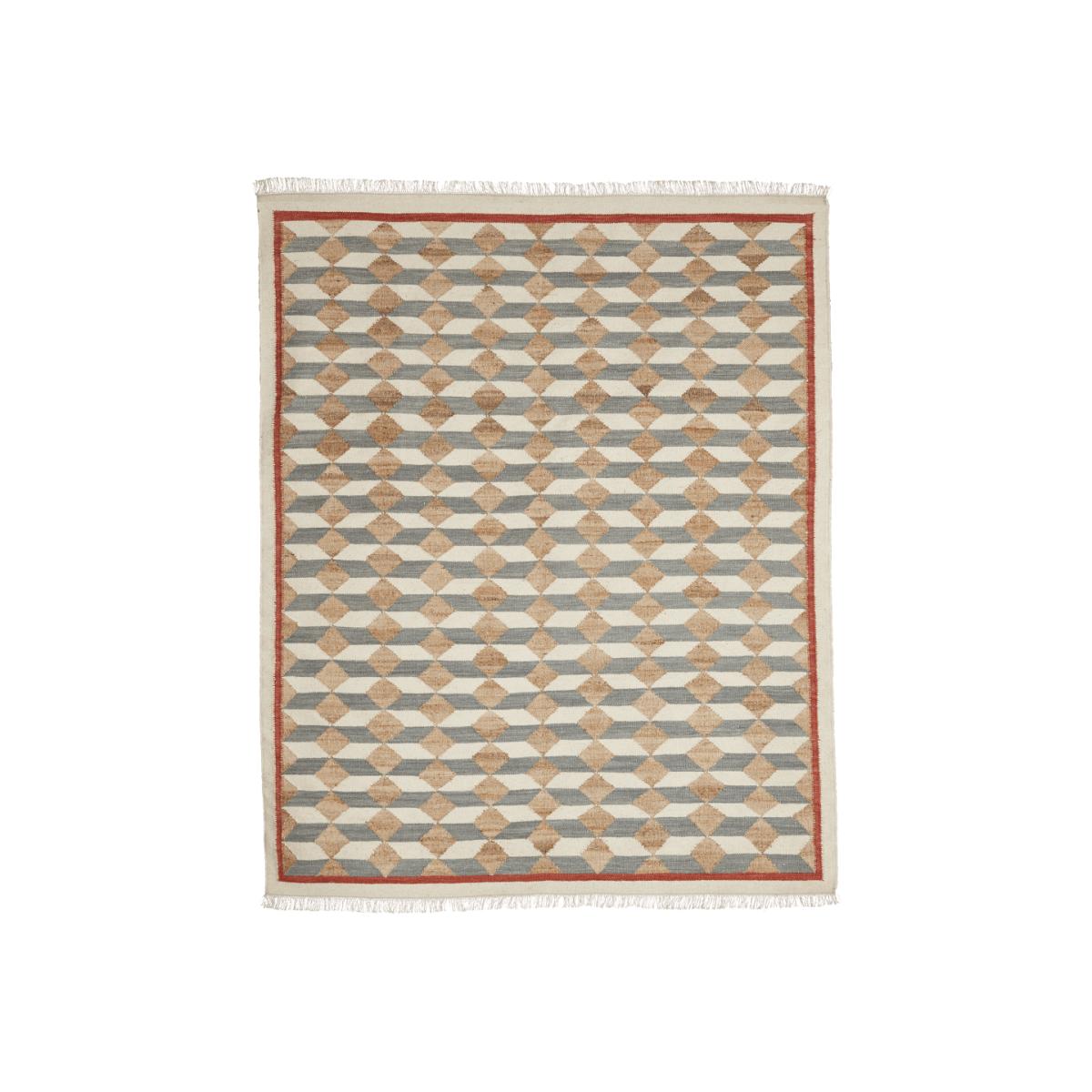 Our Bagha kilim rug features a geometric pattern of stripes and diamonds all neatly framed within a red border and finished with fringing at either end. The origins of kilims range from Balkan regions through to Northern Africa, which is what makes them complementary to so many design styles. Kilims differ from knotted rugs as they are interwoven from variously coloured wefts (horizontal yarns) and warps (vertical yarns) to create a flatwoven tapestry rug with no pile. They often have stepped, diagonal patterns which are formed through their distinct weaving technique in which the yarn turns around the warp where the colour changes, rather than running across the full width of the piece and they’re known for their vibrant colours and geometric patterns. The stripes and diamonds on the Bagha feature soft gradients of colour, celebrating the yarn dying process. The piece is handwoven by skilled artisans from jute and wool, with a cotton back. Due to the natural materials and artisanal craft process each piece will have individual characteristics that add to their charm.