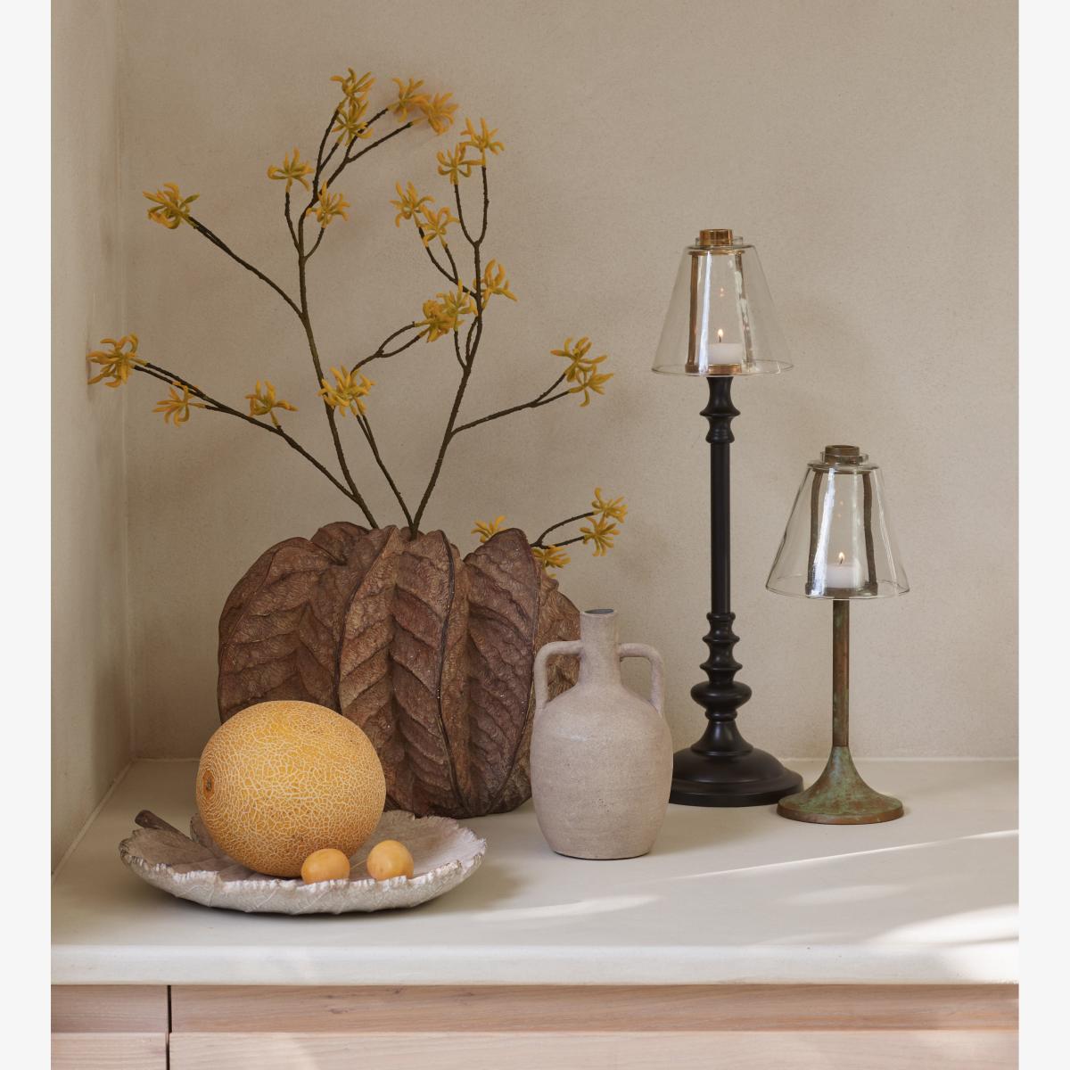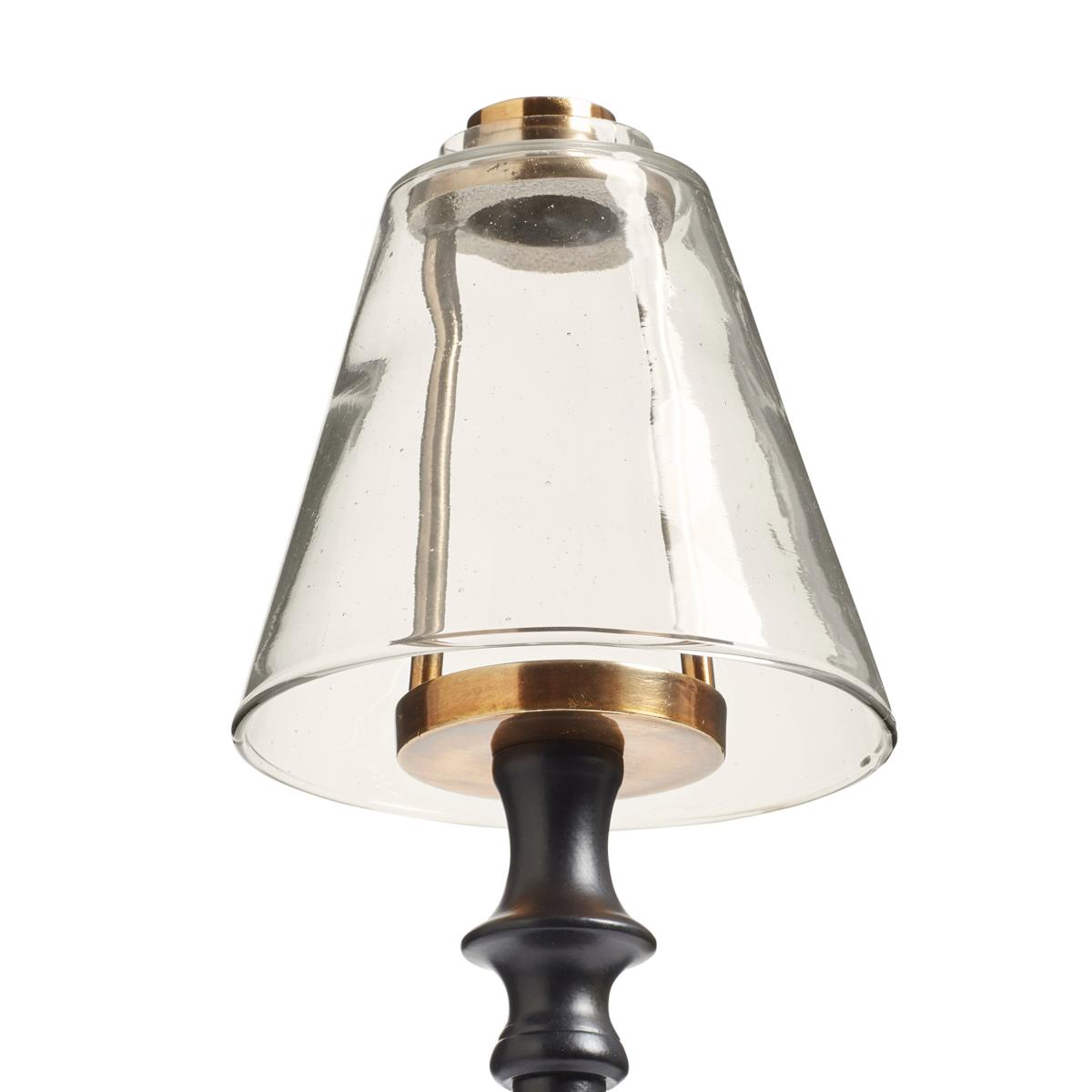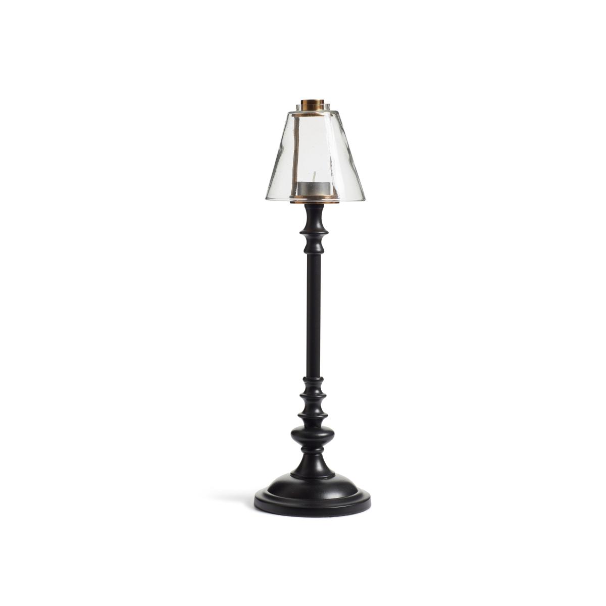 Our Barton Candle Holder has a classic feel with its ornate metal base that's sand casted to have a turned effect. This is an interesting process that involves incorporating the design pattern into sand, then filling the cavity left behind with molten metal which is left to cool before the sand mould is removed. The metal is finished in black for a smart look, complemented by a bronze-painted top. A mouth-blown glass shade protects the flickering flame of the candle, which means this piece also works well outdoors, as the shade shields the candle from any breeze.