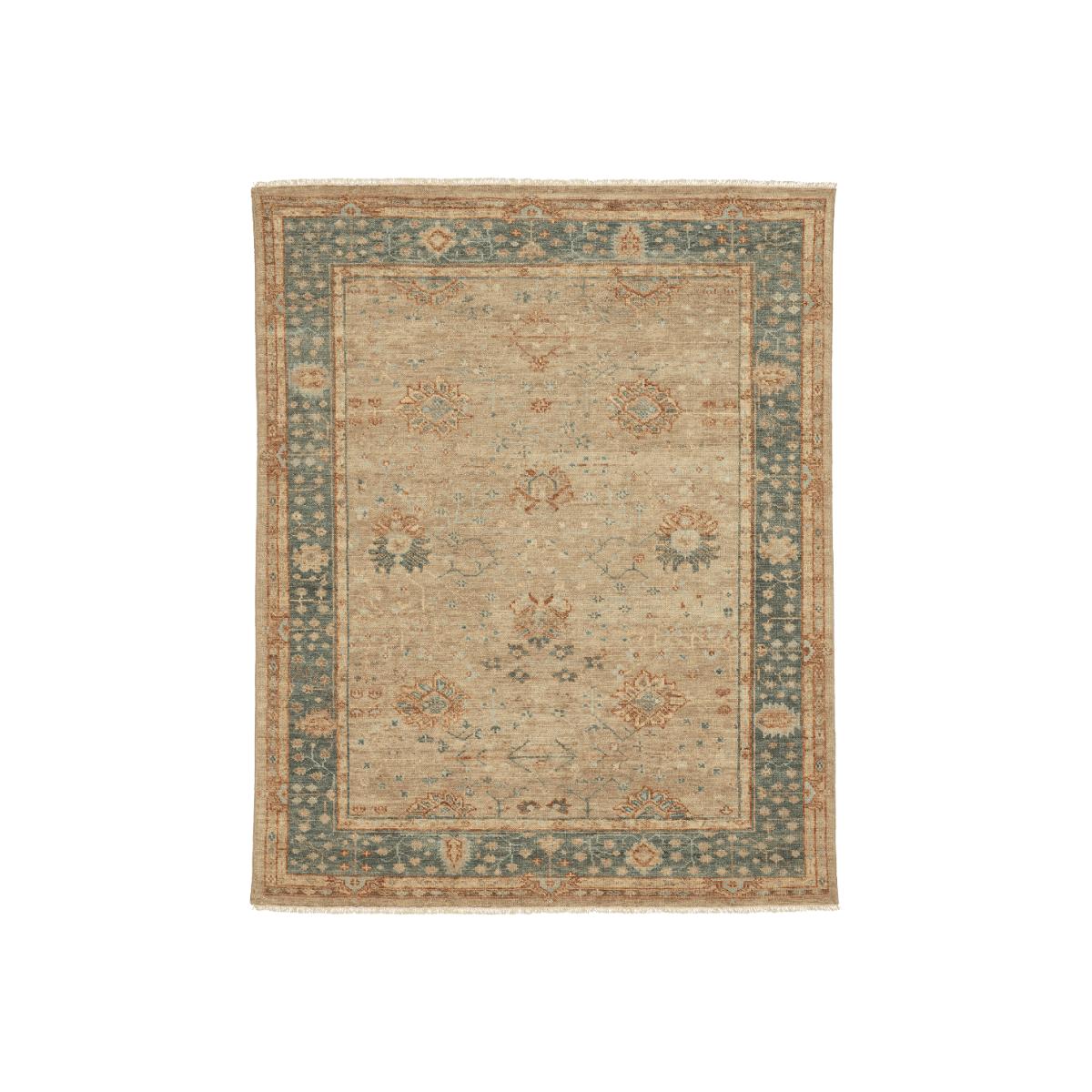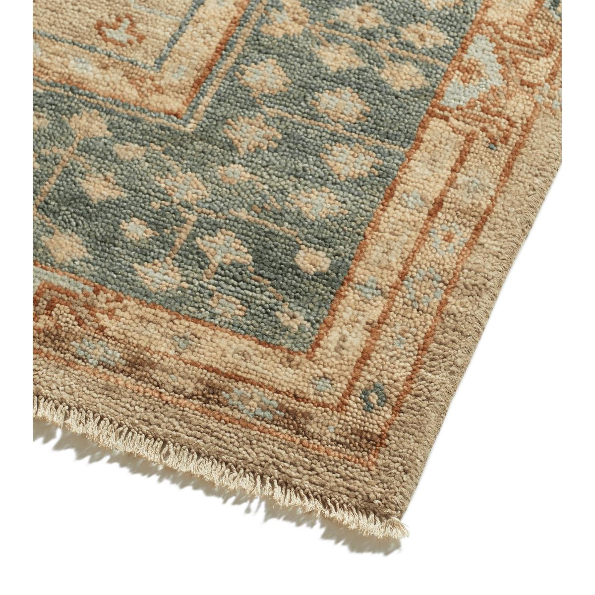 Our Berina is inspired by traditional Persian rugs, as seen in its abstract floral patterns and blue framed edge. The 100% cotton base is hand knotted on a loom with hand-spun wool. It takes skilled artisans 20-45 days to complete each piece, and the manual craft results in each rug having individual characteristics that add to its charm. This is the smaller rug of several available sizes.