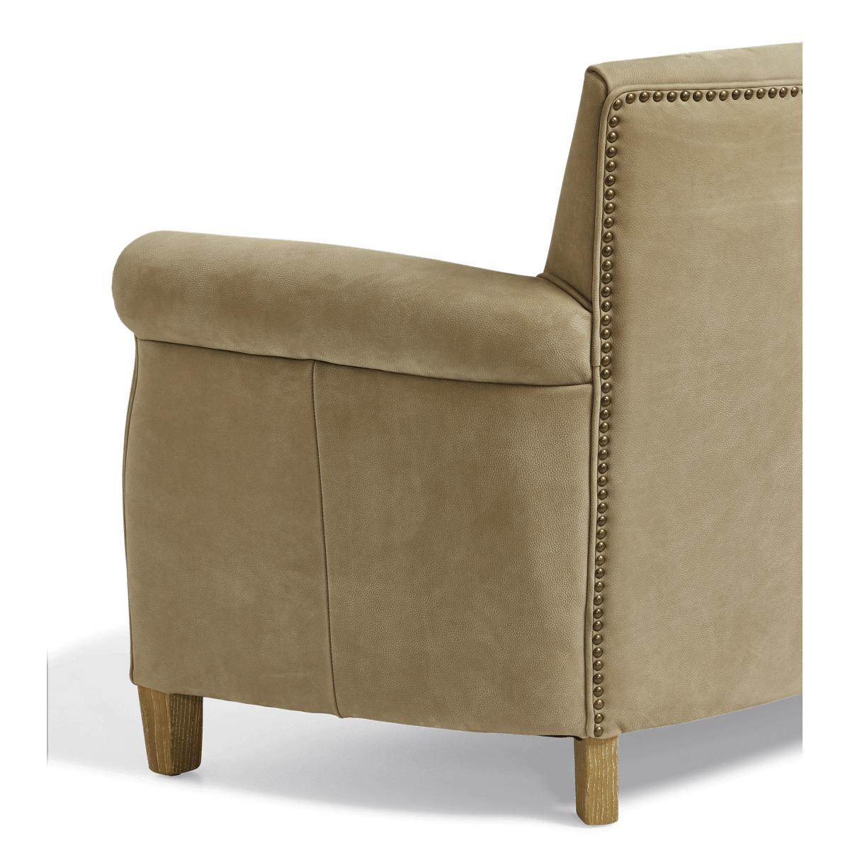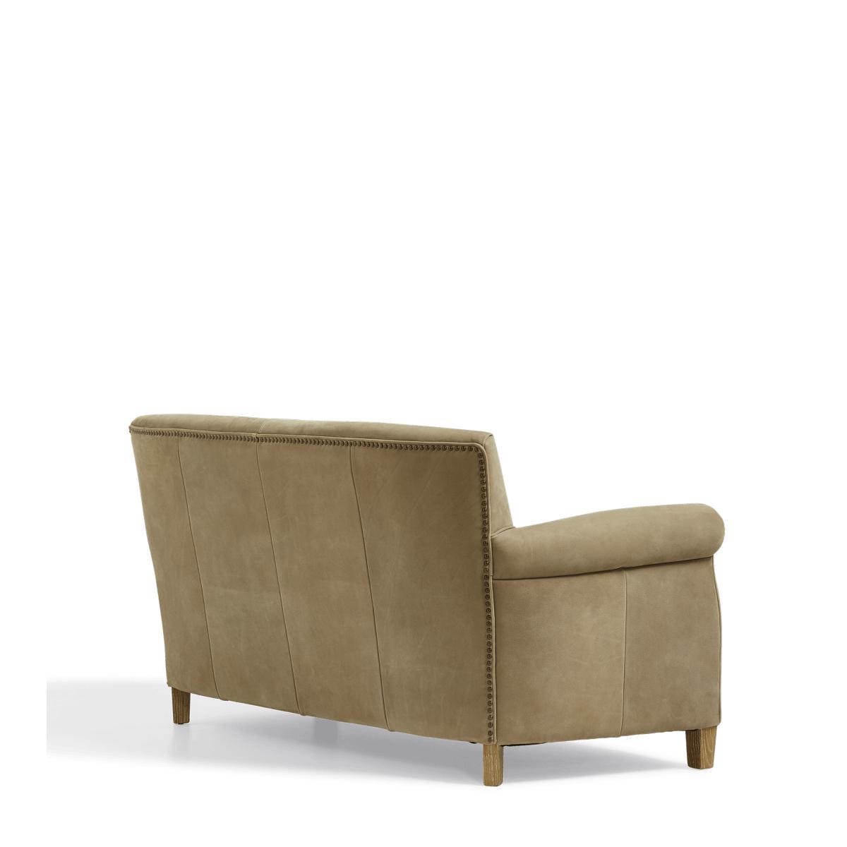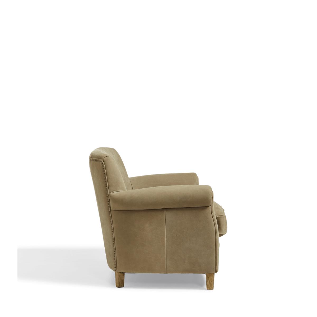 Originally designed as an armchair, this 1930s style sofa is upholstered in buttery-soft Pebble Grey top grain leather, with a silver-coloured studded border around its back and square ash feet. Crafted by hand, our Berstone delivers incomparable comfort thanks to its large fibre and feather-filled seat cushion, and like all good leathers will only look better with time.