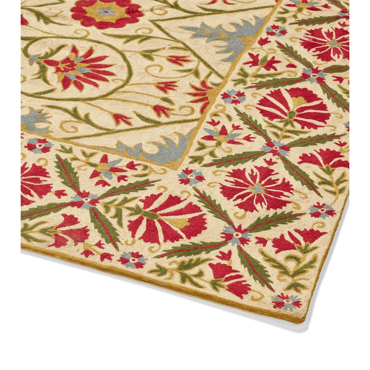 A stunning feature rug that faithfully references antique Turkish design. Pretty florals on a cream background will work in a sitting room, conservatory or bedroom. A chain stitch design in pure wool ensures warmth underfoot and a hardwearing finish.