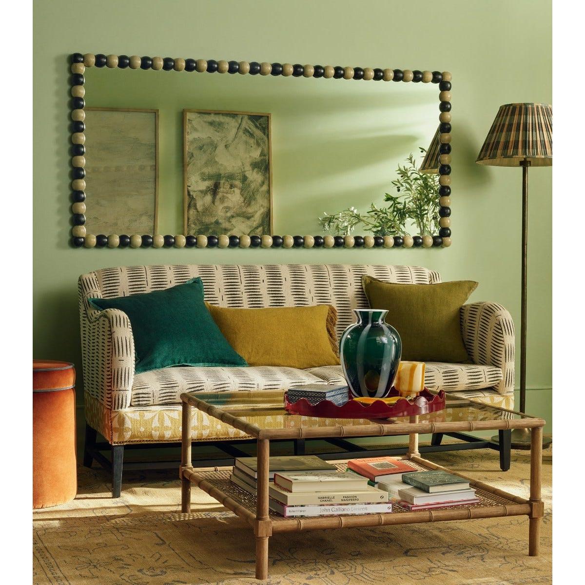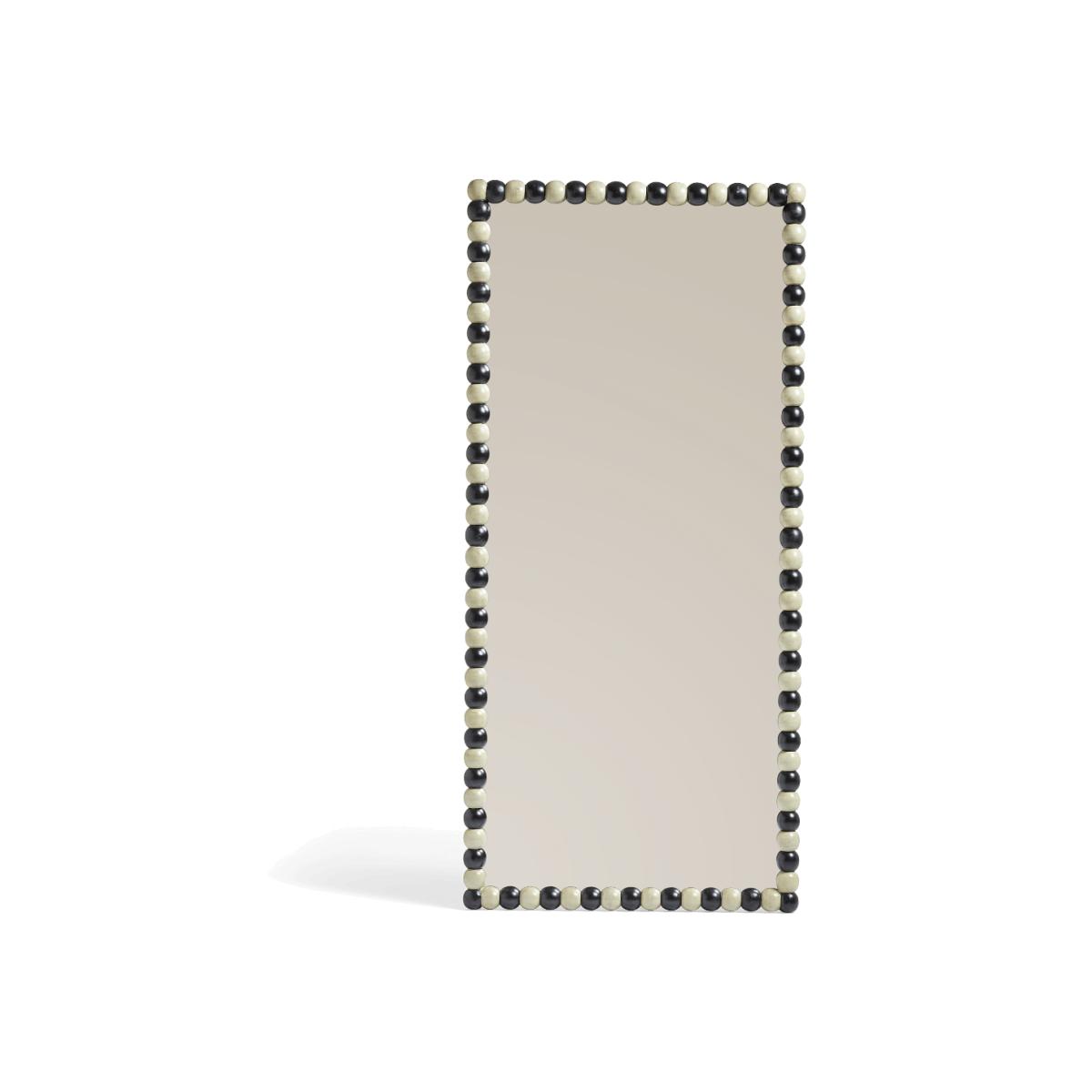 Our Bobina Mirrors are inspired by bobbin furniture – otherwise known as spool furniture – of the late 17th century. This style had legs that were generally lathe-turned into ornamental shapes in order to make a feature of them. We have expanded our best-selling range to include this oversized, statement floor-standing mirror: drawing on the bobbin characteristic, its solid mango wood frame is hand carved into pleasing spherical shapes, then hand painted contrasting black and vellum hues and finished with an antiqued, rubbed effect. Due to the artisanal techniques used, each piece will have individual characteristics that add to their charm.
