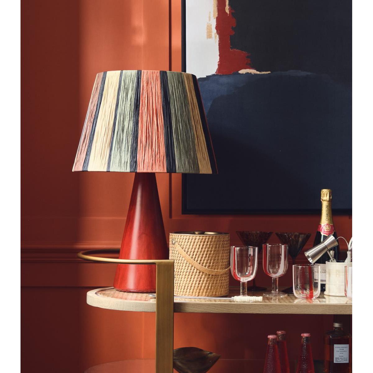 The colourfully dyed raffia that wraps around our Bridget Lampshade’s handmade metal frame is carefully arranged to form sophisticated stripes. Its muted colours will bring warmth to your interiors when switched on or off. This is the larger of two sizes.