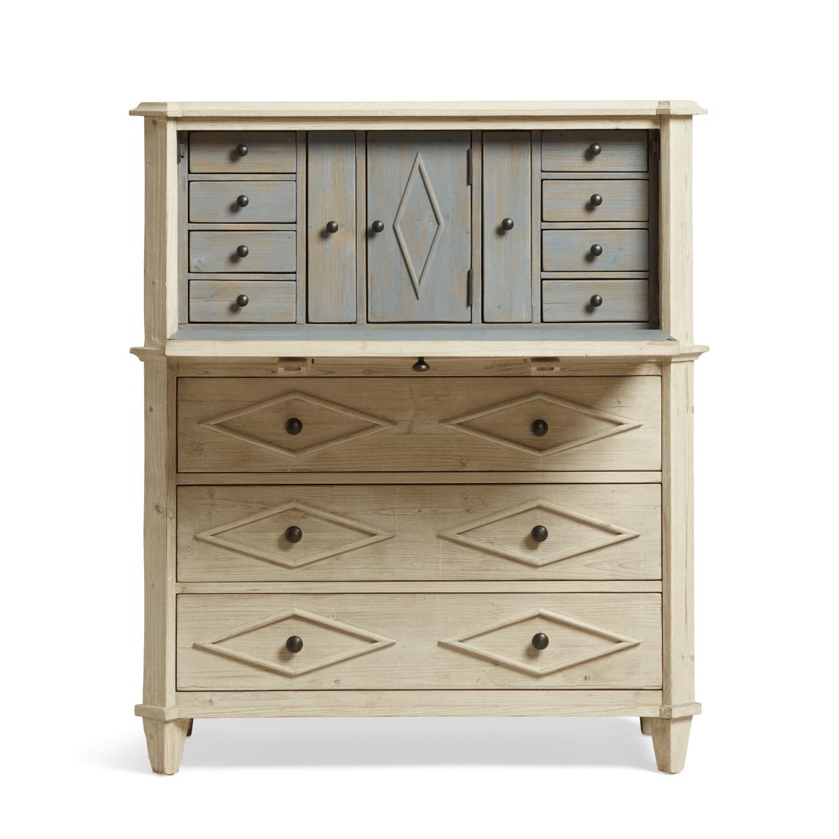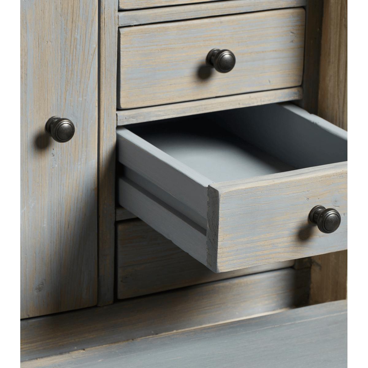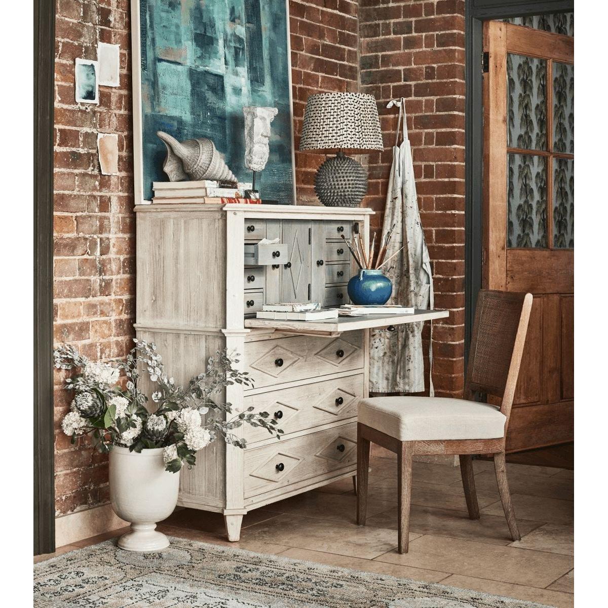 Have you ever wished for a little more storage in your home office or dressing room? Enter the Briolette Bureau; with eleven drawers (eight of which are hidden inside along with two box files) as well as one central cupboard, there is room for all your workspace essentials. While the classic, rustic French design – complete with fold-down table on pull-out supports – is based on an antique, it's ready for the demands of a modern home too; there's a hole in the back for cables that keeps wires tidy and hidden from view. The soft tones of the painted wood finish also help inspire a calm, clear mind when working.
