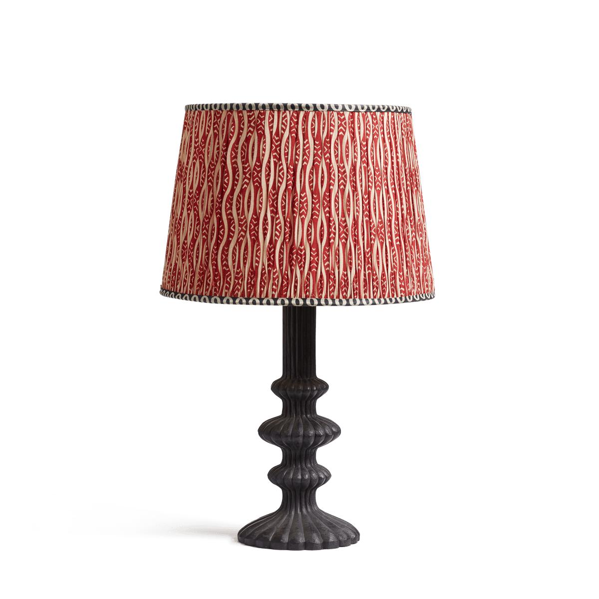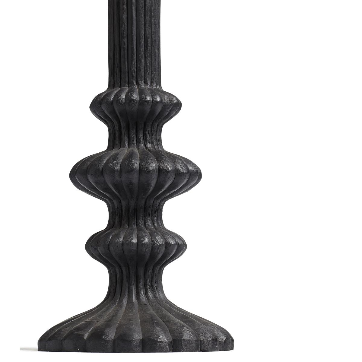 The fluted column of the Calendula lamp base splays outwards at the bottom in the shape of a many-petalled flower. The mahogany wood is handmade by skilled artisans, and the ribbed structure is stained black which adds to its enduring appeal.