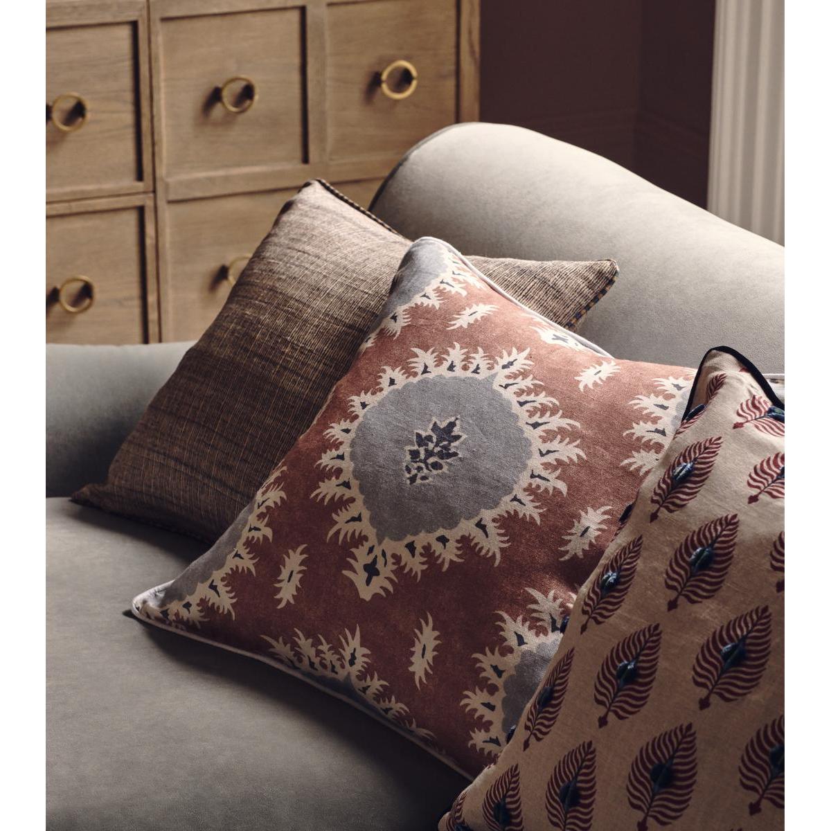 Originally designed for a lampshade, our Callot print, with its appealingly fine stripe, now adorns a cushion. Not too straight, not too precise, the pattern is pleasingly imperfect and artistically subtle. It’s hand block printed in black and gold hues onto the handwoven natural tussar silk base.