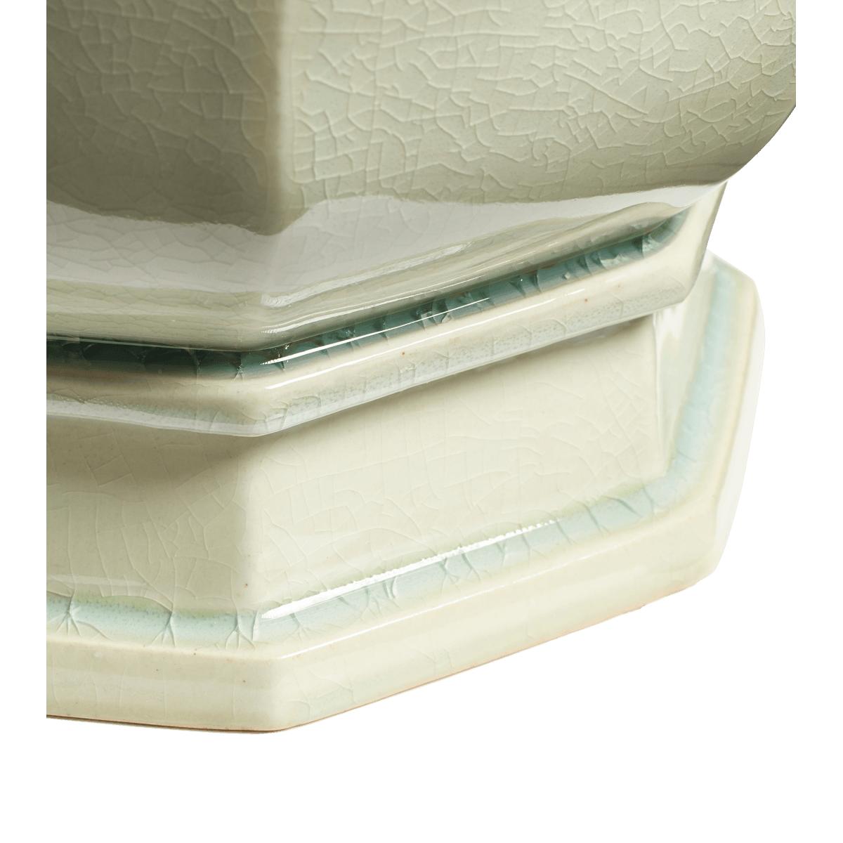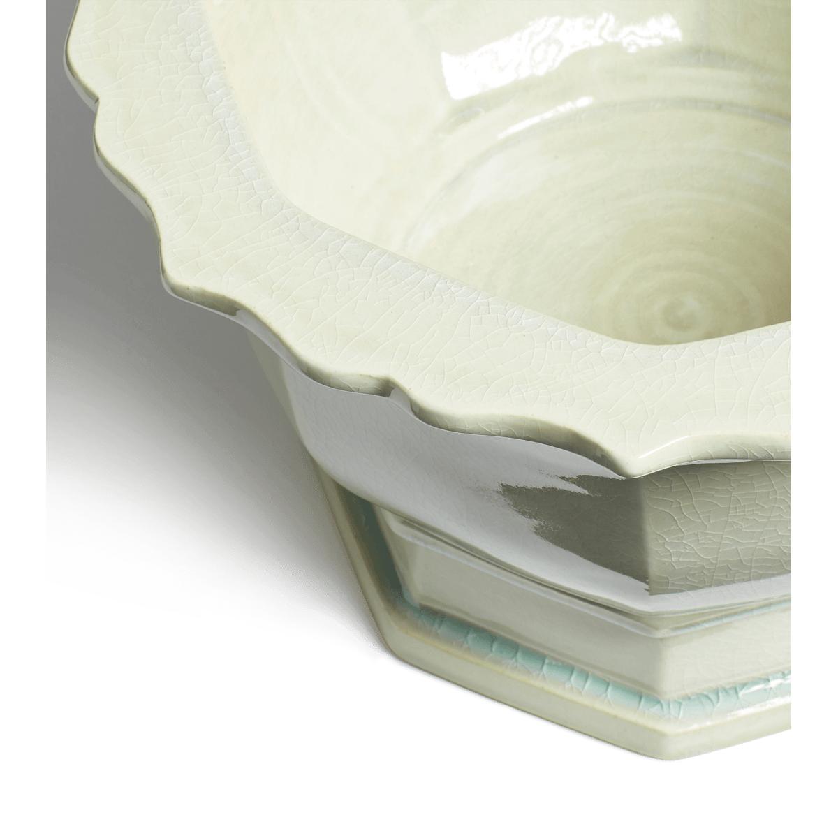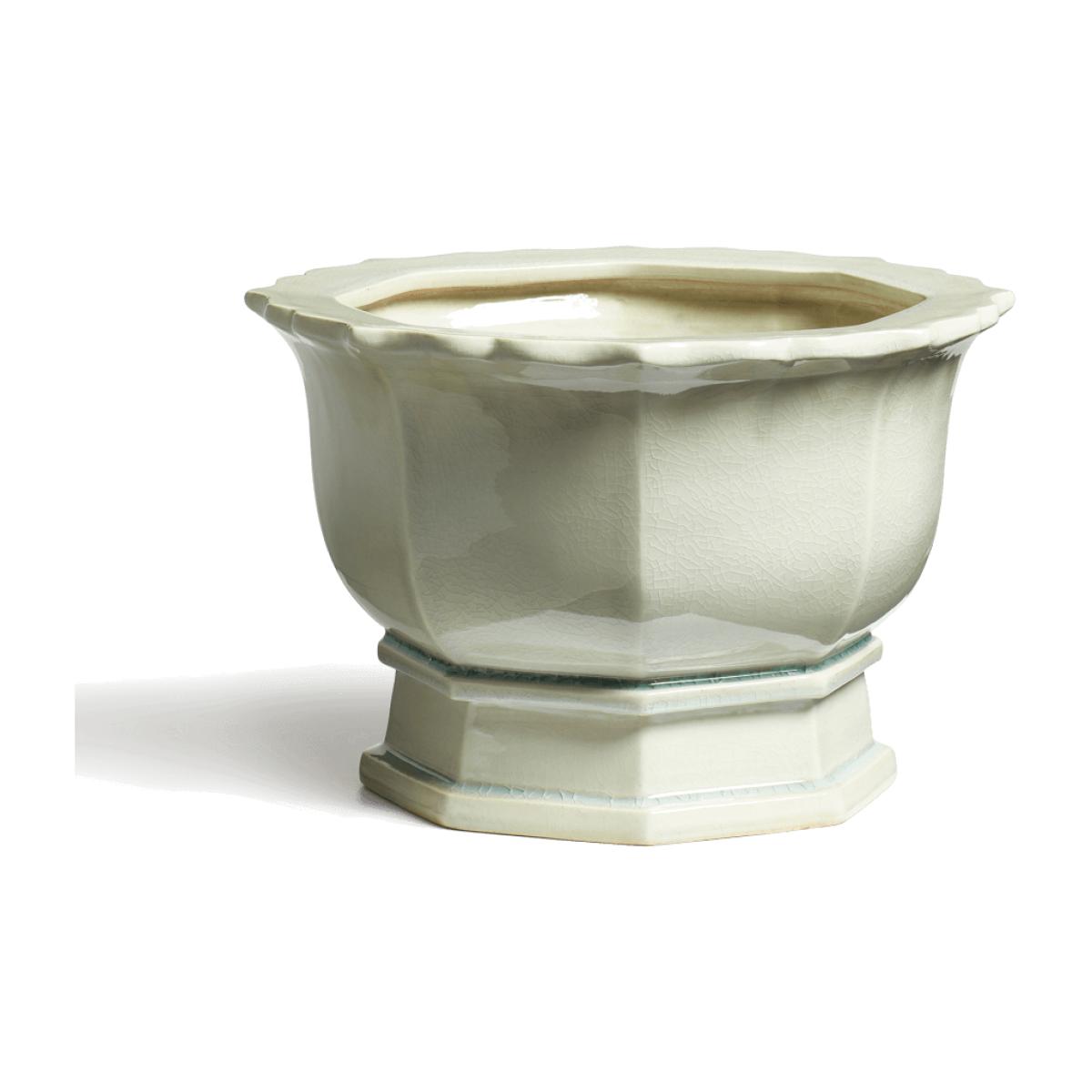 Our handmade Campanula Planter mimics the shape of bellflowers: its form is curvaceous and full, offset by the clean lines of its sturdy base. A scalloped edge adds interest while a crackled glaze gives high shine and visual texture to its off-white structure. Due to the hand-painted antique finishing process, each piece will have individual characteristics.