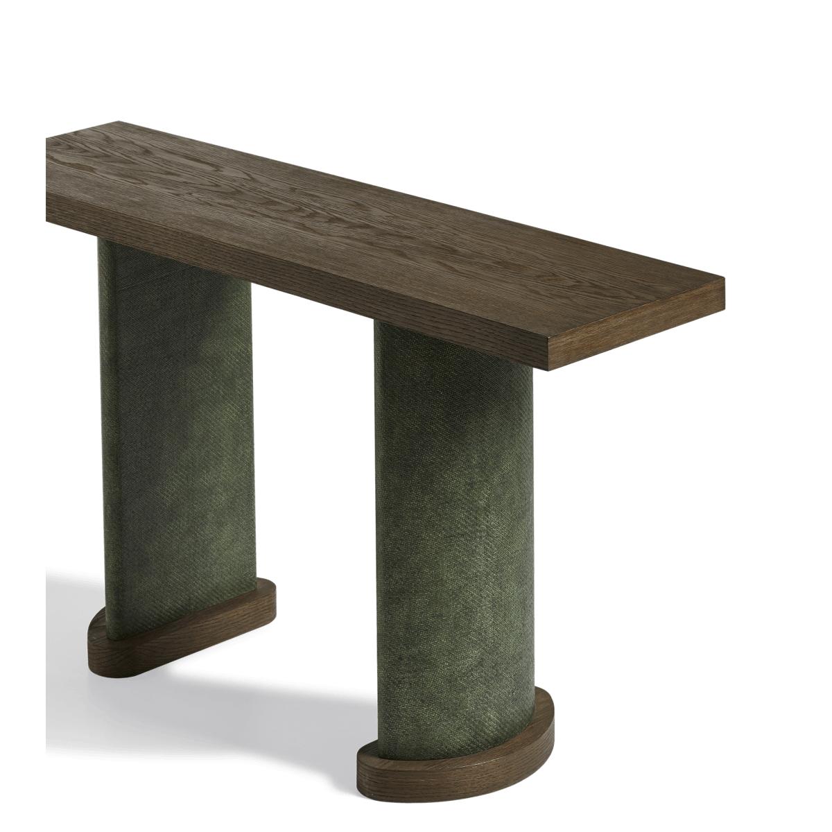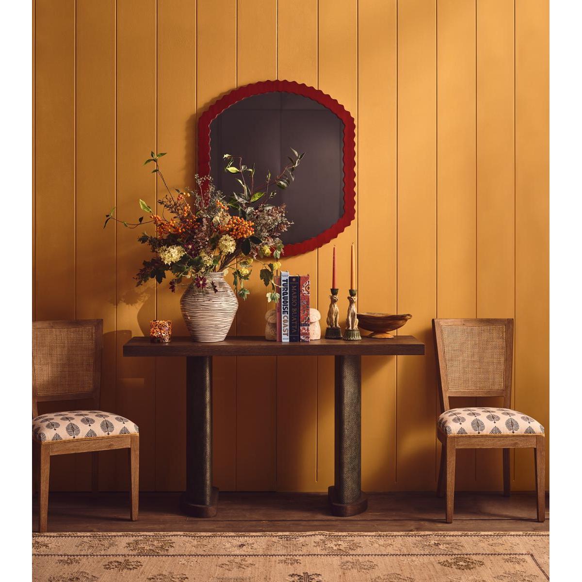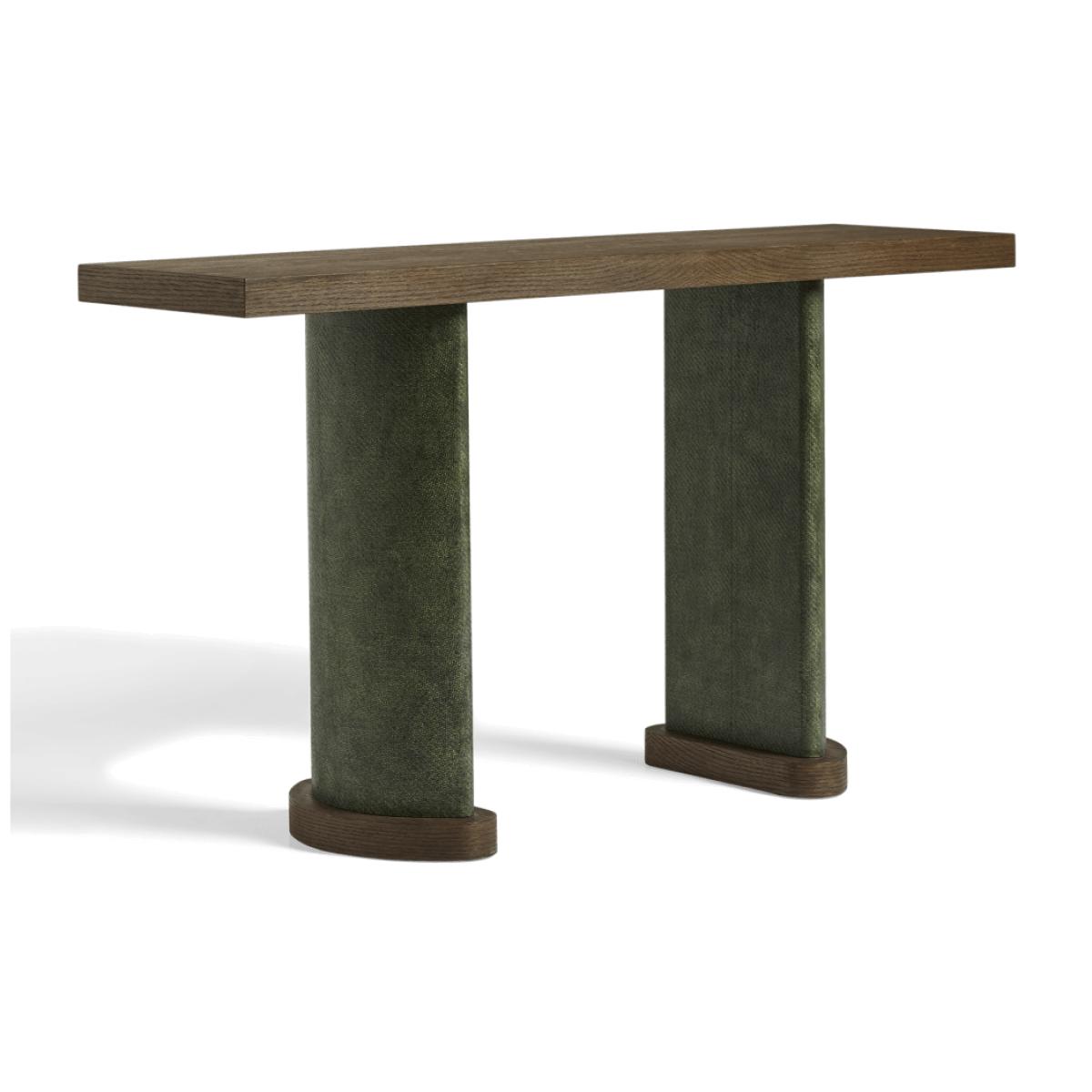 I’m keen on the Candra console for its clean-lined espresso top paired with subtly upholstered column legs - it adds just enough texture without feeling bulky. It slots straight into modern or mid-century schemes, but equally lifts an eclectic hallway or sits neatly behind a sofa in a contemporary living room. For styling, keep the surface clear around a statement lamp or sculptural vase to emphasise its architectural form. Hang a round or slim-framed mirror above to bounce light, and introduce a stack of art books or a ceramic bowl for everyday essentials.