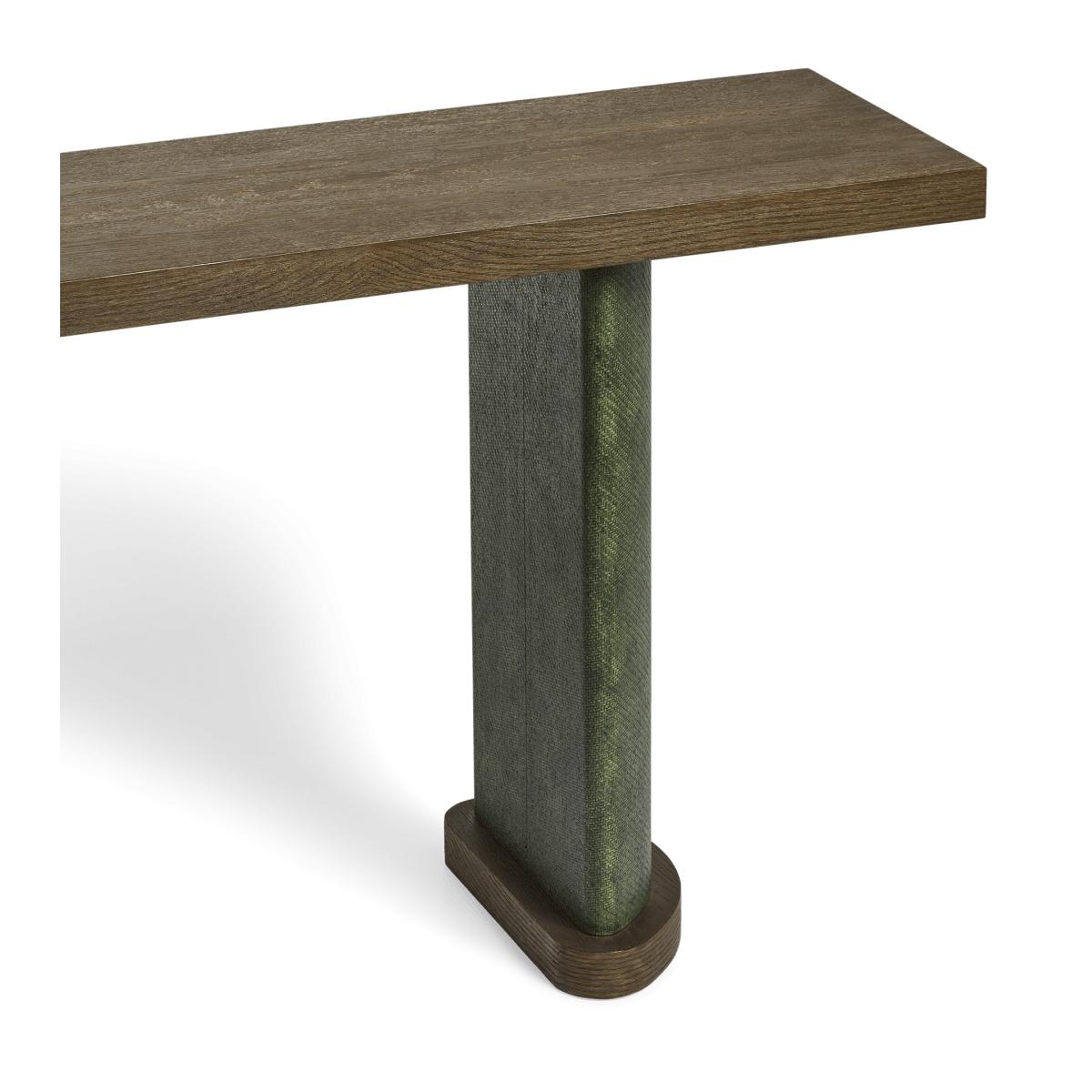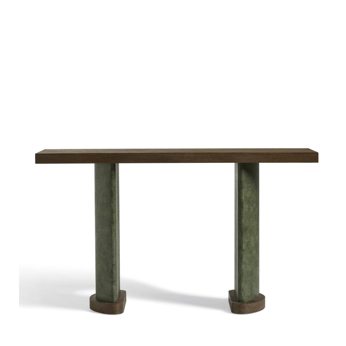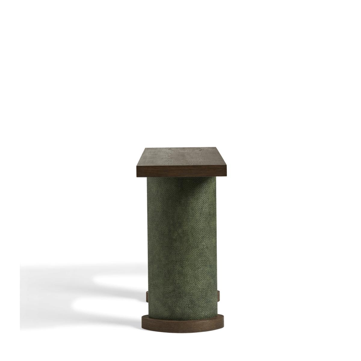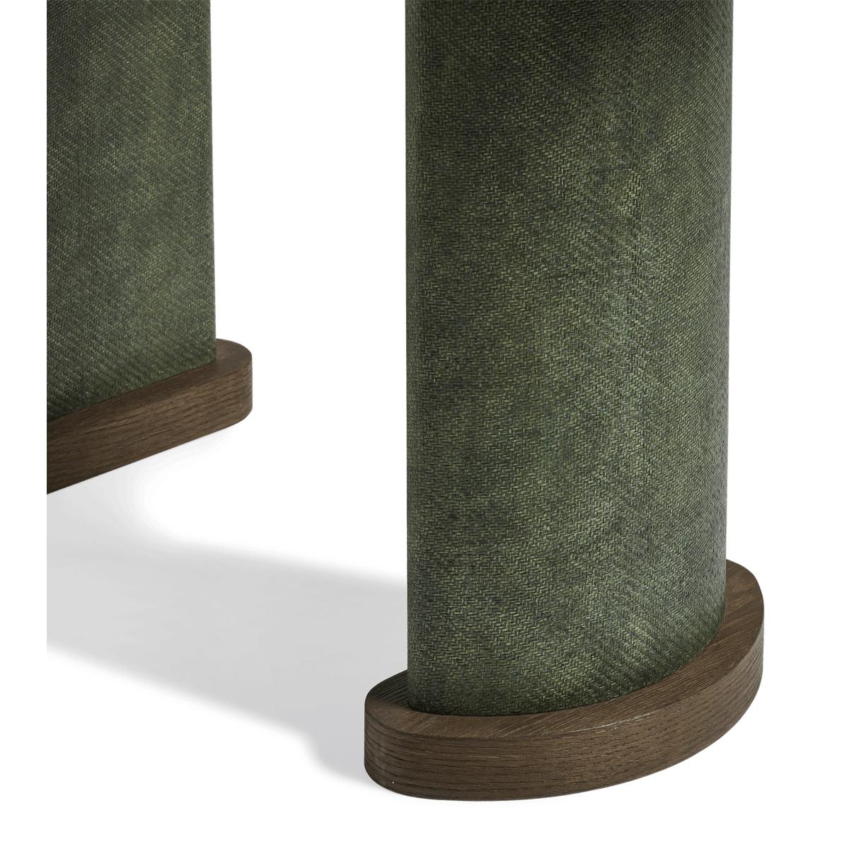 Tall half-moon legs and a combination of espresso-coloured wood and green-hued raffia make the Candra Console Table a striking addition to interiors. The legs add a welcome tactile contrast to the smoothness of the wooden top and bases. This range is also available in a variety of other styles. Due to the artisanal craftsmanship and natural materials, each piece will have individual characteristics that add to their charm.