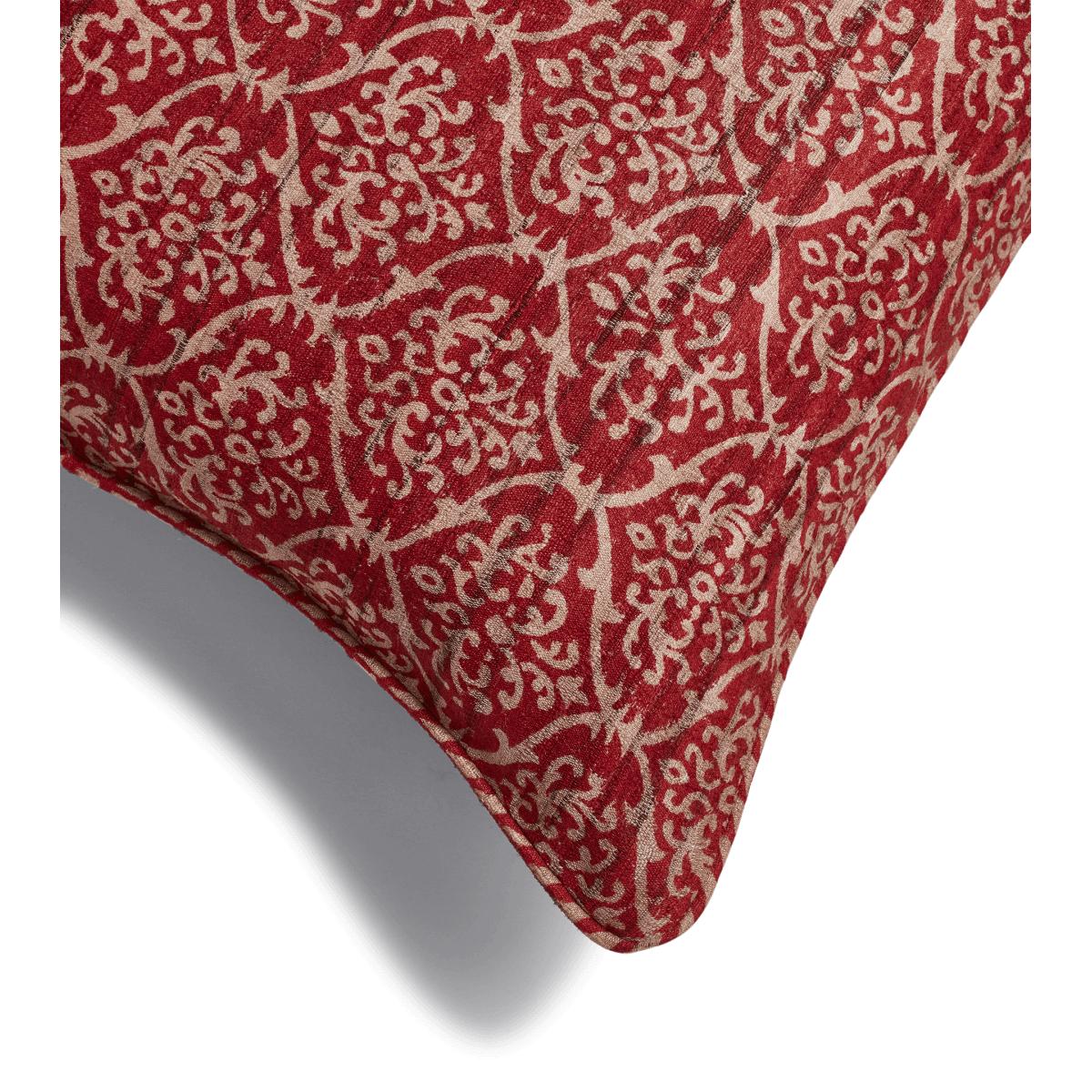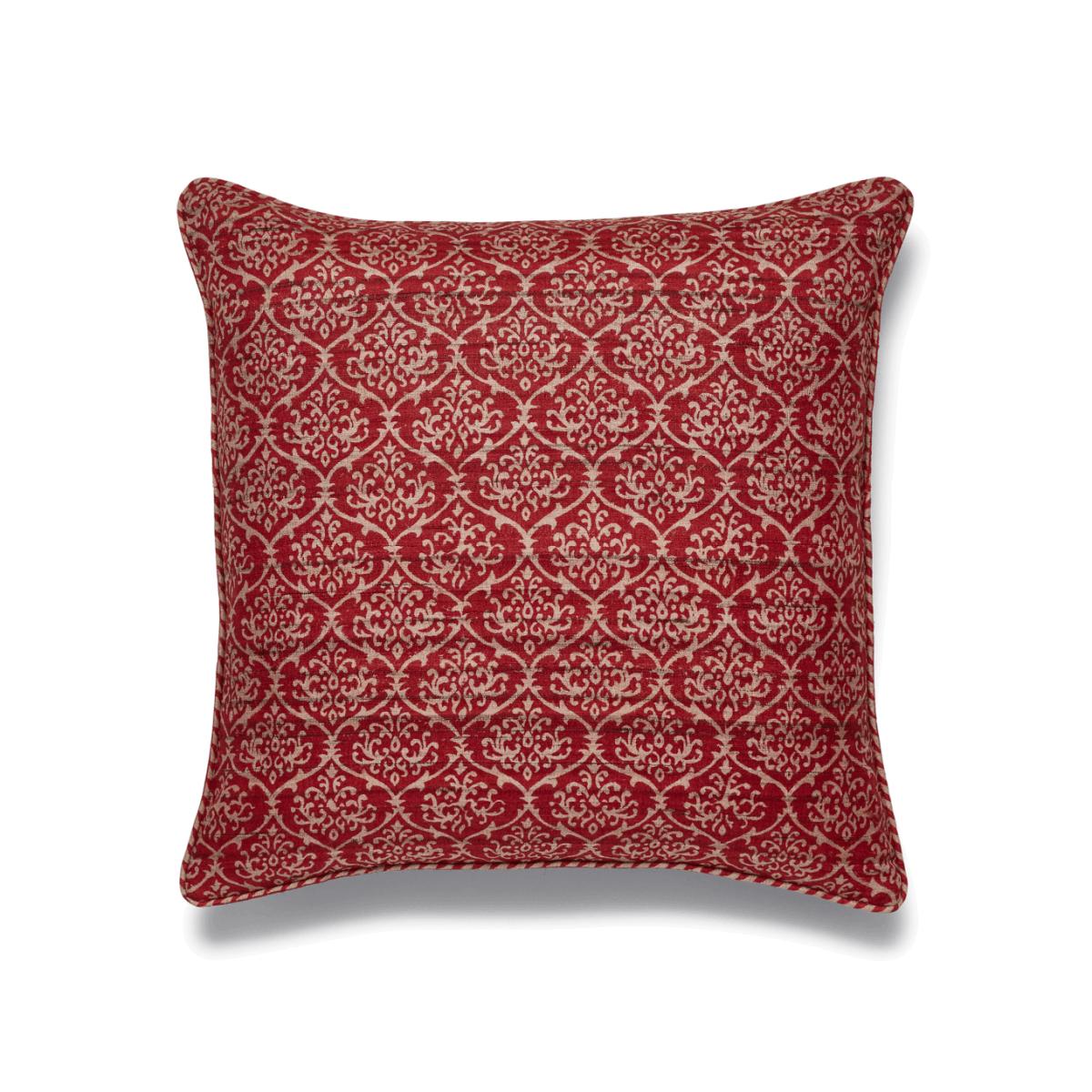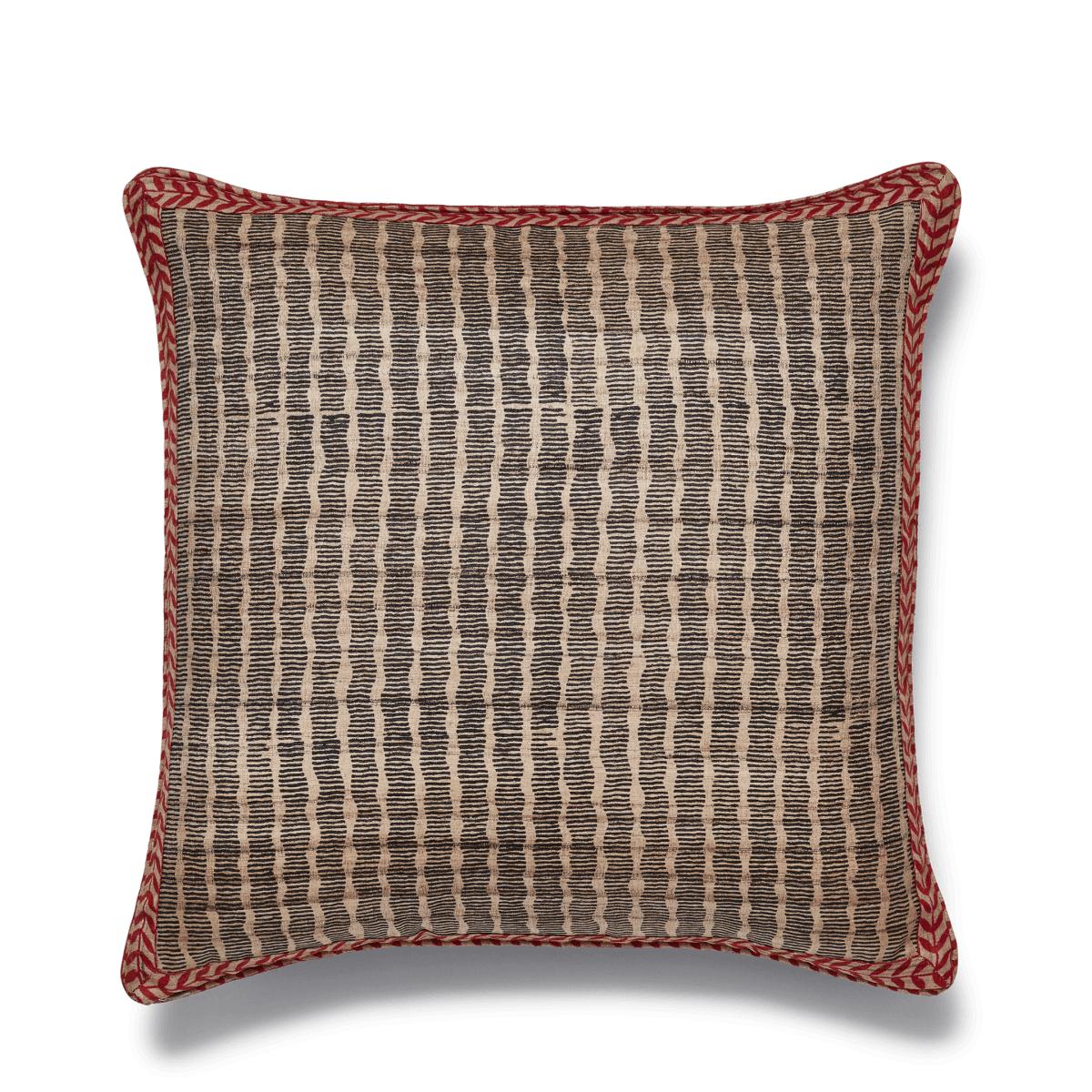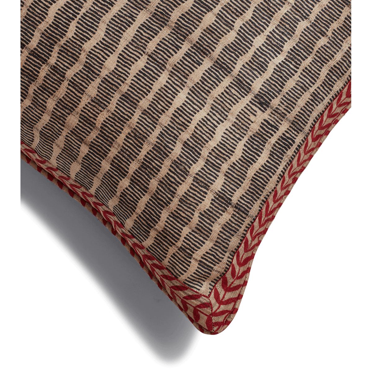 The raw tussar silk used to craft our Caprio Cushion Covers is cultivated from cocoons in the deep forests of Bastar and Assam, India. The yarn spun from this silk is unique, with an irregular thickness that adds to its charm. It is first hand spun and handwoven, then block printed to form the intricate red repeating pattern. Flip the cushion over to enjoy its delicately striped reverse, complete with a leafy border. This surprise pattern on the back offers two looks in one cushion. Due to the artisanal process and natural materials, each cushion will have individual characteristics.