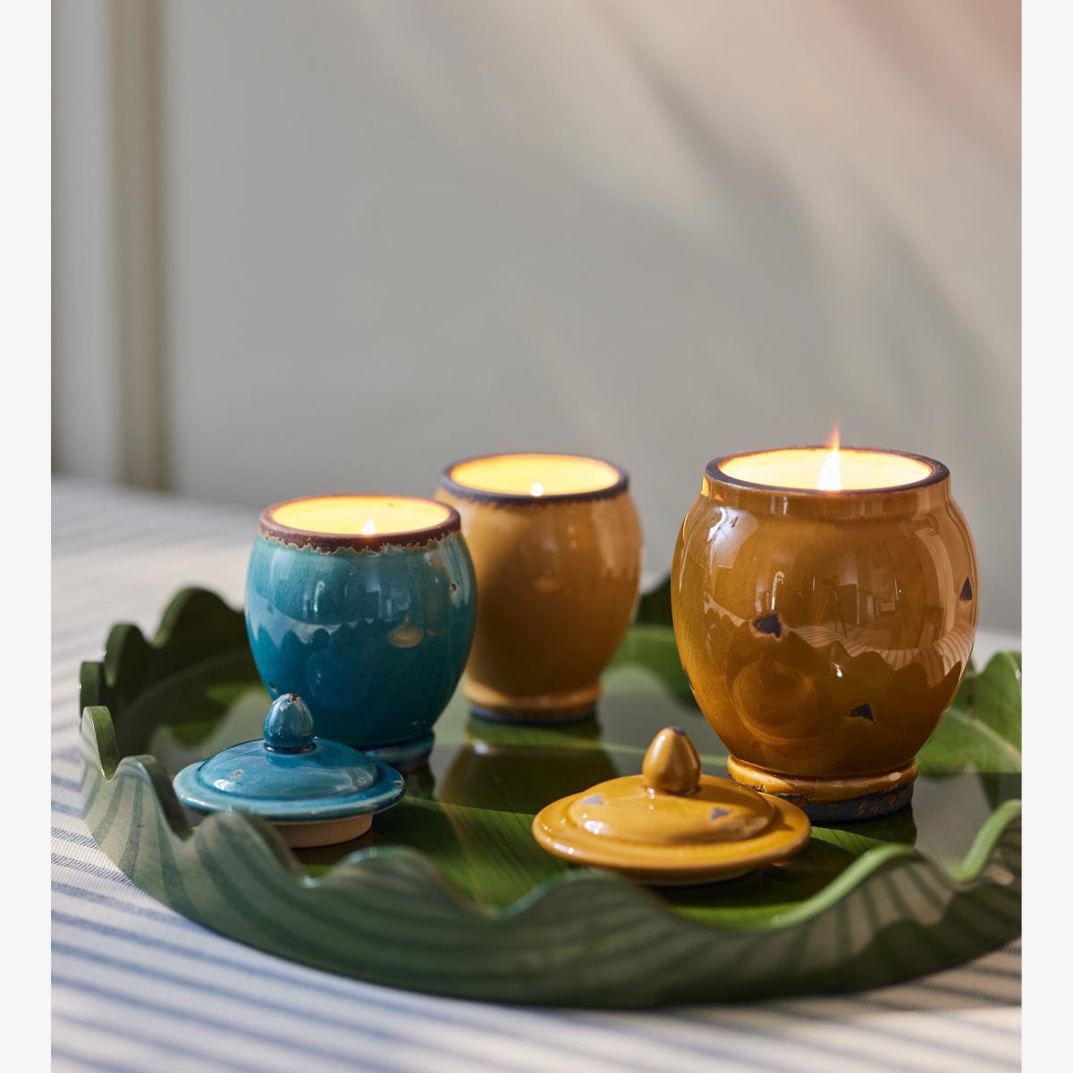 India has long been a source of inspiration for OKA, from our founders’ initial travels to the sourcing trips of our product designers, who are influenced by the country's vivid colours, silky textiles and glorious patterns. Known as the spice coast of India, Kerala is one such destination, blanketed in lush greenery, forests of spices, bounteous bazaars and a coastline with a rich history of spice trade. The Cardamom Hills (Yela Mala) – its mountain range – is home to many of the scents that make this candle fragrance, from cardamom itself to vanilla, clove, cedarwood and sandalwood.