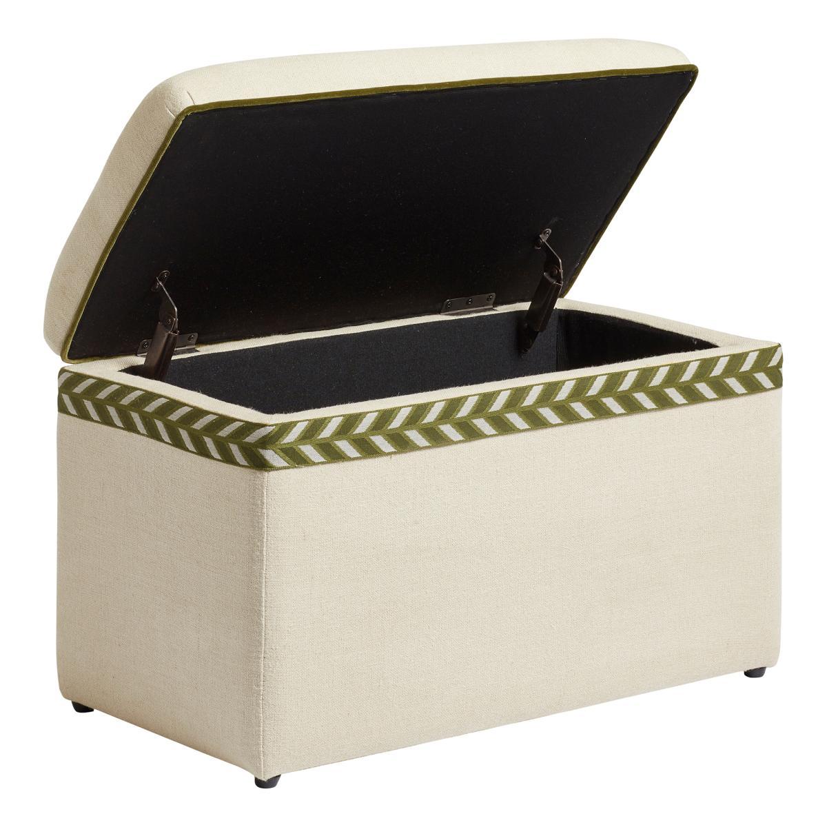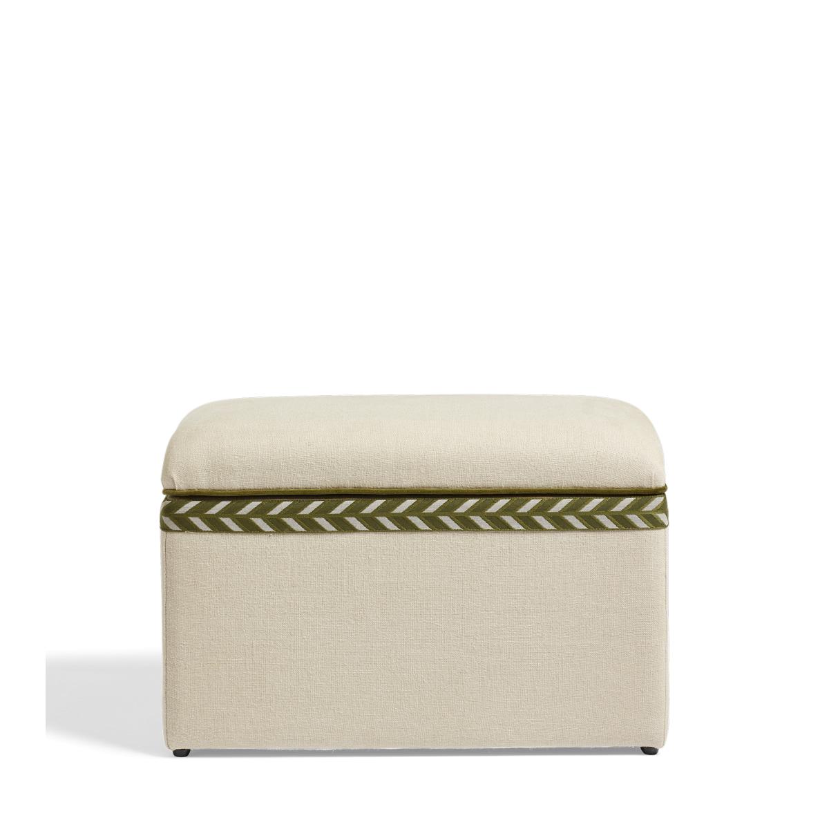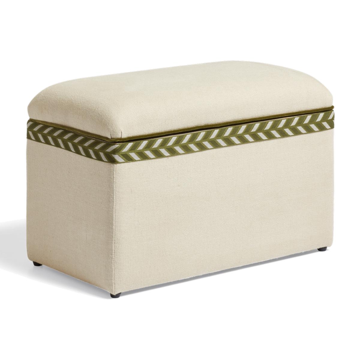 Think our upholstered trunks, but petite. The Carena is a smaller version that provides the perfect storage/seating option for more confined spaces, whether it be an entryway, a bed end, or a landing. Its plain upholstery is complemented by Spruce green velvet piping and a chevron trim that wraps around its opening.