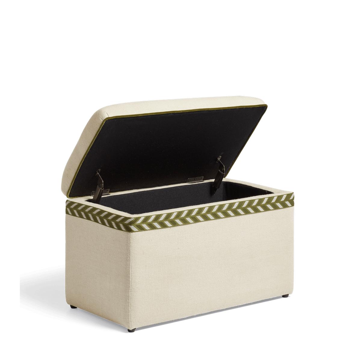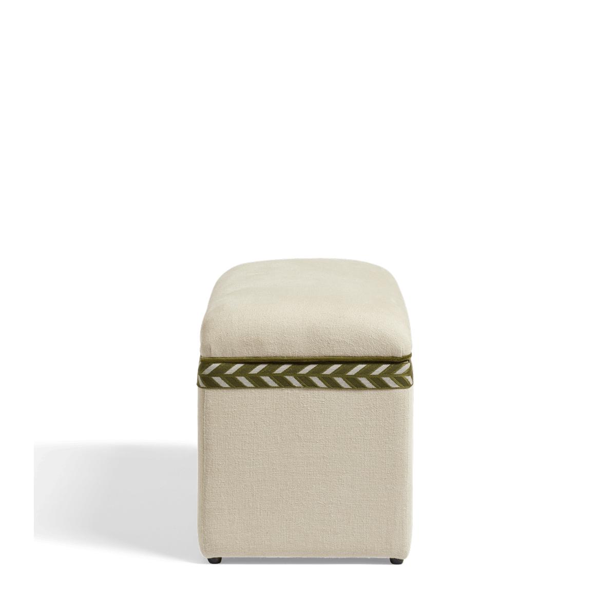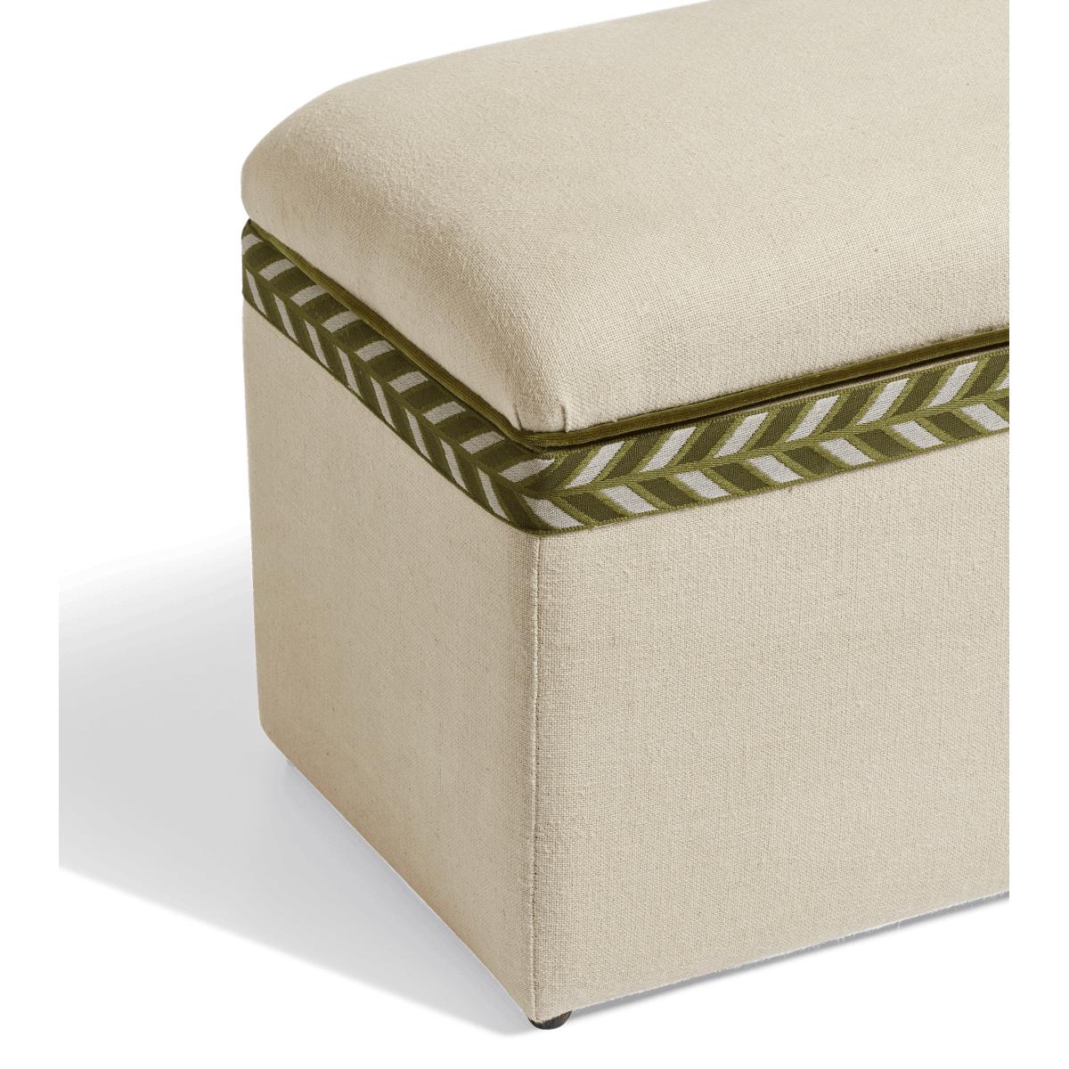 Think our upholstered trunks, but petite. The Carena is a smaller version that provides the perfect storage/seating option for more confined spaces, whether it be an entryway, a bed end, or a landing. Its plain upholstery is complemented by Spruce green velvet piping and a chevron trim that wraps around its opening.