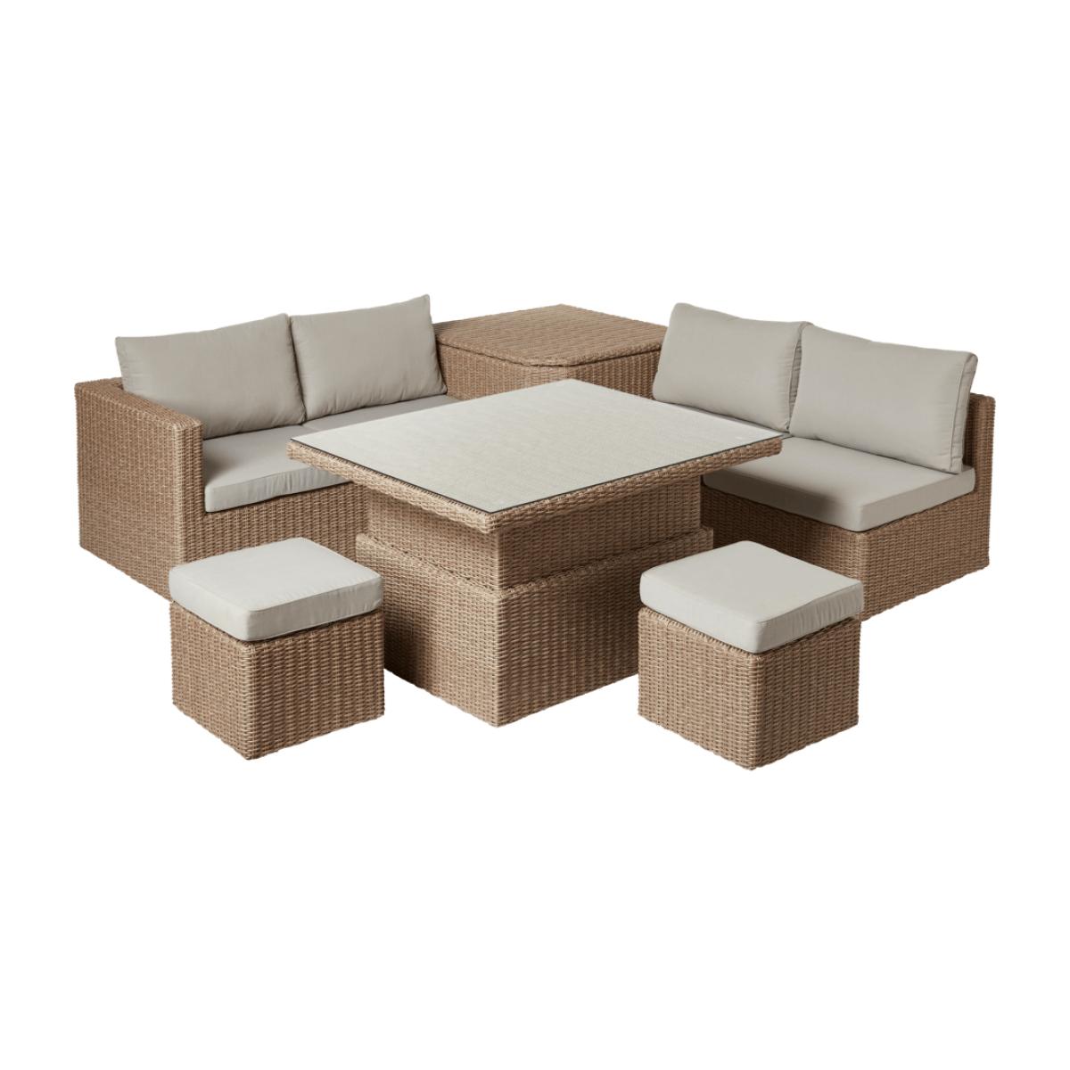 I’m a fan of the Carrillo set for its clever blend of storage and seating in a neutral, off-white weave that works just as well in a coastal hideaway as it does on a contemporary, paved terrace. Its clean lines and modular design suit modern rustic, Scandi-inspired or snug cottage-style gardens, and the glass-topped table adds a sense of lightness without sacrificing durability. For practical styling, keep the tabletop clear for entertaining - add a simple stone tray with citronella candles and a small herb pot to bring instant freshness. Use patterned throws or cushions in muted greens or terracotta to introduce colour, and tuck the stools neatly under the table when not in use to maximise circulation. If you have extra storage in the table base, stow away outdoor lanterns or garden games to maintain a tidy look between gatherings.