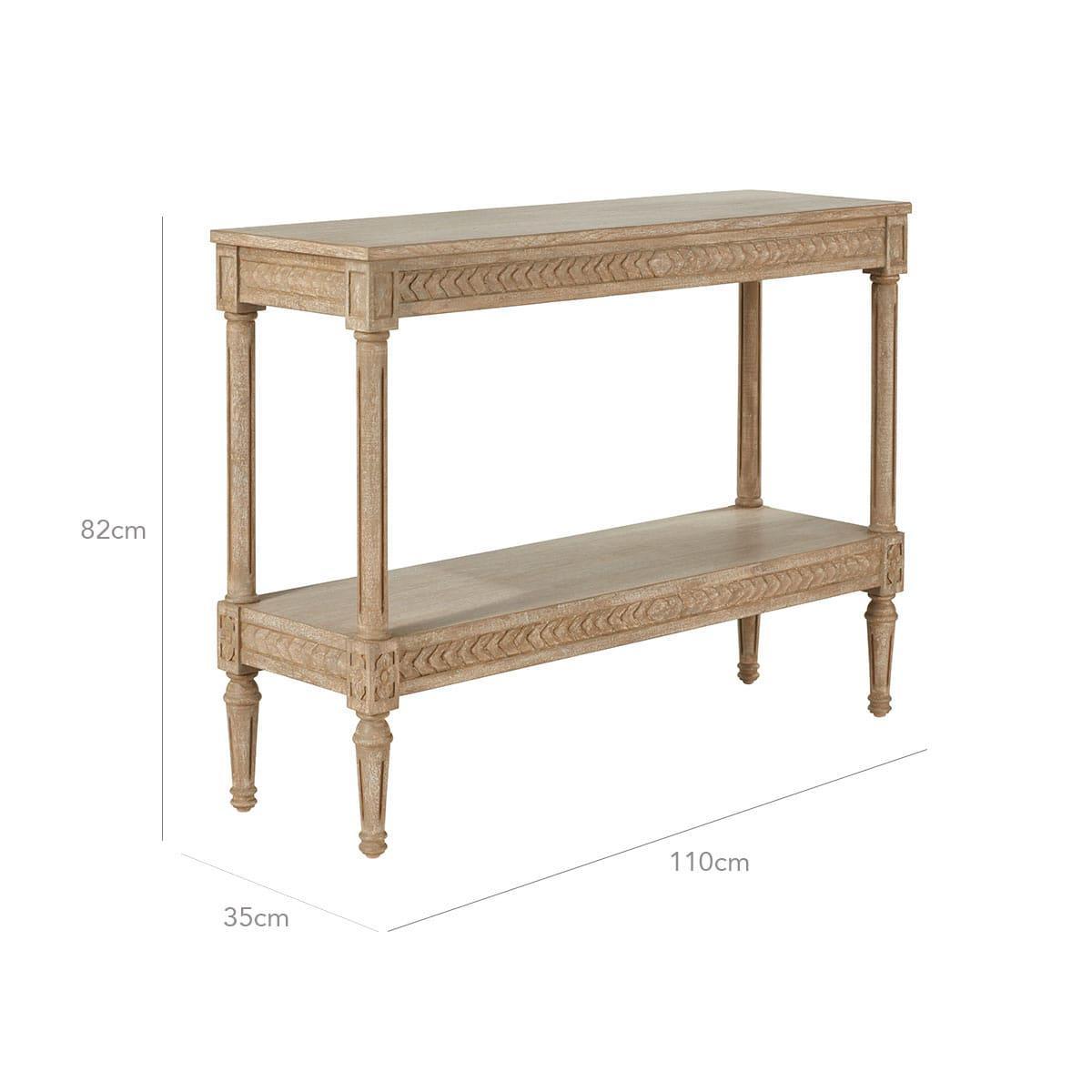 I’m a fan of the Castellau console for its carved detailing and warm, natural finish - it sits neatly in hallways or behind a sofa without overwhelming the space. Its slender frame and lower shelf make it ideal for everything from Scandi-minimal rooms to more traditional or coastal-inspired interiors. For practical styling, pair it with a round mirror above to reflect light, then layer on a slender lamp, a simple vase of foliage and a small stack of books. Use the bottom shelf for woven baskets or neatly folded throws to keep the look tidy and add texture.
