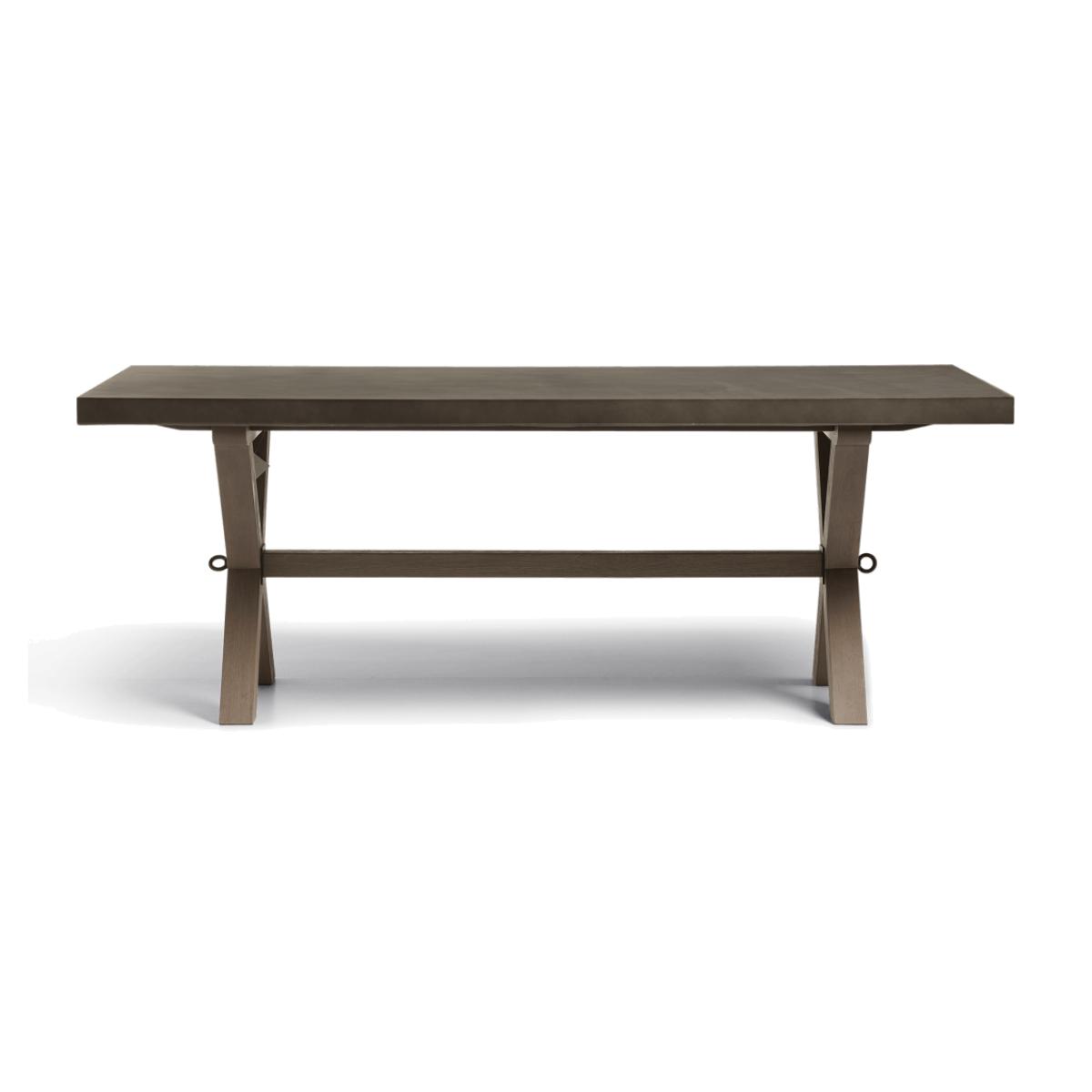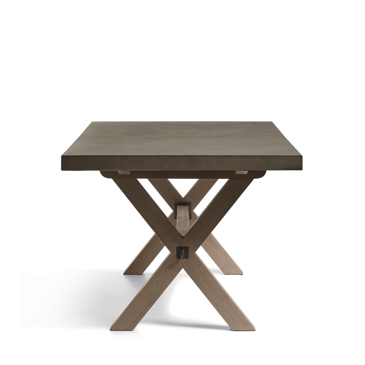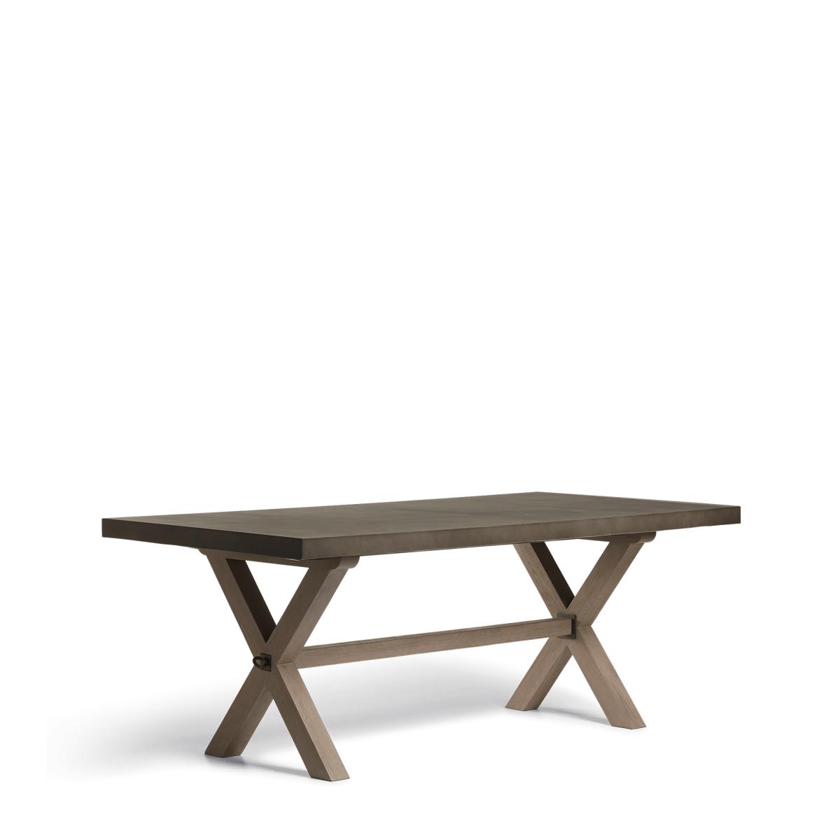 Stylish enough to live inside or out, the Charing Dining Table features a sealed cast concrete surface that sits upon teak legs in the form of an X. The legs are finished with a wire brush for added texture, while exposed metal bolts secure the stretcher that connects the legs, lending more structural stability. Due to the natural materials used, each piece will have individual characteristics that add to their charm.