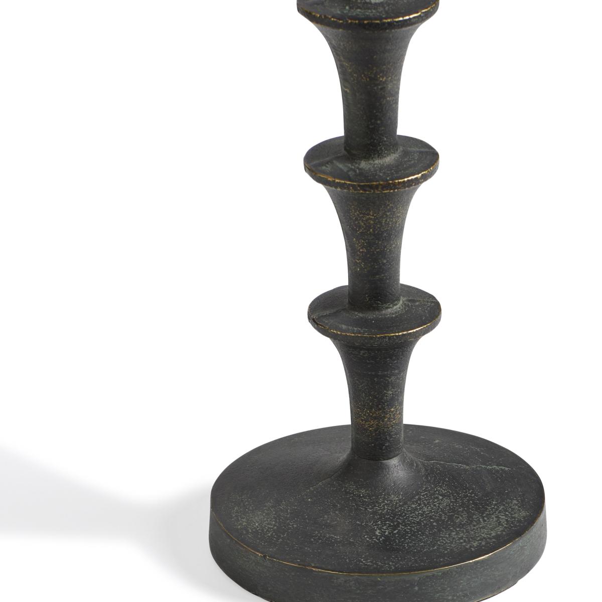 The Clara has a unique tiered stem that is reminiscent of growing fronds of a palm plant. Its shape is created by pouring the molten metal into a mould made from a sand mixture, left to set, and then welded, filed and polished. It has an antique-effect Bronze-Verdigris finish.