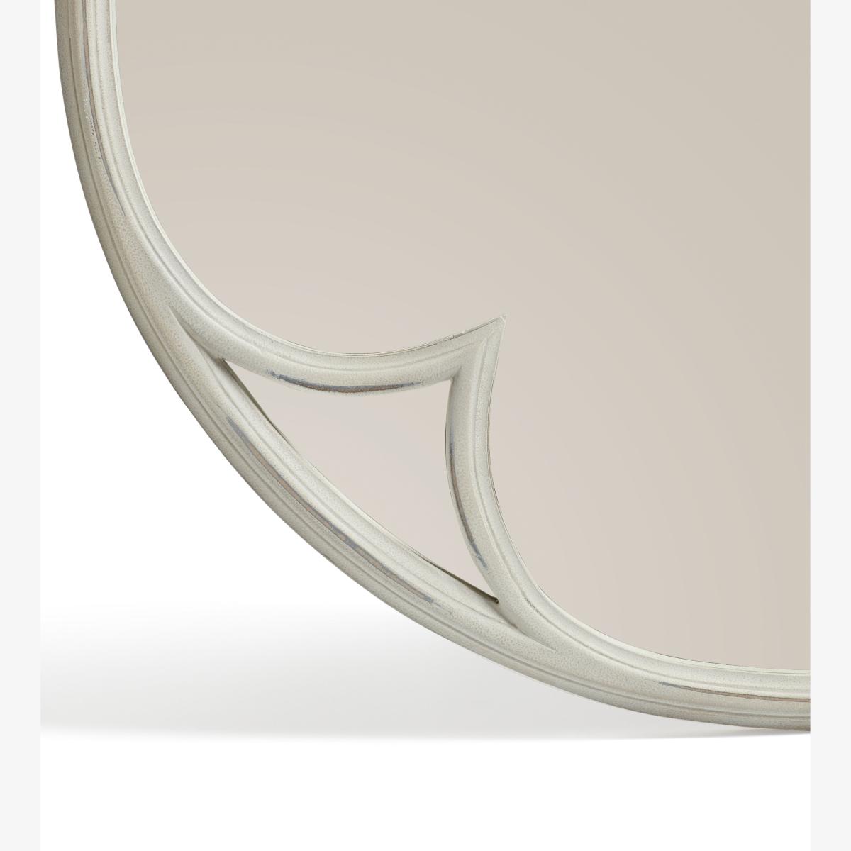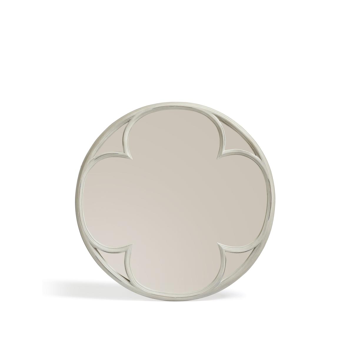 A round mirror featuring an inset quatrefoil, framed with painted wood and then deliberately distressed. The unusual four-leafed clover shape and aged frame would complement a country scheme, and would look especially good hung in a bedroom.