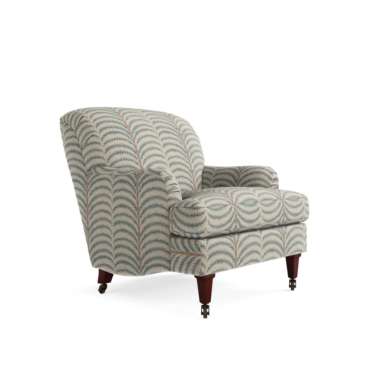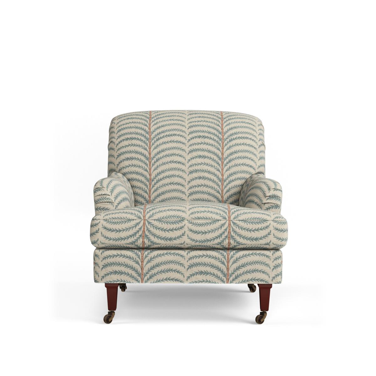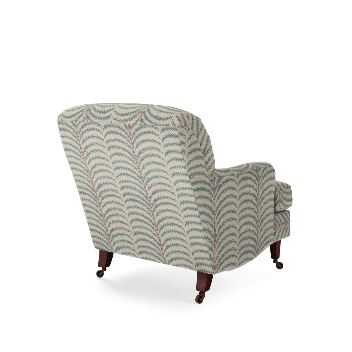 Our Coleridge Armchairs have an early 20th-century style traditional English design, with rounded arms and four antique-style brass-coloured castors on stained birch wood legs. Comfort is very important to us, and it is delivered in abundance via the sprung back and the seat, which features traditional coil springs. We've added to the range by updating it with our much-loved Areca print in a pale Seafoam blue which branches up the back of the chair as if the fronds are growing up and over the arms.