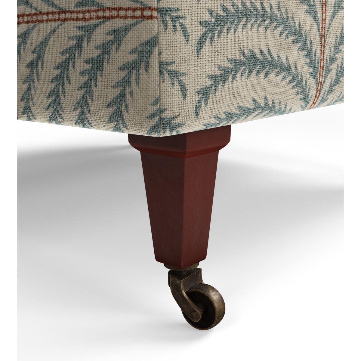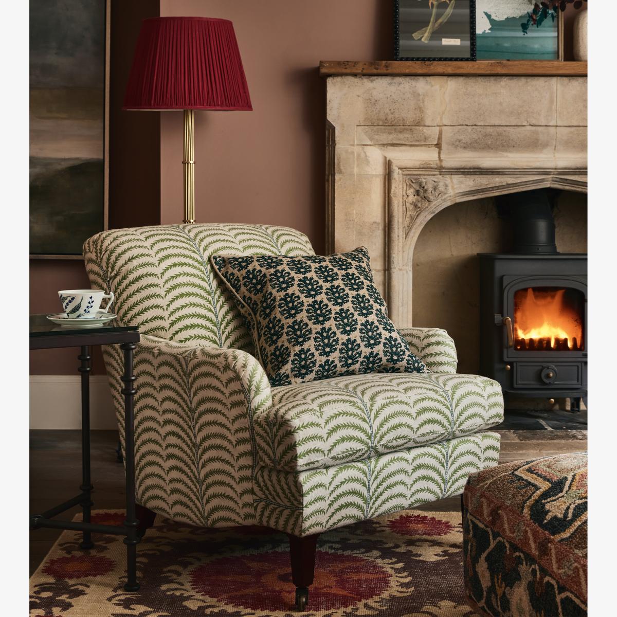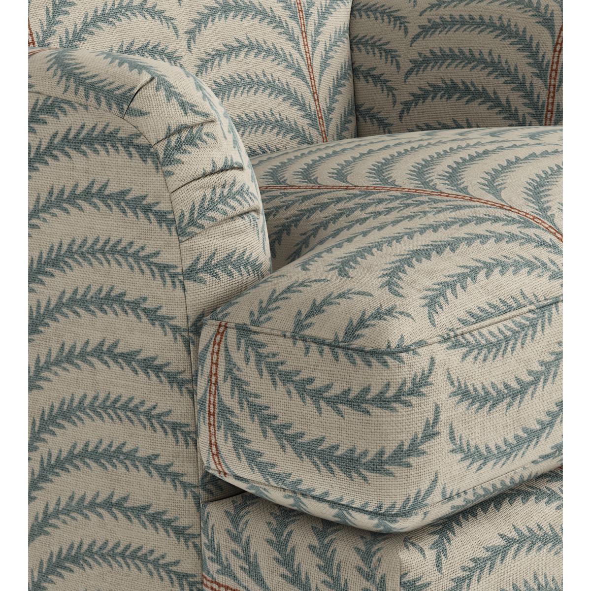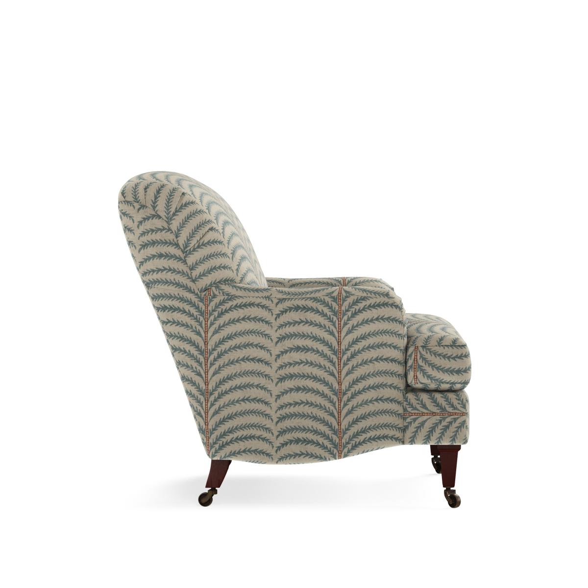 Our Coleridge Armchairs have an early 20th-century style traditional English design, with rounded arms and four antique-style brass-coloured castors on stained birch wood legs. Comfort is very important to us, and it is delivered in abundance via the sprung back and the seat, which features traditional coil springs. We've added to the range by updating it with our much-loved Areca print in a pale Seafoam blue which branches up the back of the chair as if the fronds are growing up and over the arms.