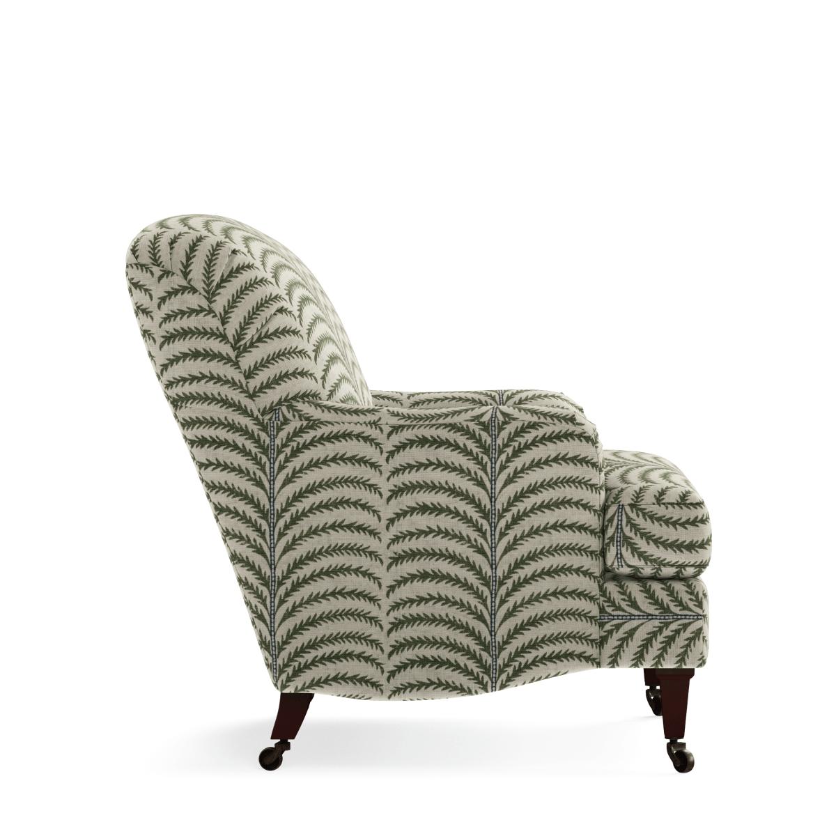 Our Coleridge Armchairs have an early 20th century-style traditional English design, with rounded arms and four antique-style brass-coloured castors on stained birch wood legs which are removable and will be attached upon delivery. Comfort is very important to us, and it is delivered in abundance via the sprung back and the seat, which features traditional coil springs. We’ve added to the range by updating it with our much-loved Areca print which branches up the back of the chair as if the fronds are growing up and over the arms.