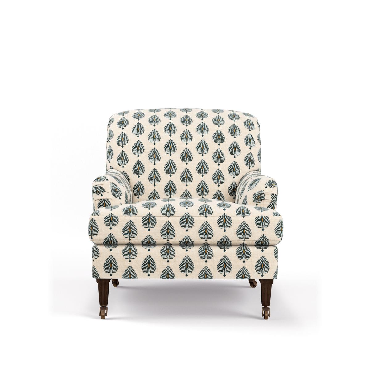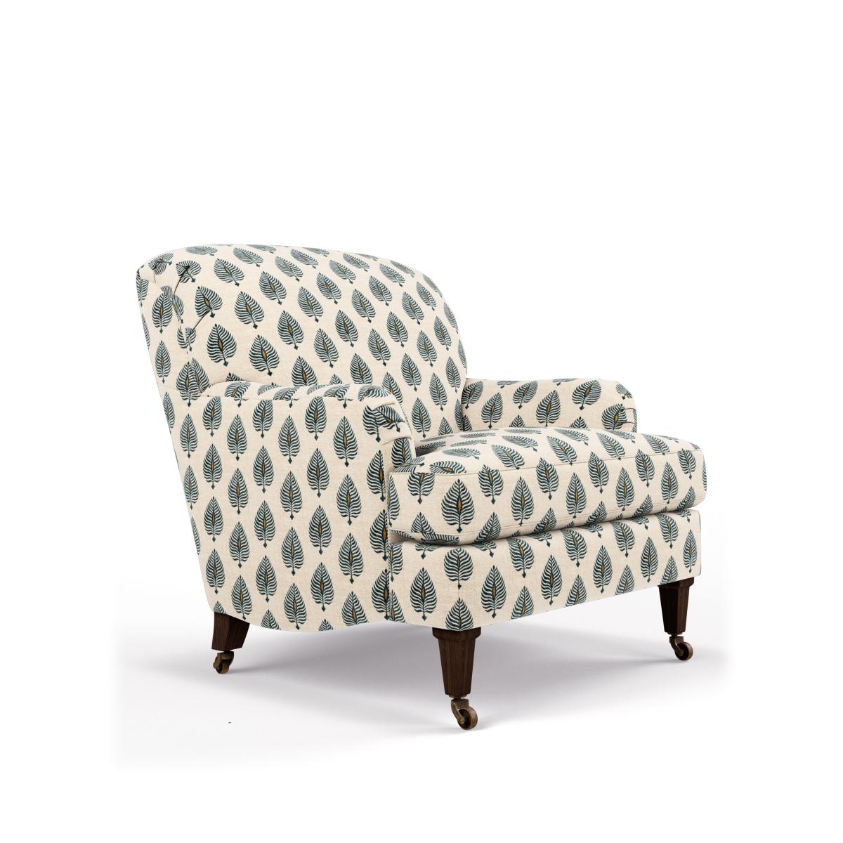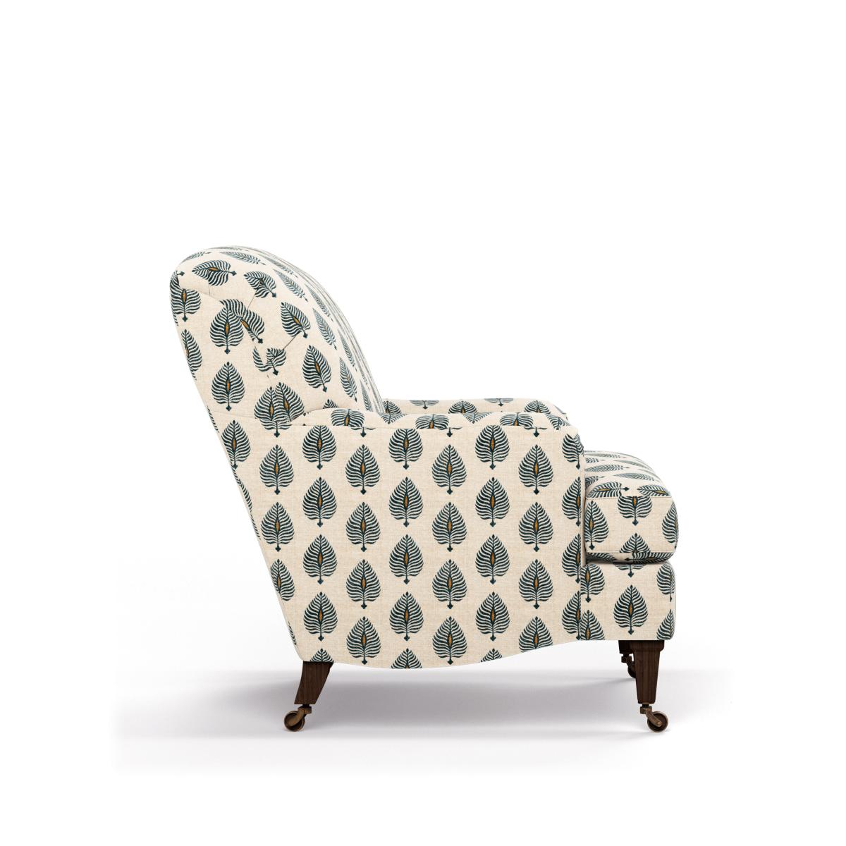 An early 20th century-style velvet armchair in a traditional English design, with rounded arms and four antique-style brass-coloured castors on Espresso-coloured stained birch wood legs. Comfort is very important to us, and it is delivered in abundance via the sprung back and the seat, which features traditional coil springs. Our much-loved peacock-inspired Ocellus Print has been printed onto the neutral stone-washed linen to lend it a striking appearance.