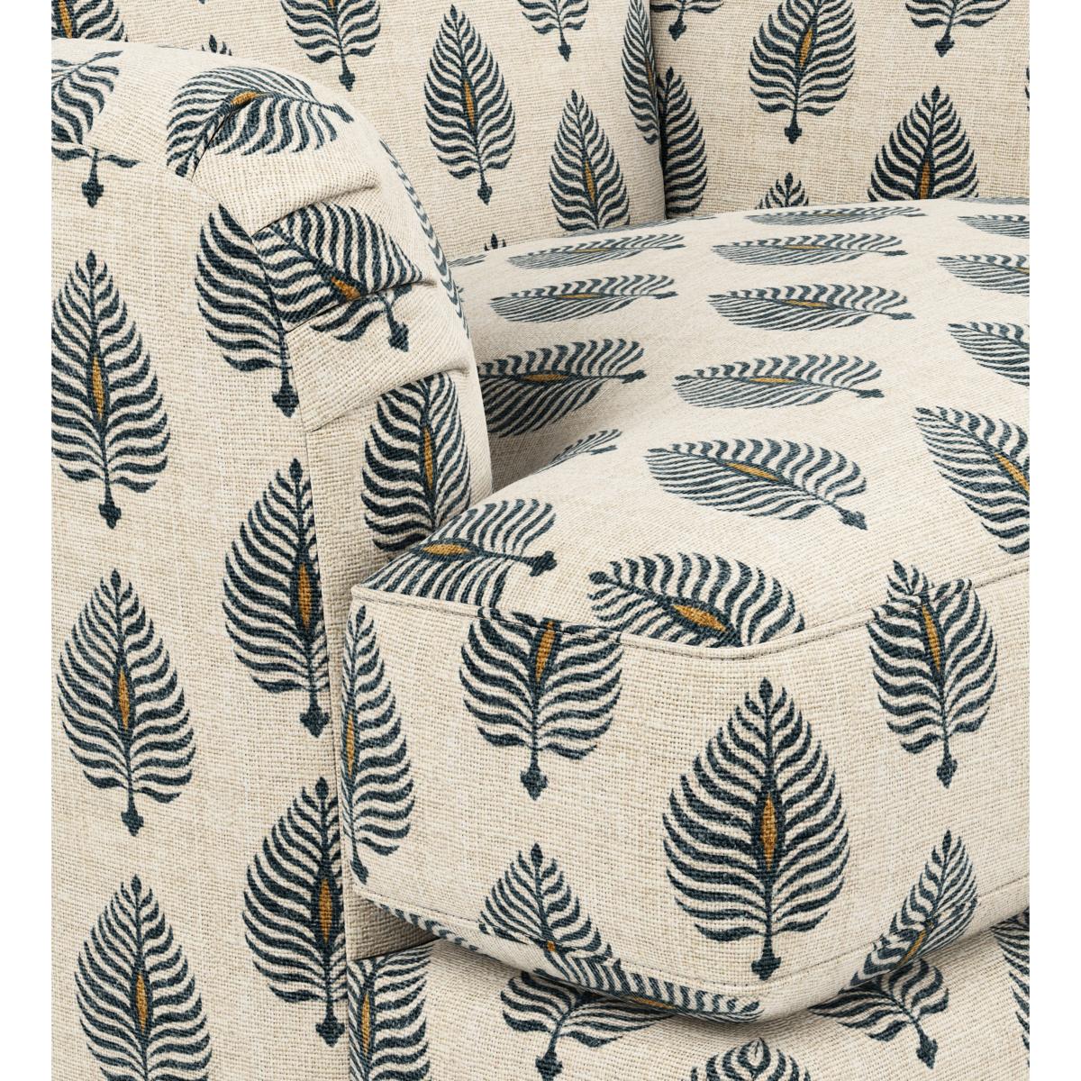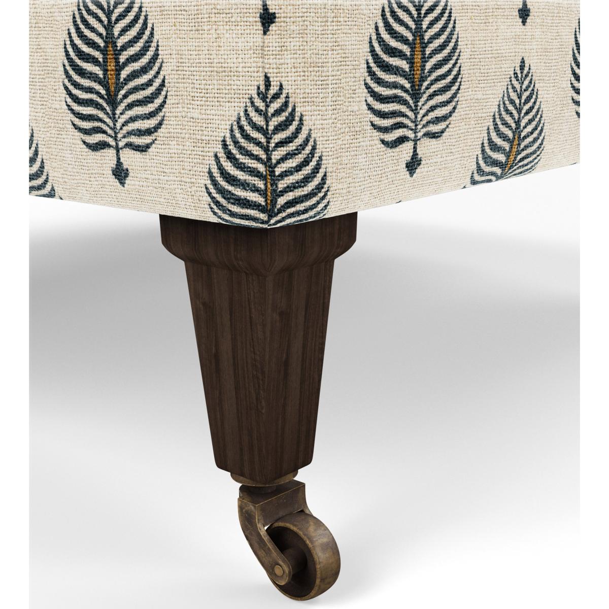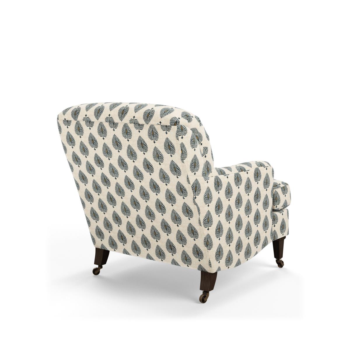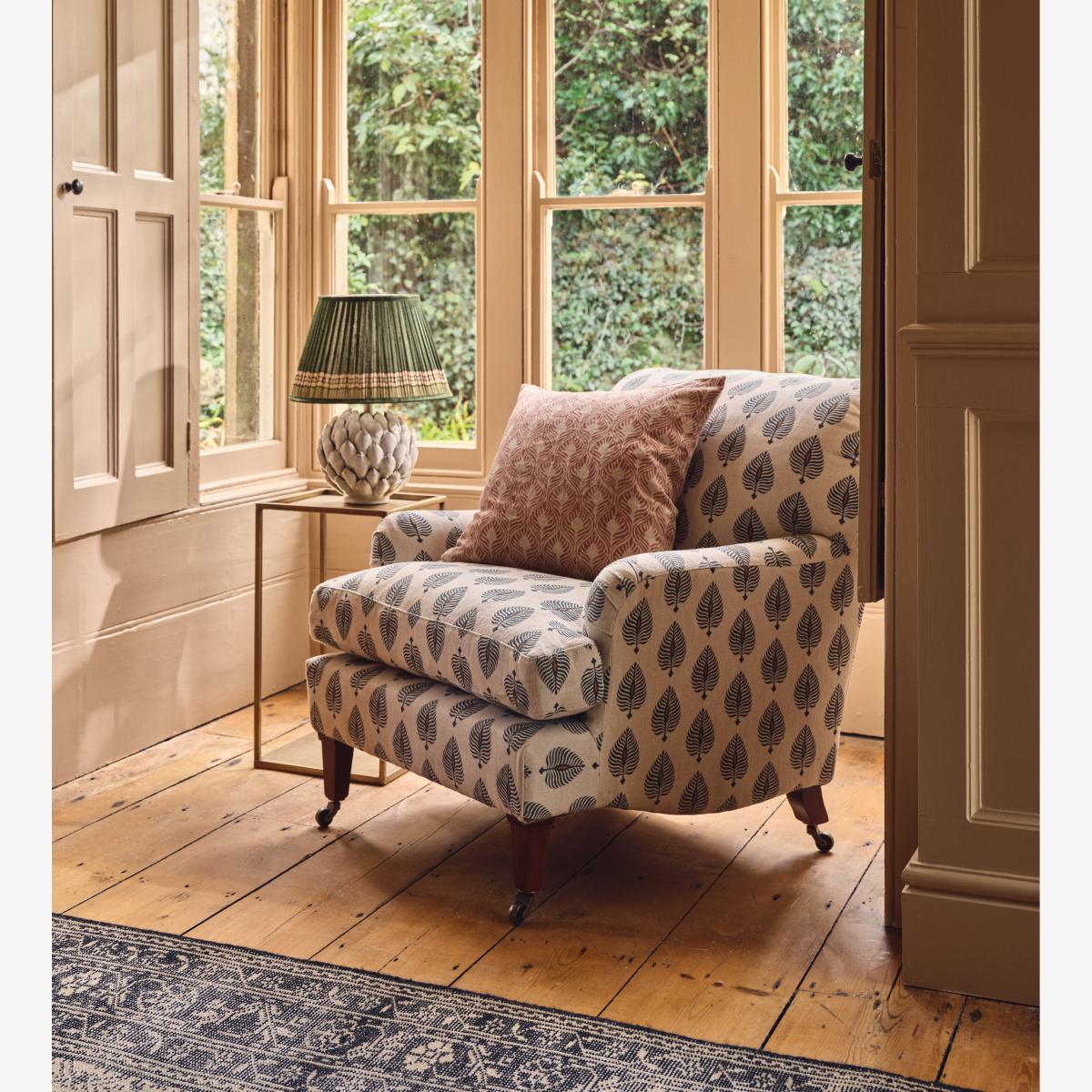 An early 20th century-style velvet armchair in a traditional English design, with rounded arms and four antique-style brass-coloured castors on Espresso-coloured stained birch wood legs. Comfort is very important to us, and it is delivered in abundance via the sprung back and the seat, which features traditional coil springs. Our much-loved peacock-inspired Ocellus Print has been printed onto the neutral stone-washed linen to lend it a striking appearance.