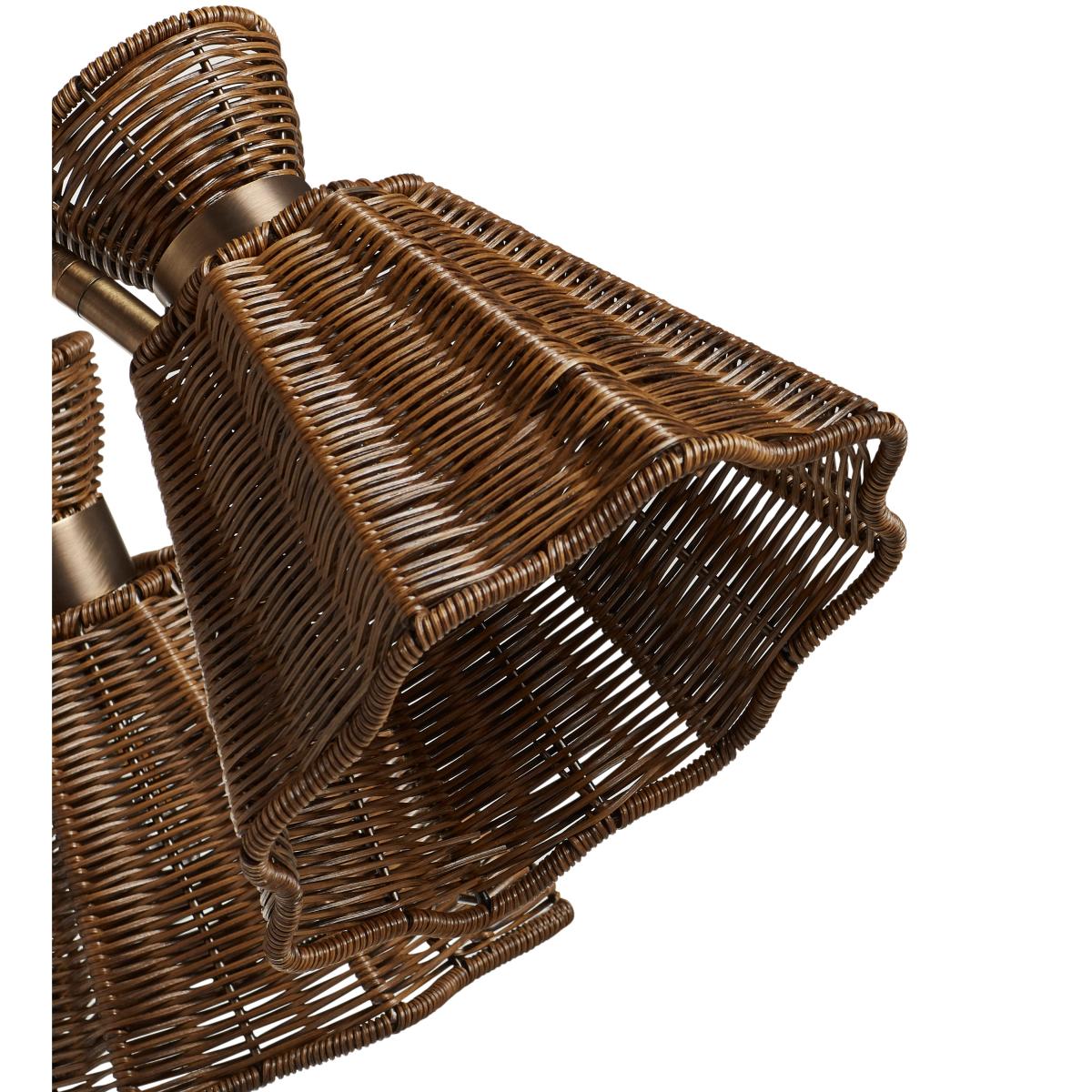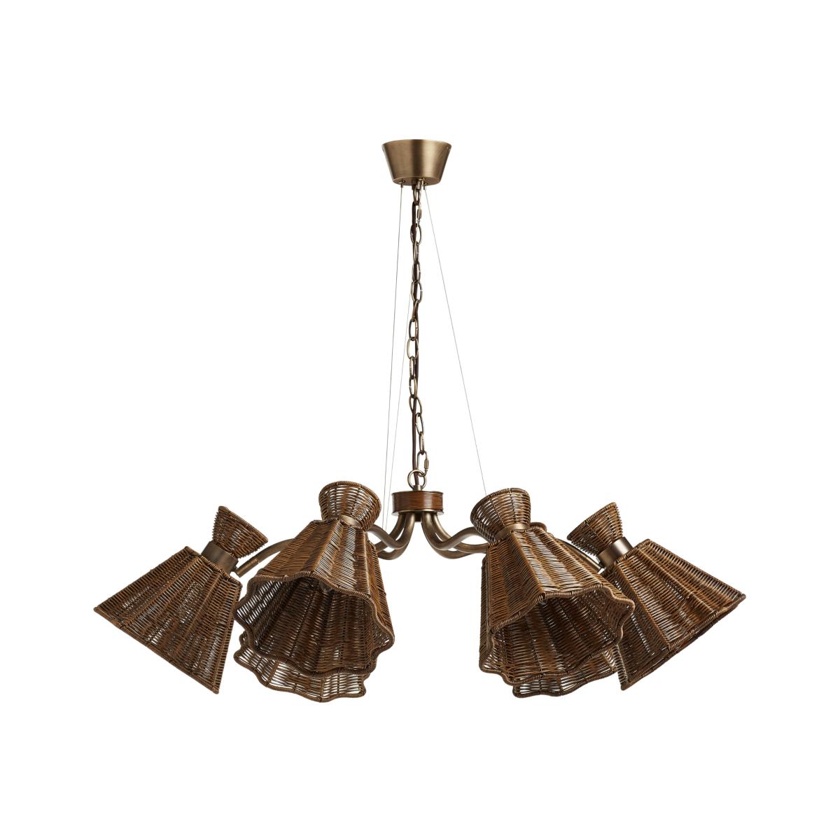 The Concho Chandelier is a striking piece consisting of six softly scalloped shades crafted from handwoven faux rattan. Each strand of faux rattan has been meticulously dyed to emulate the gradients found in natural rattan. The shades are adjustable to allow you to angle the light flow, and are supported by six metal arms finished in antique brass tones that flow outwards from a faux rattan-wrapped stem. An antique brass chain supports the structure with a matching ceiling rose and an adjustable drop height so you can position the Chandelier in the perfect place for your chosen room.