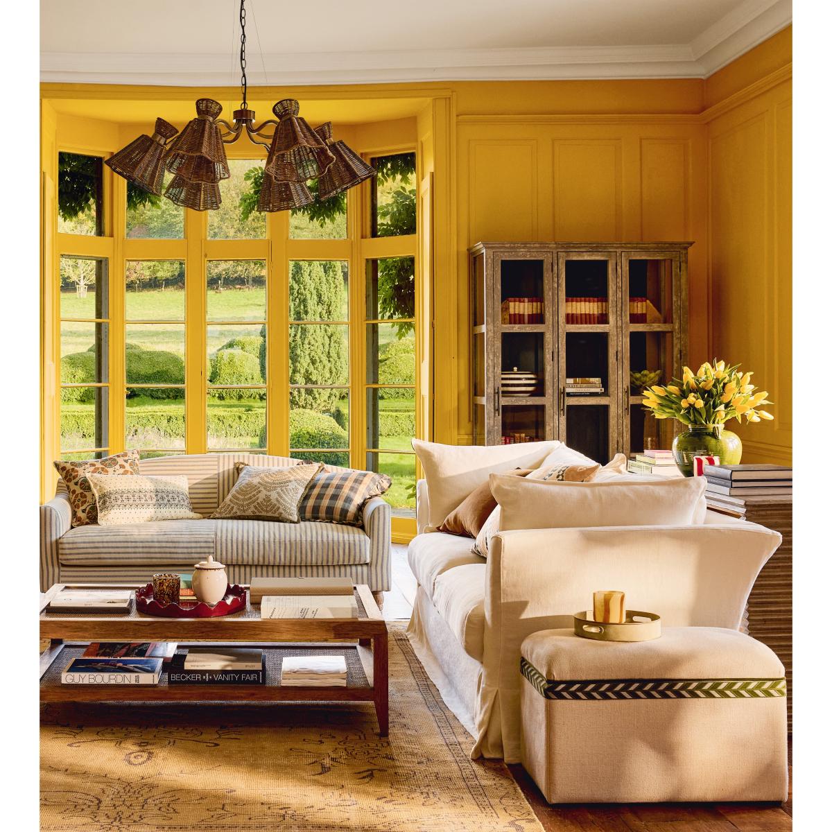 The Concho Chandelier is a striking piece consisting of six softly scalloped shades crafted from handwoven faux rattan. Each strand of faux rattan has been meticulously dyed to emulate the gradients found in natural rattan. The shades are adjustable to allow you to angle the light flow, and are supported by six metal arms finished in antique brass tones that flow outwards from a faux rattan-wrapped stem. An antique brass chain supports the structure with a matching ceiling rose and an adjustable drop height so you can position the Chandelier in the perfect place for your chosen room.