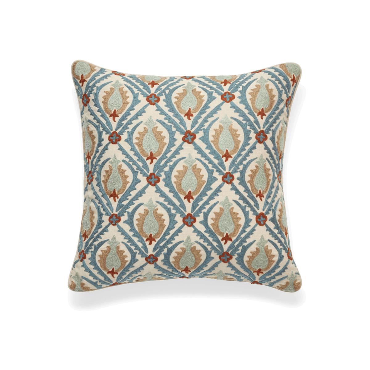 I love this cushion because it adds a vibrant yet sophisticated touch with its rich embroidery and bold colour palette. The mix of dirty orange and blue makes it versatile for both contemporary and traditional interiors, especially those with a relaxed or eclectic aesthetic. It works well paired with neutral-toned sofas or armchairs, creating a pop of colour without overwhelming the space. Practical styling tips include layering it with plainer cushions for added texture, or using it as a statement piece on a neutral bedspread or lounge chair. Its linen/cotton blend also ensures durability and a tactile softness, making it perfect for everyday use.
