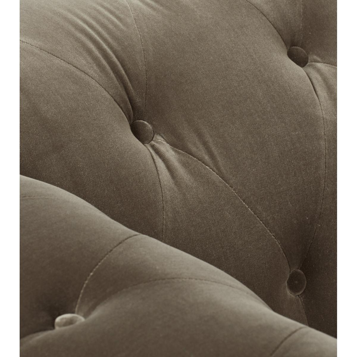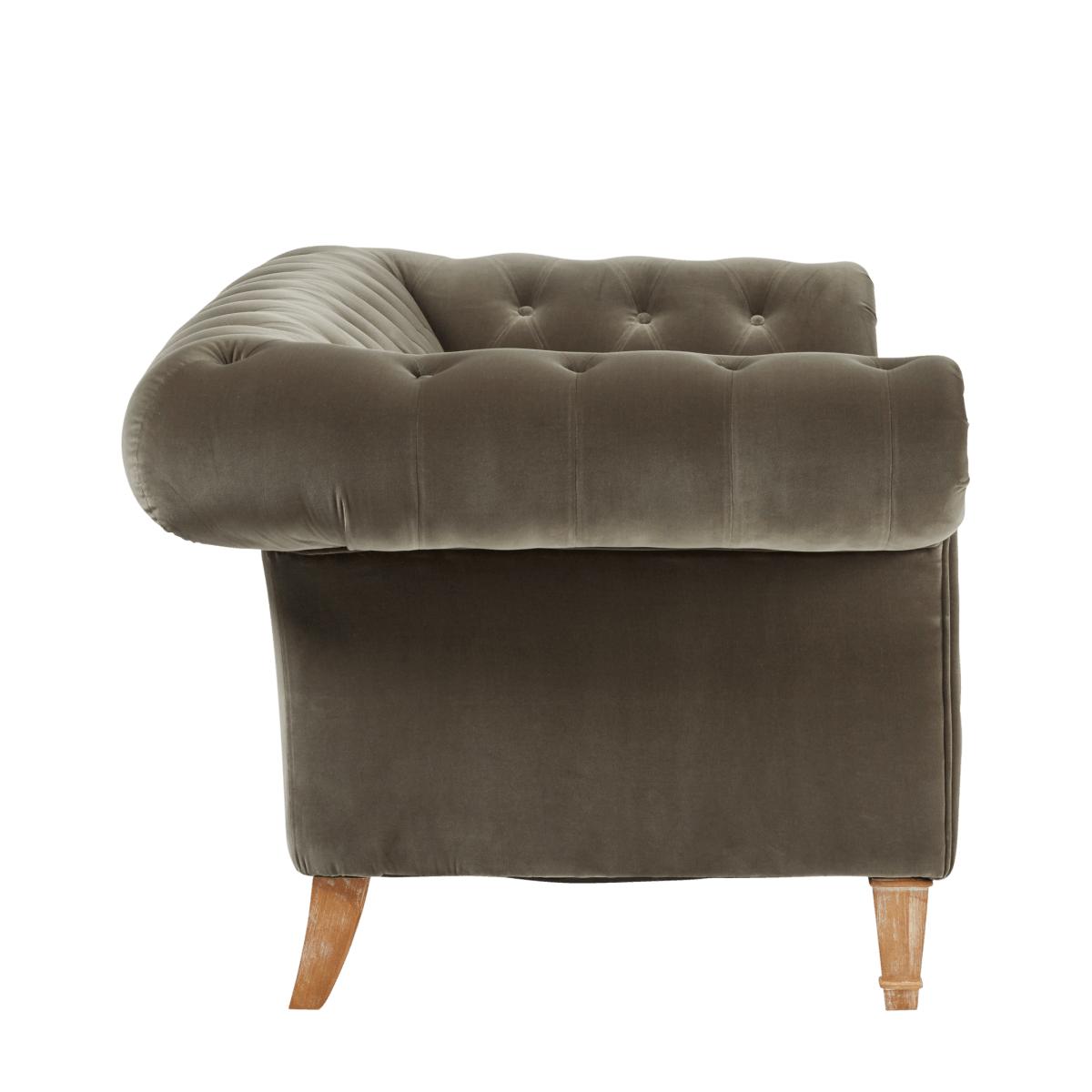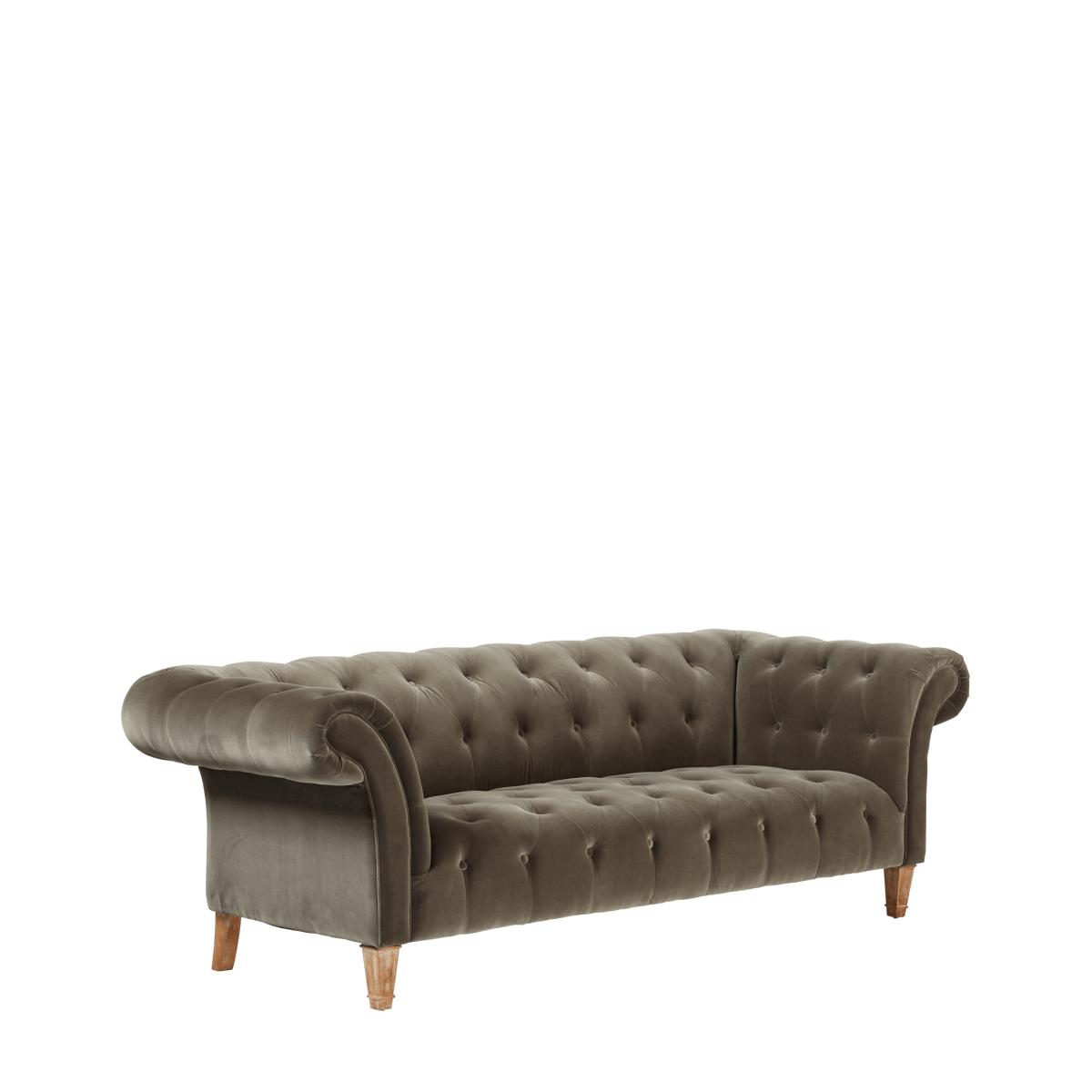 The scrolled arms and low back of the Cresselly 3-Seater Sofa puts a subtle twist on the classic Victorian Chesterfield design. Featuring sumptuous taupe buttoned-velvet upholstery, as well as hand-painted distressed wooden legs, this sofa's smart style is ideal for period sitting rooms. That said, it looks sophisticated at the centre of contemporary schemes too.