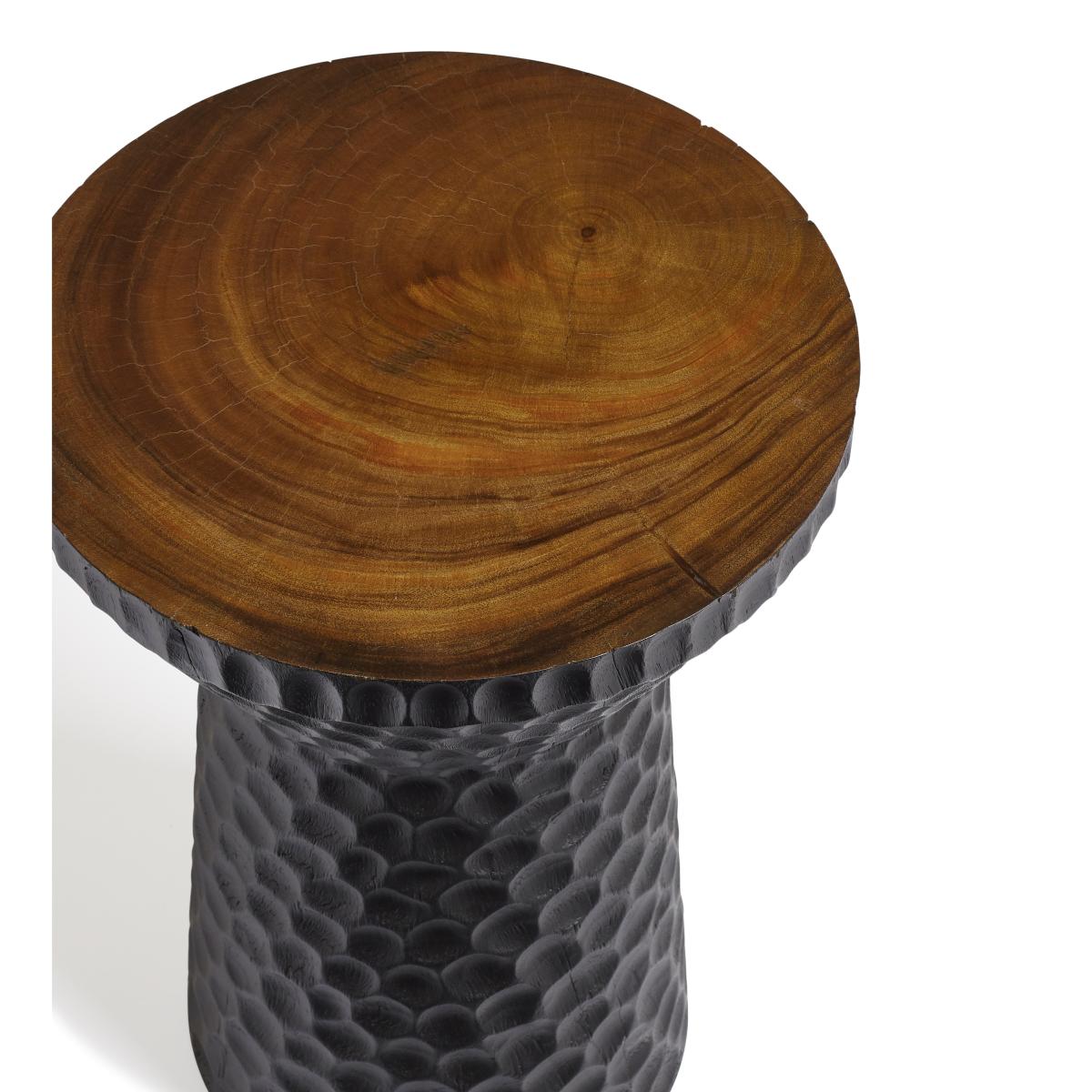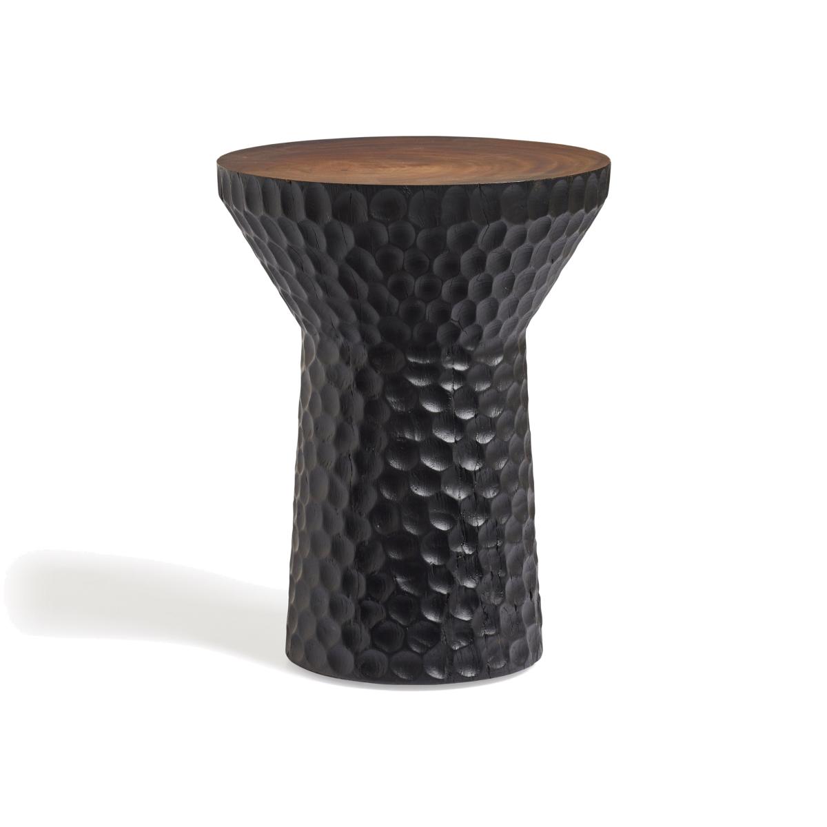 The design of our Cullen Side Table is unique; made from a solid piece of wood, the drum-shaped sides are hand chipped and carved for the hammered effect, before being painted black for a striking finish. Its top is left natural and polished to admire the grain and warm tones of the wood. Due to the natural material and artisanal finishing techniques used, each piece will have individual characteristics that add to their charm.