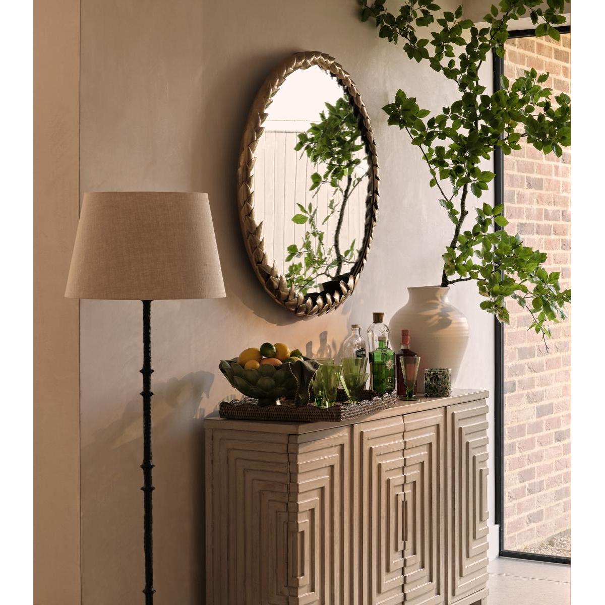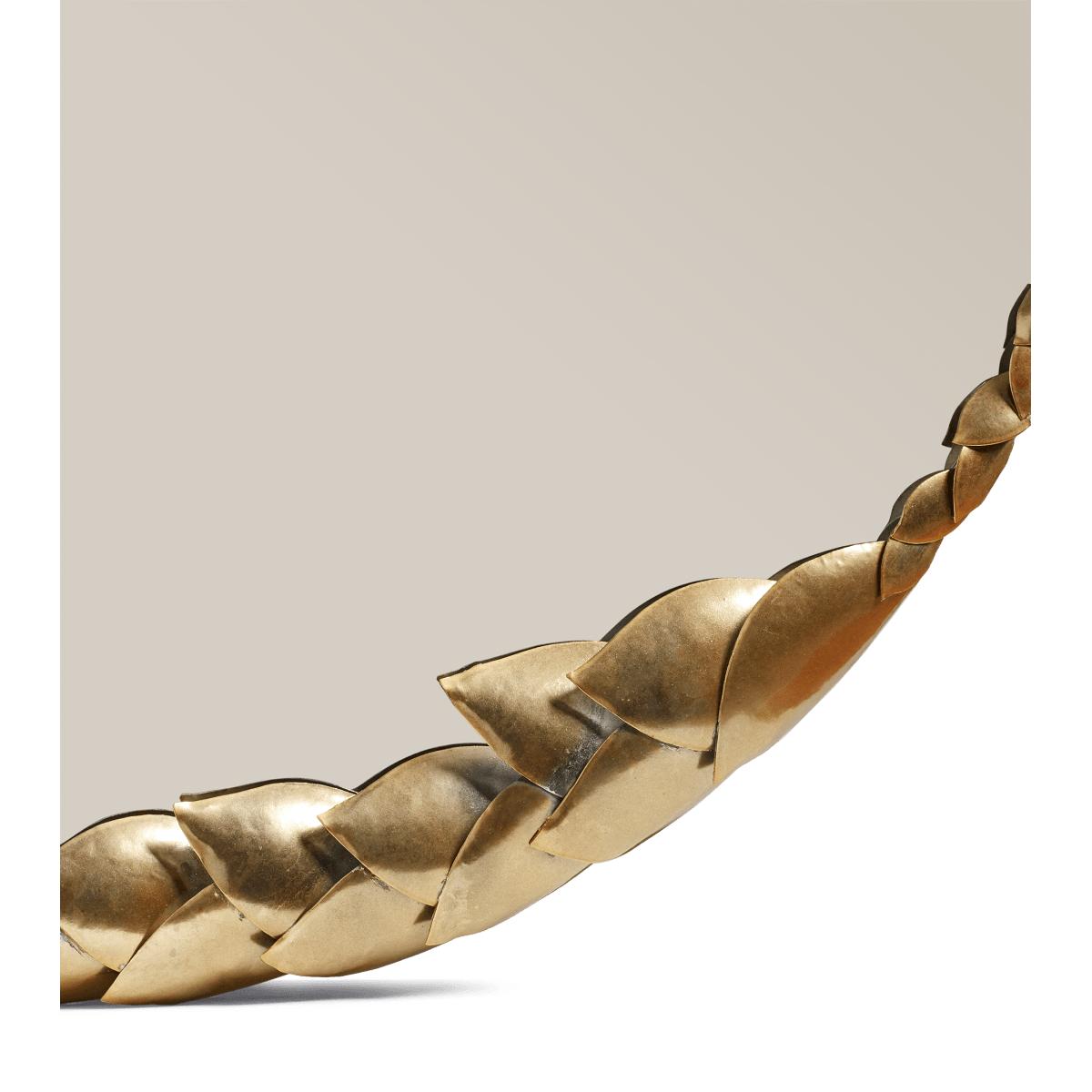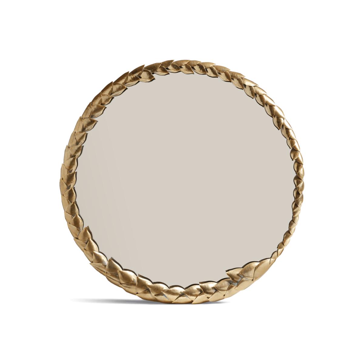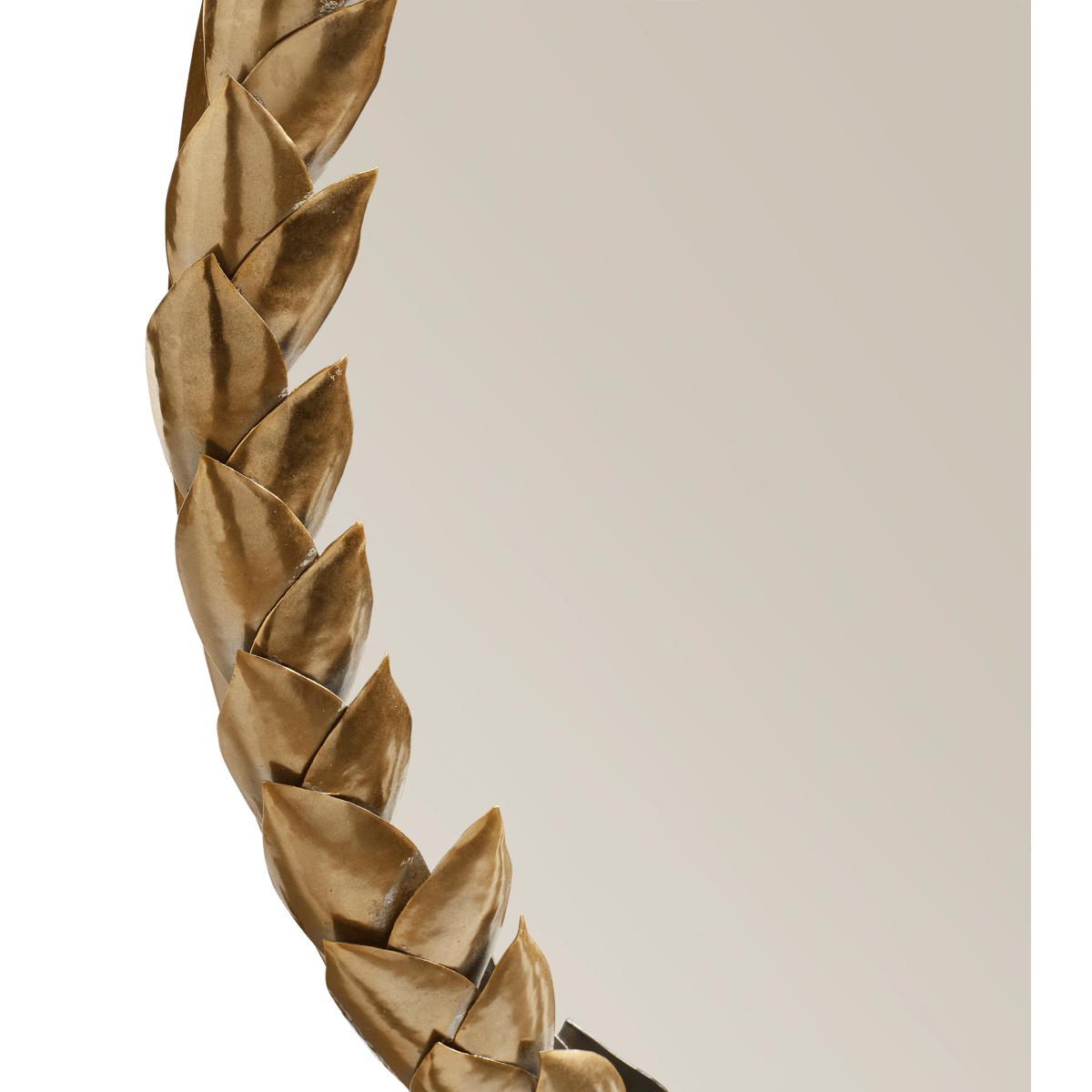 Our Daphne Mirror is a circular piece framed with metal leaves that wrap around its edges like a laurel wreath. The leaves diminish in size creating a lovely sense of depth to the piece.