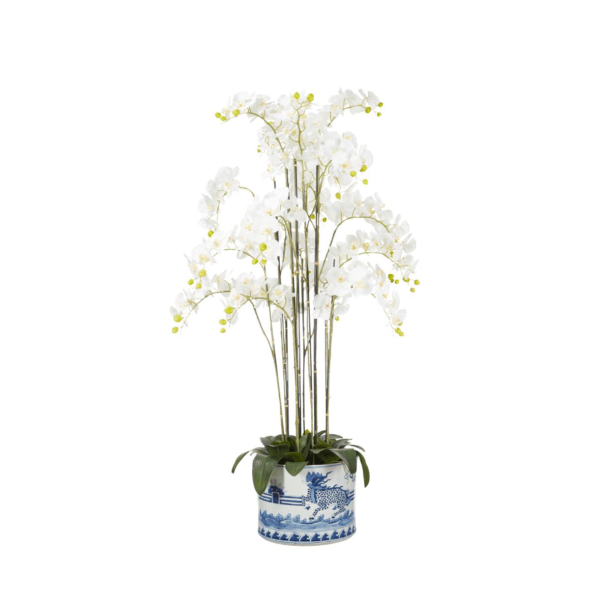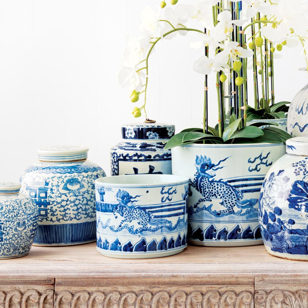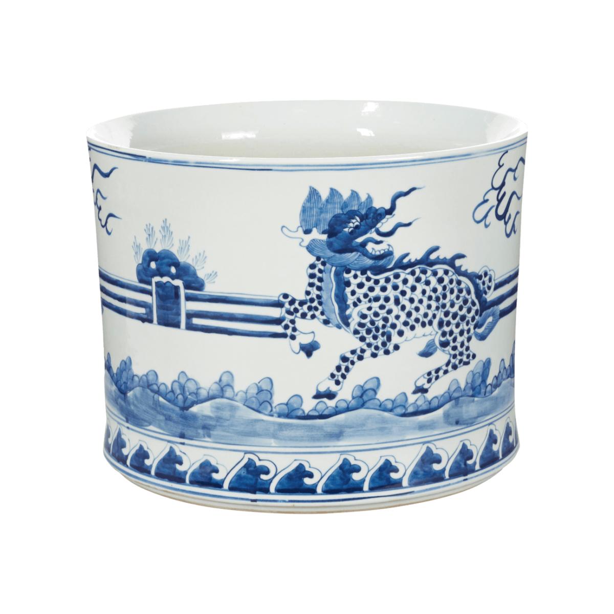 Decorated with traditional Chinese motifs, including a spotted Chinese lion, this large blue-and-white porcelain planter is ideal for holding some of our faux flowers. Handmade in the city of Jingdezhen, which has been producing innovative porcelain craftwork for more than 1,000 years, this hand-painted design is available in three sizes. The elaborate piece also makes an excellent gift.