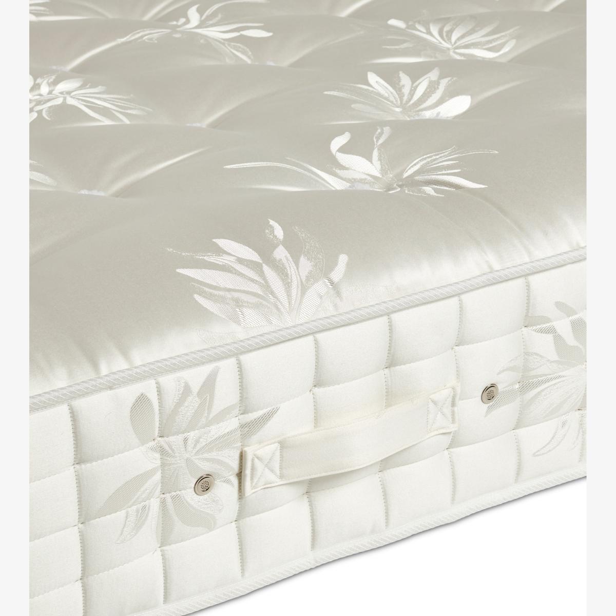 Indulge in ultimate comfort and upgrade your divan bed with our king size deluxe mattress. This thick, premium pocket sprung medium mattress comes upholstered in luxurious white damask fabric with a hand-stitched border. Each spring is painstakingly hand-sewn into its own calico pocket then hand-nested into a honeycomb pattern, allowing it to move independently and distribute weight evenly for ultimate support. Our king size deluxe mattress features a very high spring count (approximately 2,000 springs) and is made of high quality, natural and breathable fibres - layers of wool, horsehair and cotton, topped with rebound wool cotton and a bamboo pad - all of which will ensure an excellent night's sleep. All our divan beds are made by a family firm in Yorkshire with over 30 years of bed-making experience. To keep your mattress in premium condition, rotate the mattress 180 ° after 3-4 weeks so the head becomes the foot, then 3-4 weeks later, flip the mattress so the bottom becomes the top. Repeat this cycle every 3-4 weeks.