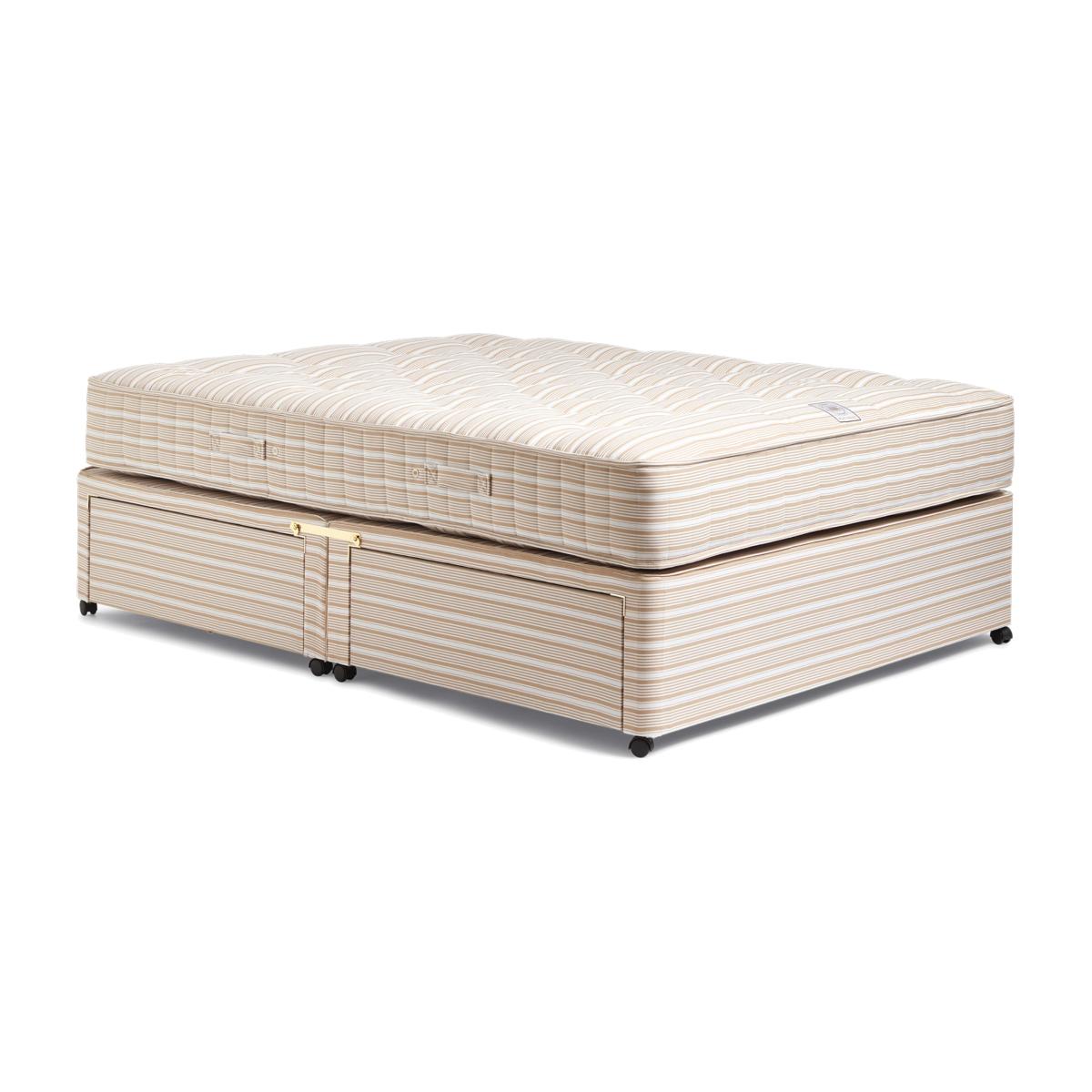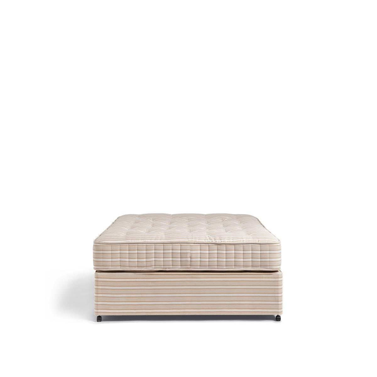 Our platform top standard divan base is ideal for those who like their bed to be a little bit firmer. Using time-honoured techniques, the wooden framed base is crafted from traceable timber, then padded and upholstered in 100% cotton ticking. The double standard divan bed base with drawers features four drawers for extra storage and comes on castors for effortless manoeuvring. Mattress sold separately; pair with our standard double mattress or upgrade to the deluxe double mattress for ultimate comfort.
