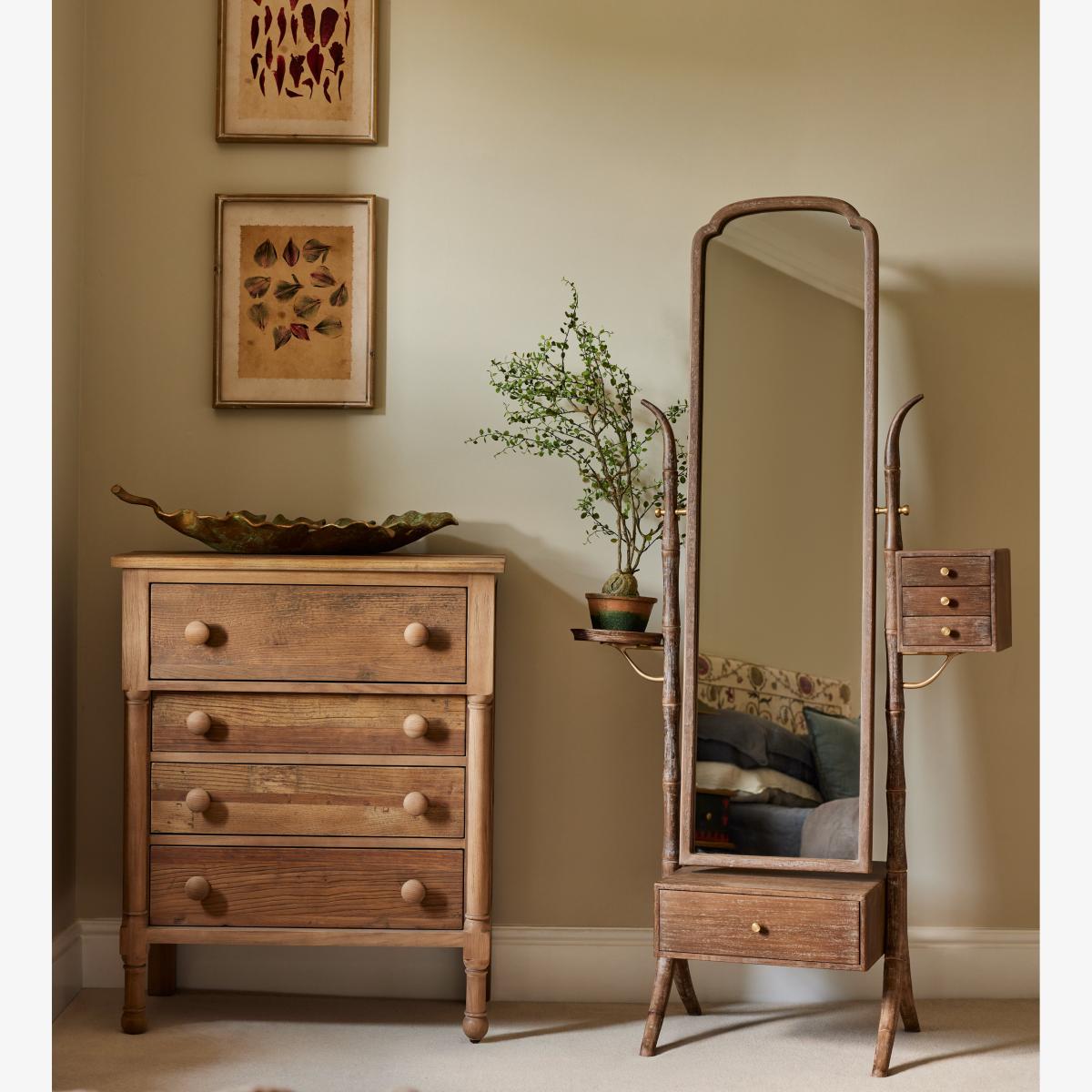 I love this piece for its clean, natural aesthetic and eco-friendly materials-recycled elm gives it a warm, textured look that works beautifully in both traditional and contemporary interiors. It’s versatile enough to sit in a bedroom as a practical storage solution or in a hallway for organising essentials, thanks to its spacious drawers. Styling tips include pairing it with natural fibres or organic textiles for a cohesive look, or contrasting it with modern metal accents for a more updated feel. Placed alongside other vintage or rustic pieces, it can help create a calm, timeless atmosphere. Its neutral finish makes it easy to incorporate into various colour schemes, making it a reliable yet stylish addition to many spaces.