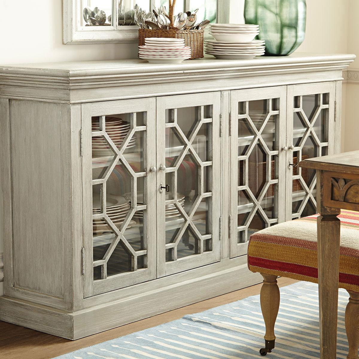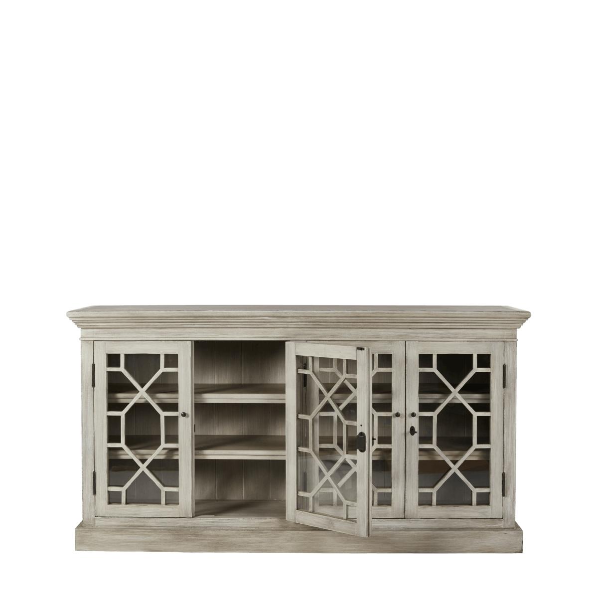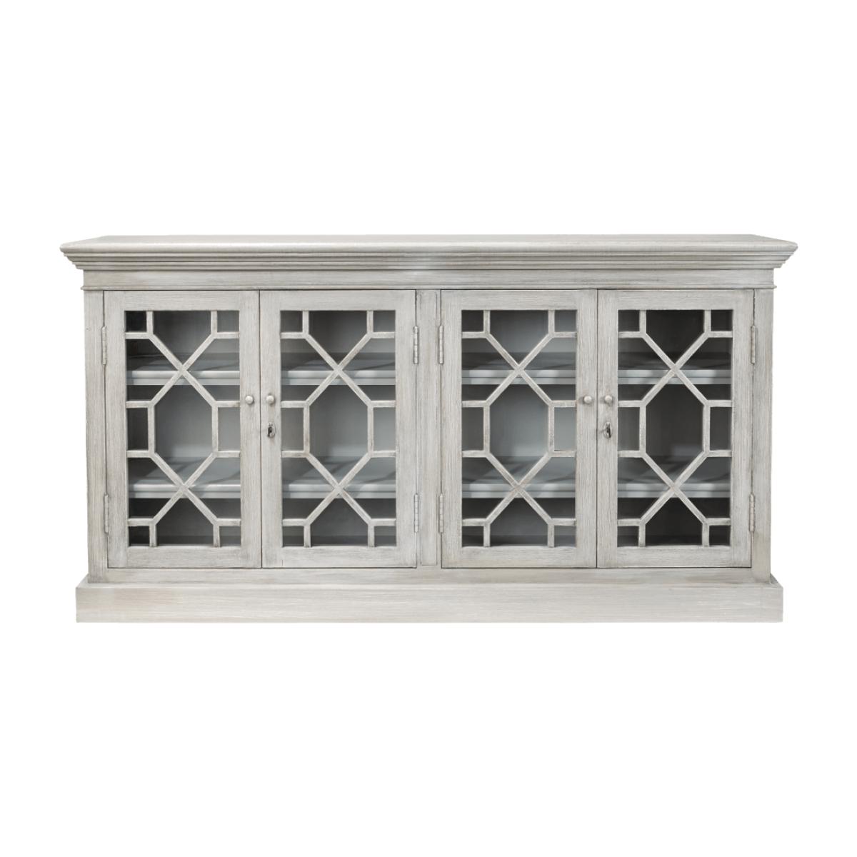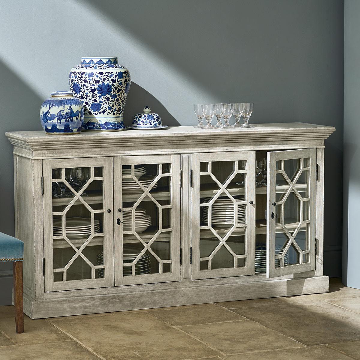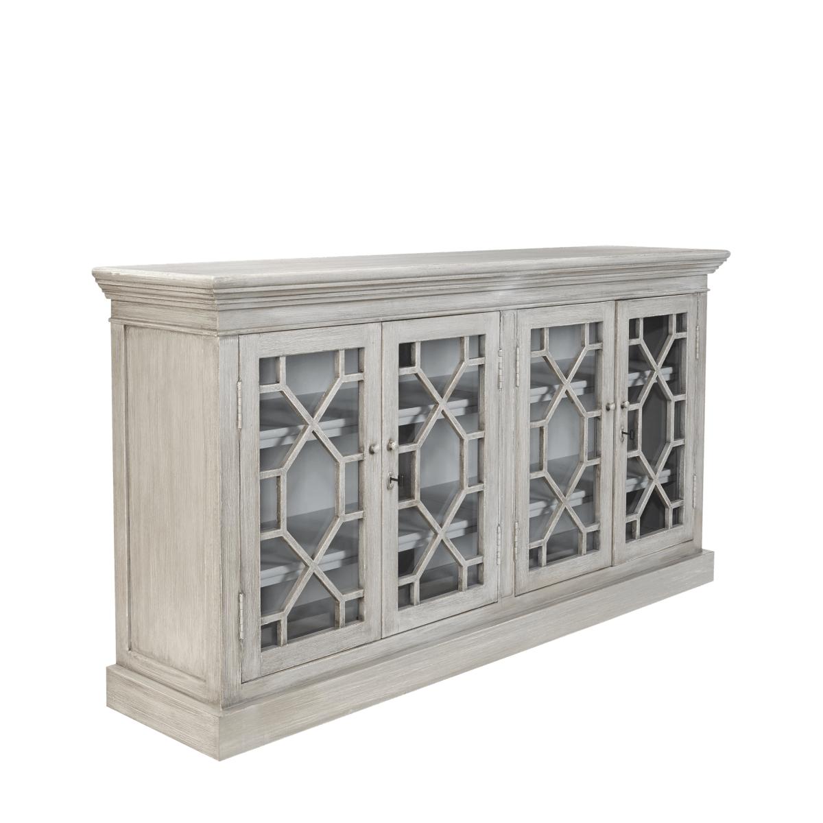 A stylish and useful sideboard featuring four adjustable shelves and glass fronted (lockable) doors, decorated with a geometric pattern. Painted to a dragged, Flannel Grey finish, our Drummond Sideboard would be the perfect home for all your dining accoutrements, or for hiding away your collection of DVDs. Please note that this sideboard comes with antiqued brass handles, locks and escutcheons, not the painted ones illustrated here.