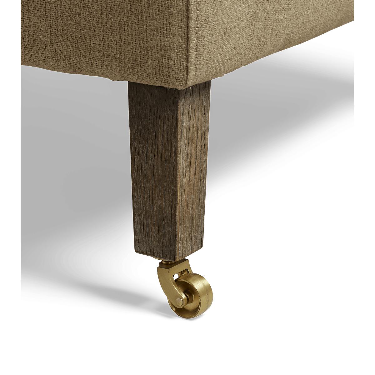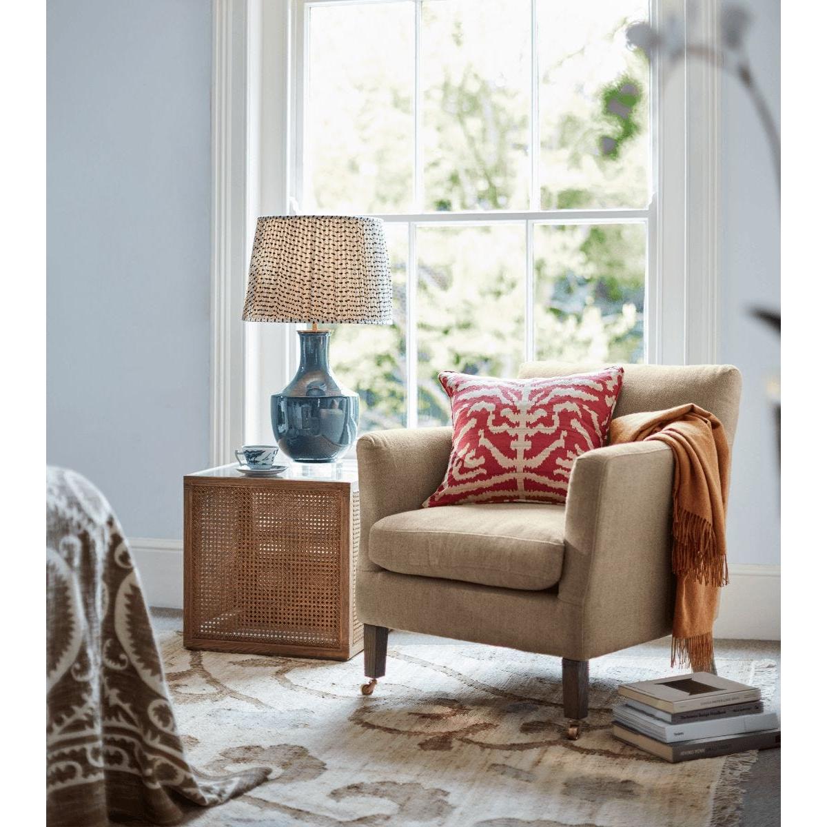 I’m a fan of this wide-herringbone linen armchair for its neat silhouette and warm, neutral tone - it slips easily into both modern and more traditional schemes. It works well against pale walls or alongside oak-toned furniture, and the brass castors add a subtle nod to detail. To style, layer a textured wool throw over one arm, pop on a contrasting cushion in soft earthy hues, and pair with a slim side table and ceramic lamp for a relaxed reading corner.