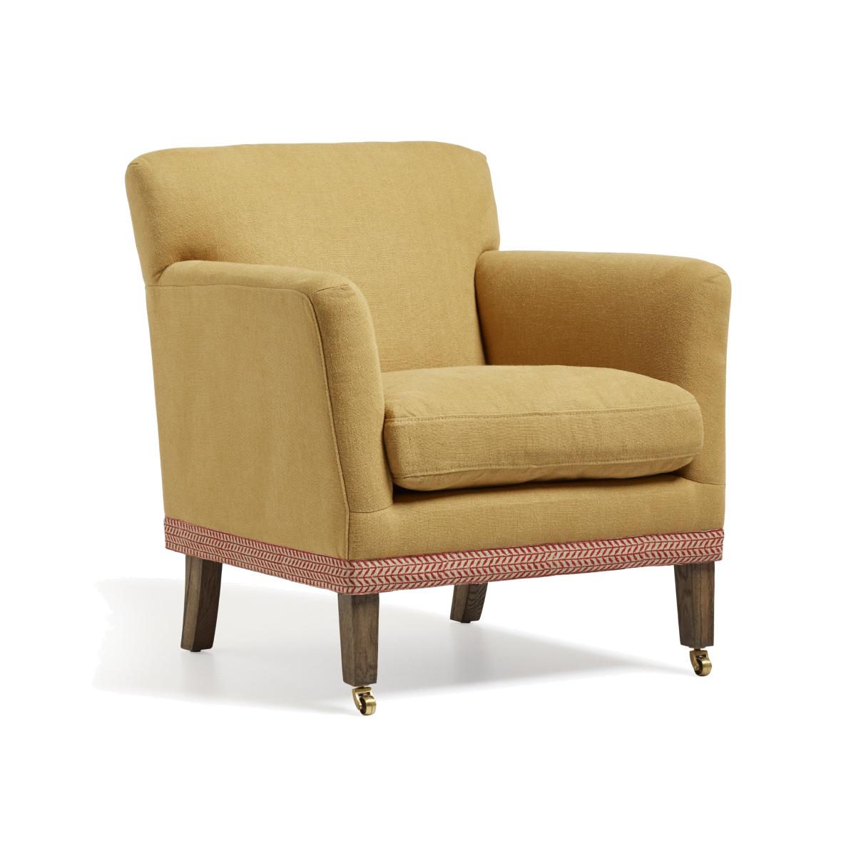 Classic lines, a sturdy construction and an invitingly plump seat: the Ellary Armchair has it all. Sitting low to the ground, this handmade sitting room essential cuts a commanding figure, with its square back and arms. Brass castors on the front legs make it easy to move, so you can find your perfect spot before sinking into it to lose yourself in your latest captivating read. This version is upholstered in an earthy Dijon yellow linen. Due to the artisanal techniques used, each piece will show individual characteristics.
