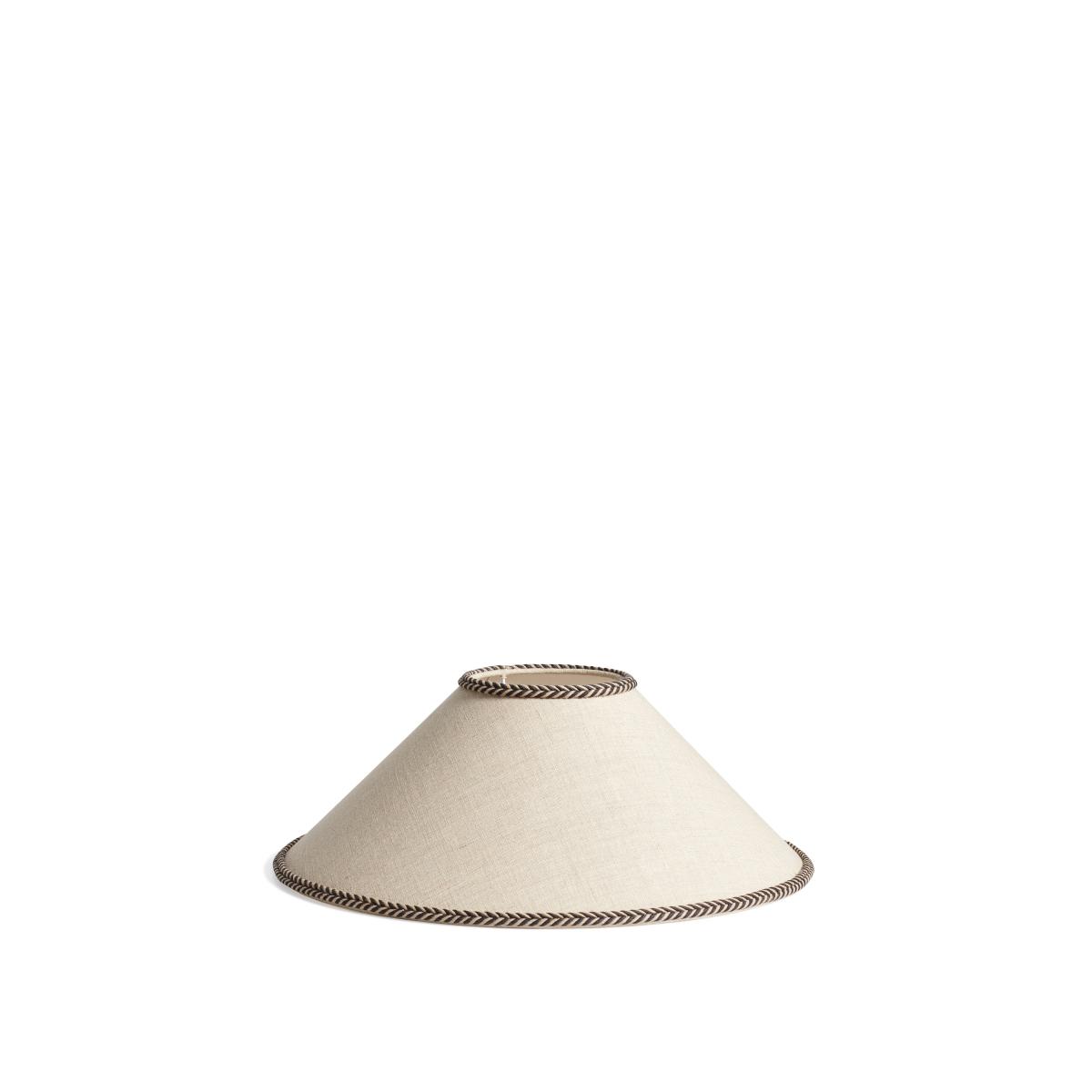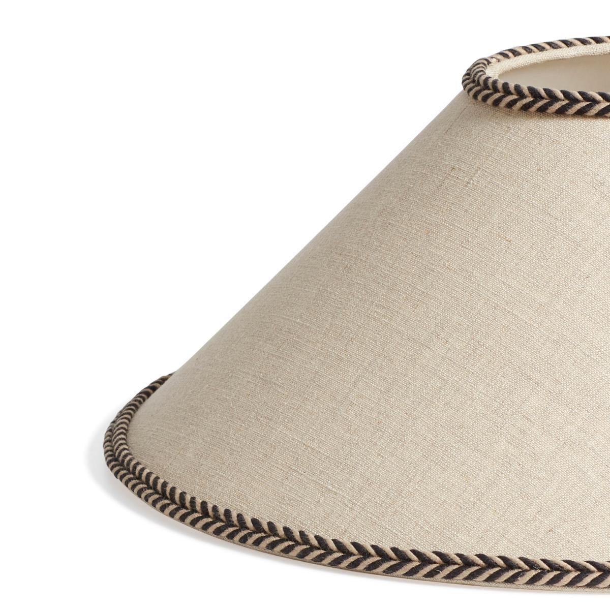 Our Elowen has the typical dramatically slanting sides of coolie lampshades. The fine linen is wrapped around an iron frame that's crafted by hand and finished with a black and natural plaited linen trim.