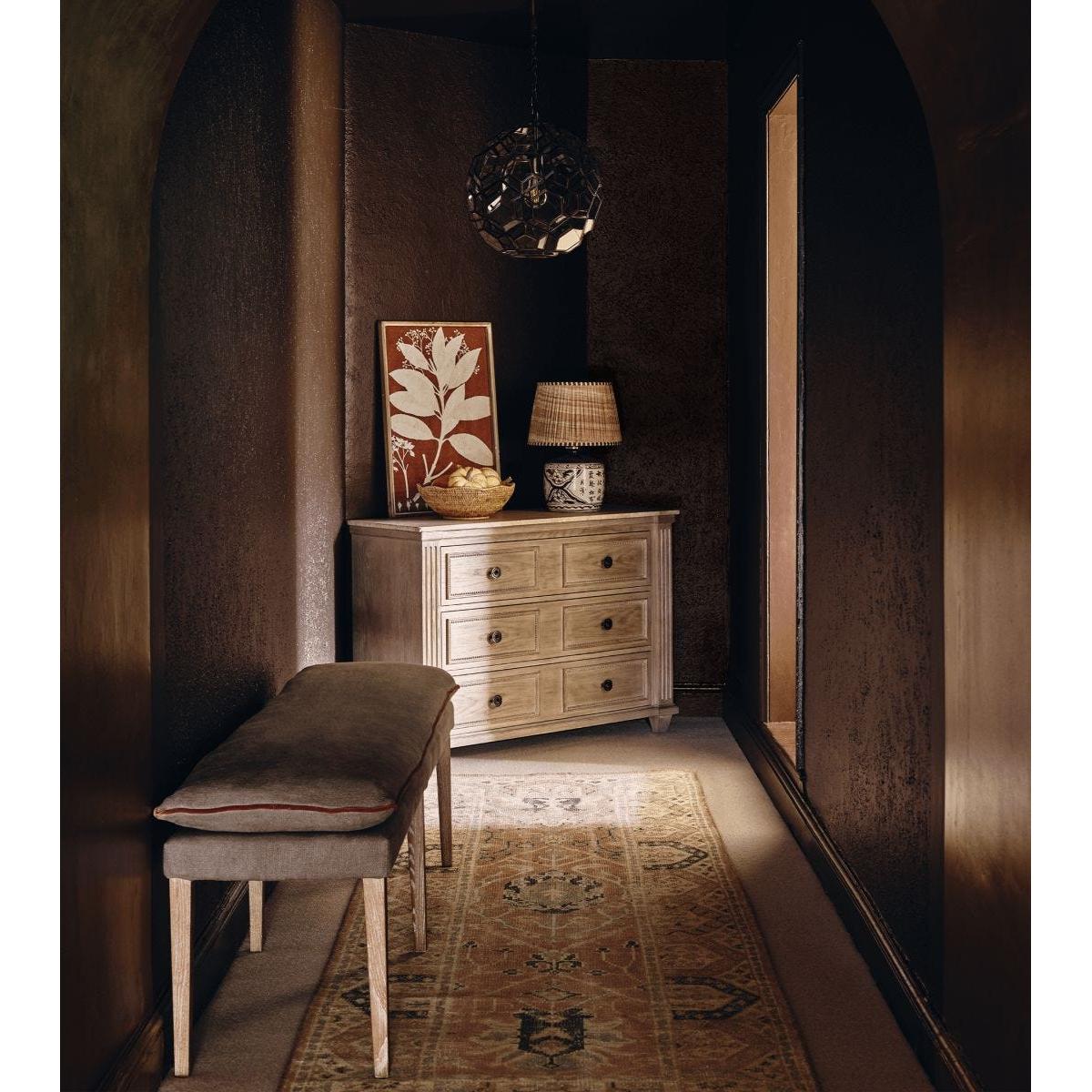 I love this runner because of its soft, washed rose hue and subtle floral pattern, making it a versatile piece that can effortlessly complement both traditional and contemporary interiors. It works particularly well in a farmhouse or cottage-style setting, adding a touch of warmth and charm, but it's also subtle enough to elevate a minimalist space. Practical styling tips include layering it with contrasting textiles like linen or velvet for added texture, or pairing it with neutral or pastel tones to keep the look light and inviting. Given it's made from cotton and wool, it offers durability and comfort underfoot, making it ideal for use in hallways, kitchens, or dining areas where practicality is key.