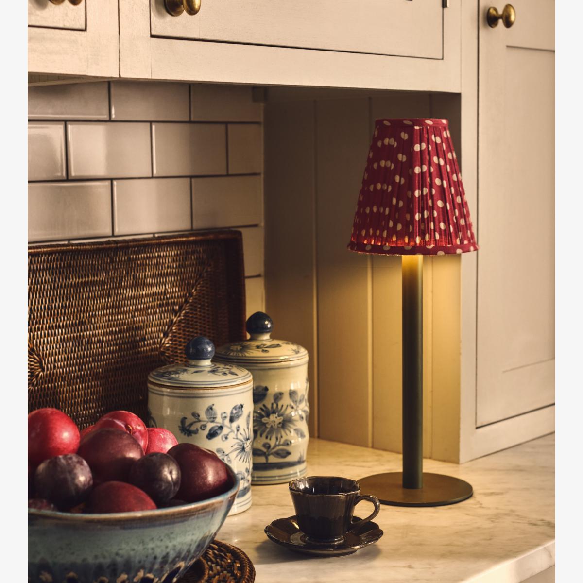 Our cone lampshades are pretty and petite, and this one is all the more so due to its charming spot pattern. Autumnal-inspired Maple Red tones decorate the body of the lined, pleated silk shade, complete with matching piping. Originally designed to pair with our Ziara and Olira Wireless Table Lamps, this cone shade would work equally well sat atop other petite lamps in your collection and is especially well suited to wall lamps.