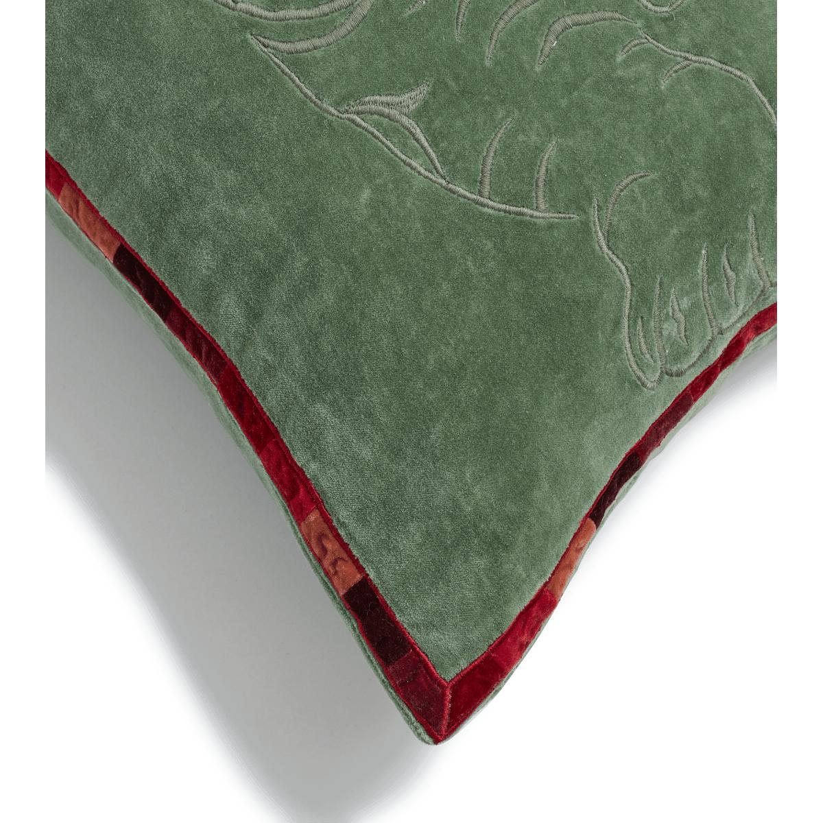 Glowing, golden tiger eyes gaze out from the subtle embroidery of our Famba Tiger Cushion Cover. Its design is first traced onto the soft, sage-green velvet, before being embroidered, then framed by a trim in stripes of complementary reds and oranges.