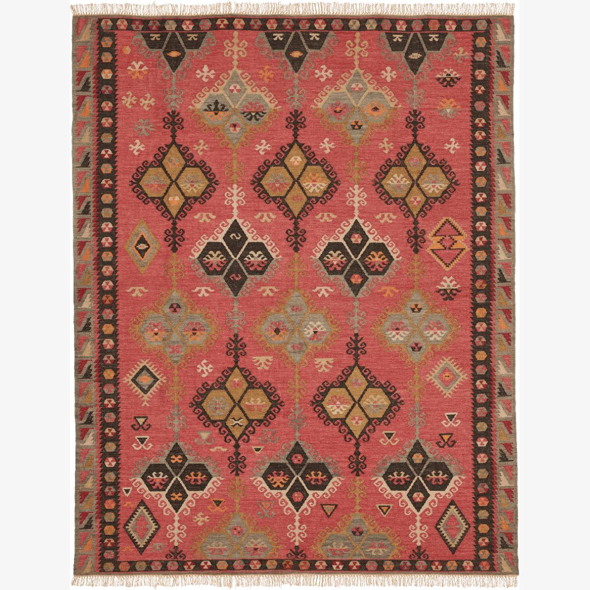 The vivid and colourful design of our Farva Rug is handwoven on an authentic and traditional Kilim loom, just like the designs that have inspired it. It features rich reds, pale blues and bright golds in bold motifs that are framed by a geometric border and a neutral fringe. The origins of kilims range from Balkan regions through to Northern Africa, which is what makes them complementary to so many design styles. They have been used for millennia to bring warmth, decoration and communication through their colourful symbolic motifs. Kilims differ from knotted rugs as they are interwoven from variously coloured wefts (horizontal yarns) and warps (vertical yarns) to create a flatwoven tapestry rug with no pile. They often have stepped, diagonal patterns which are formed through their distinct weaving technique in which the yarn turns around the warp where the colour changes, rather than running across the full width of the piece.