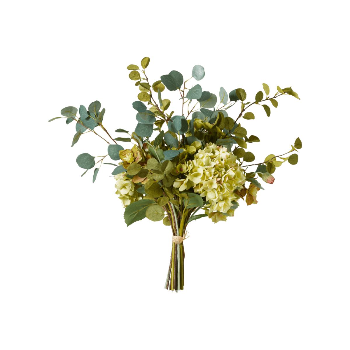 A large bunch of mixed hydrangeas. There’s little that distinguishes this arrangement from real hydrangeas; everything from their serrated leaves to the pale pink and green petals has been carefully developed to look as realistic as possible.